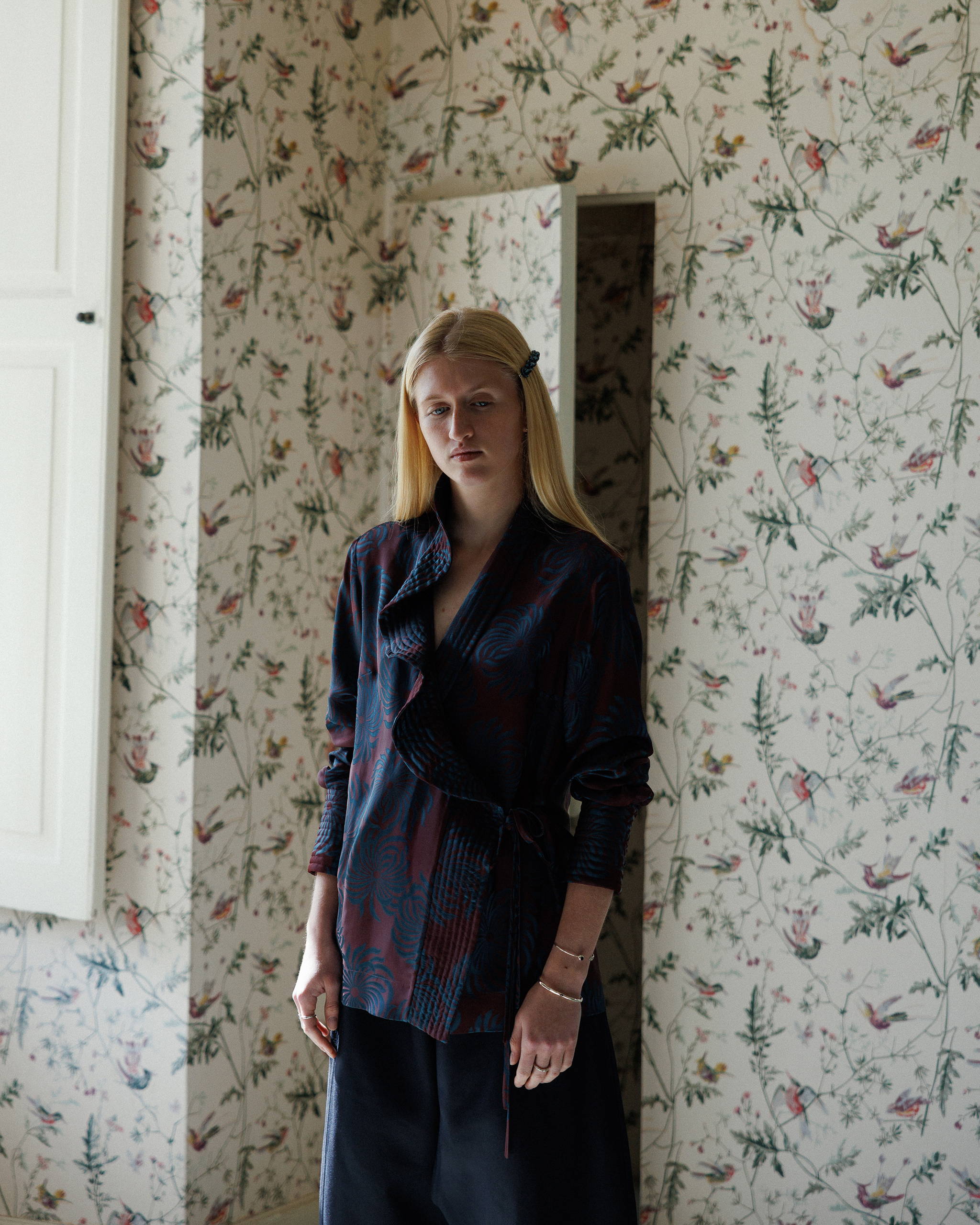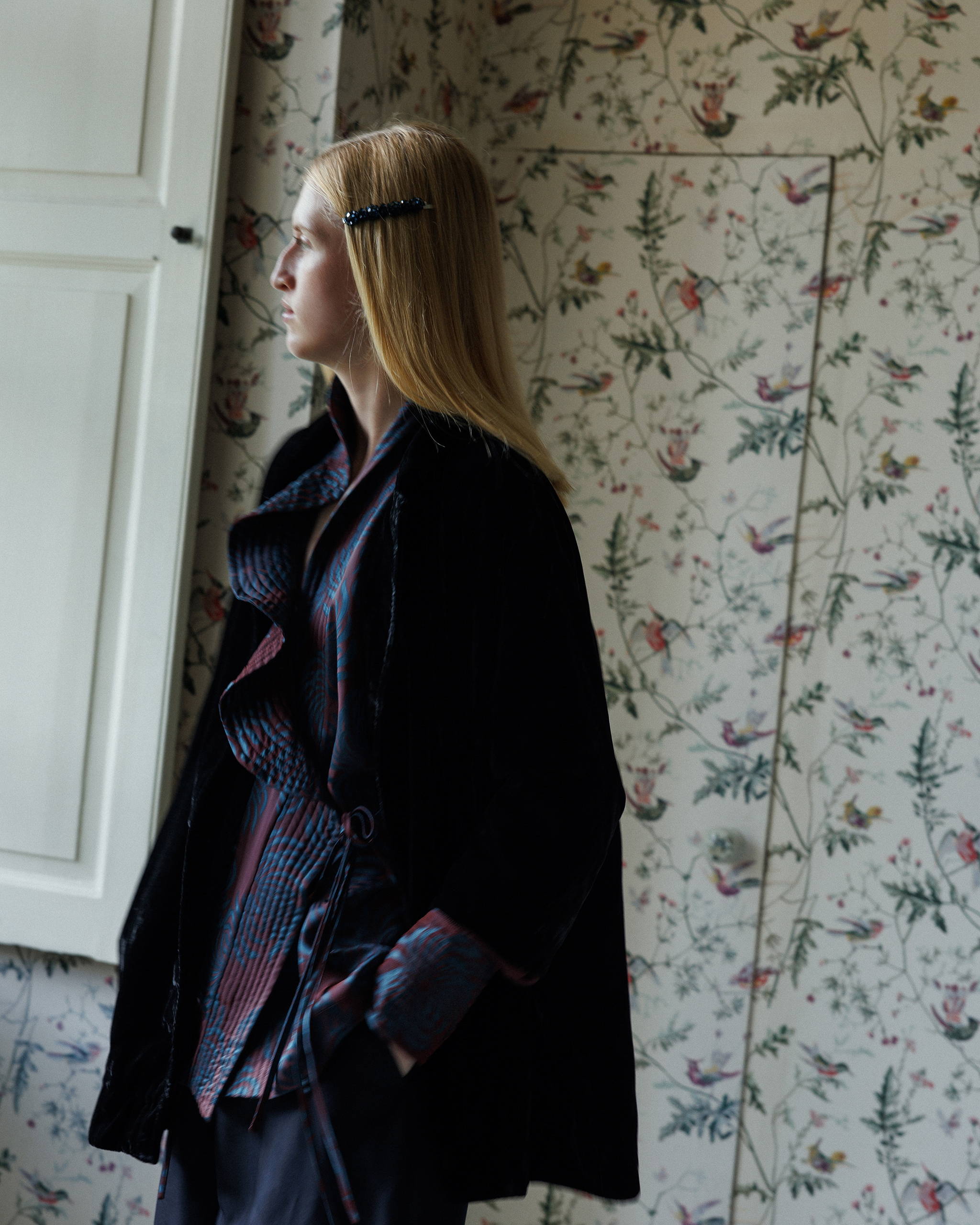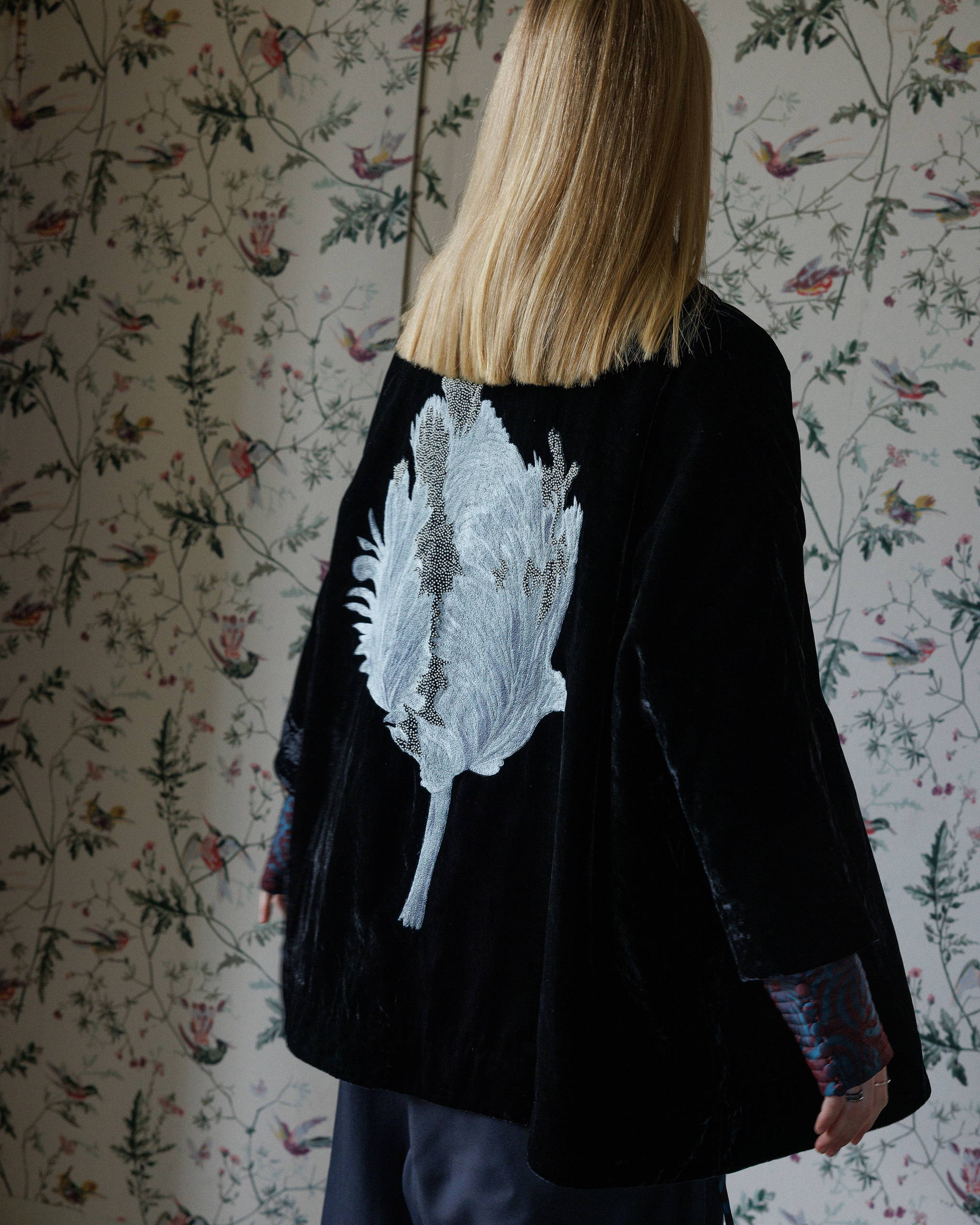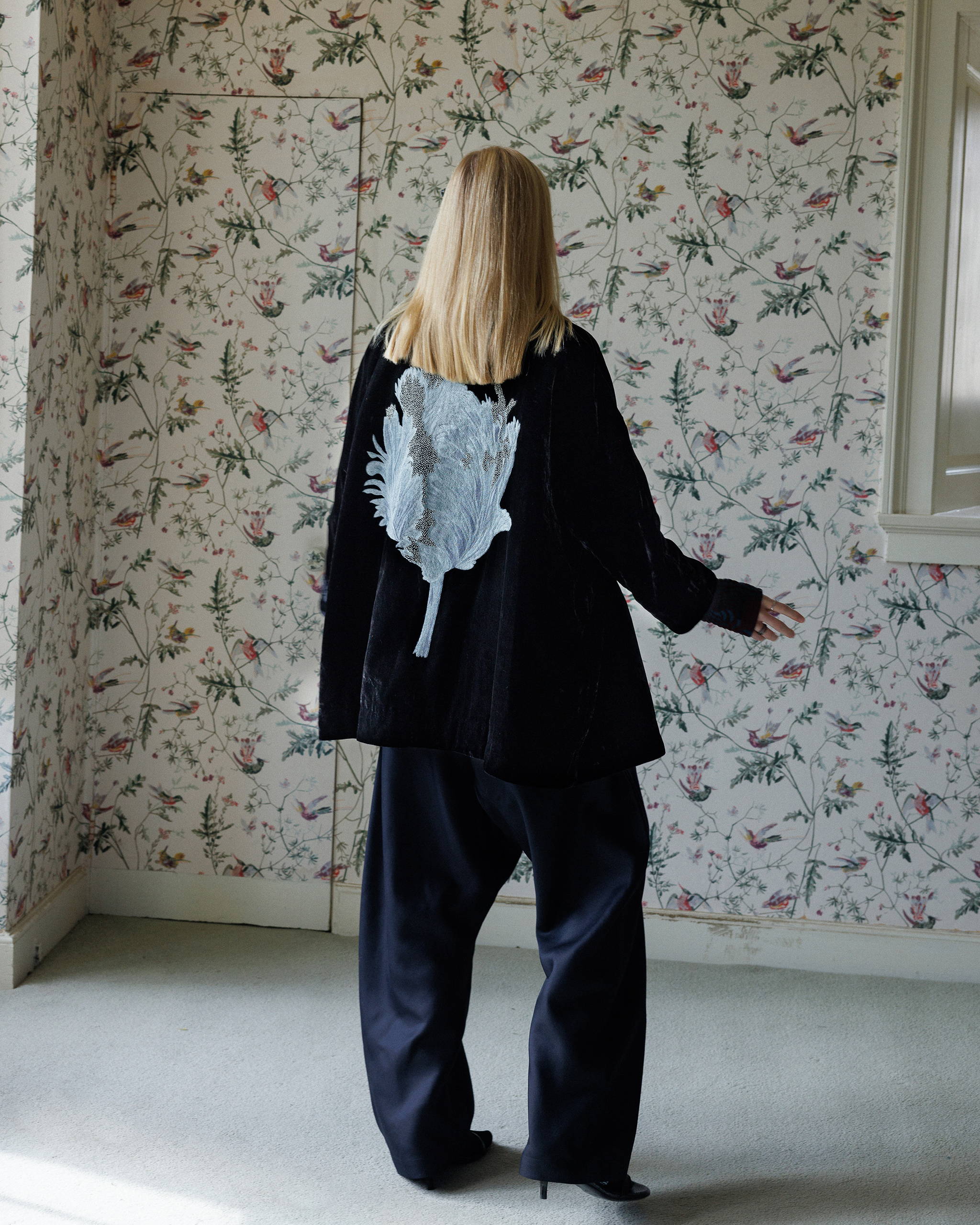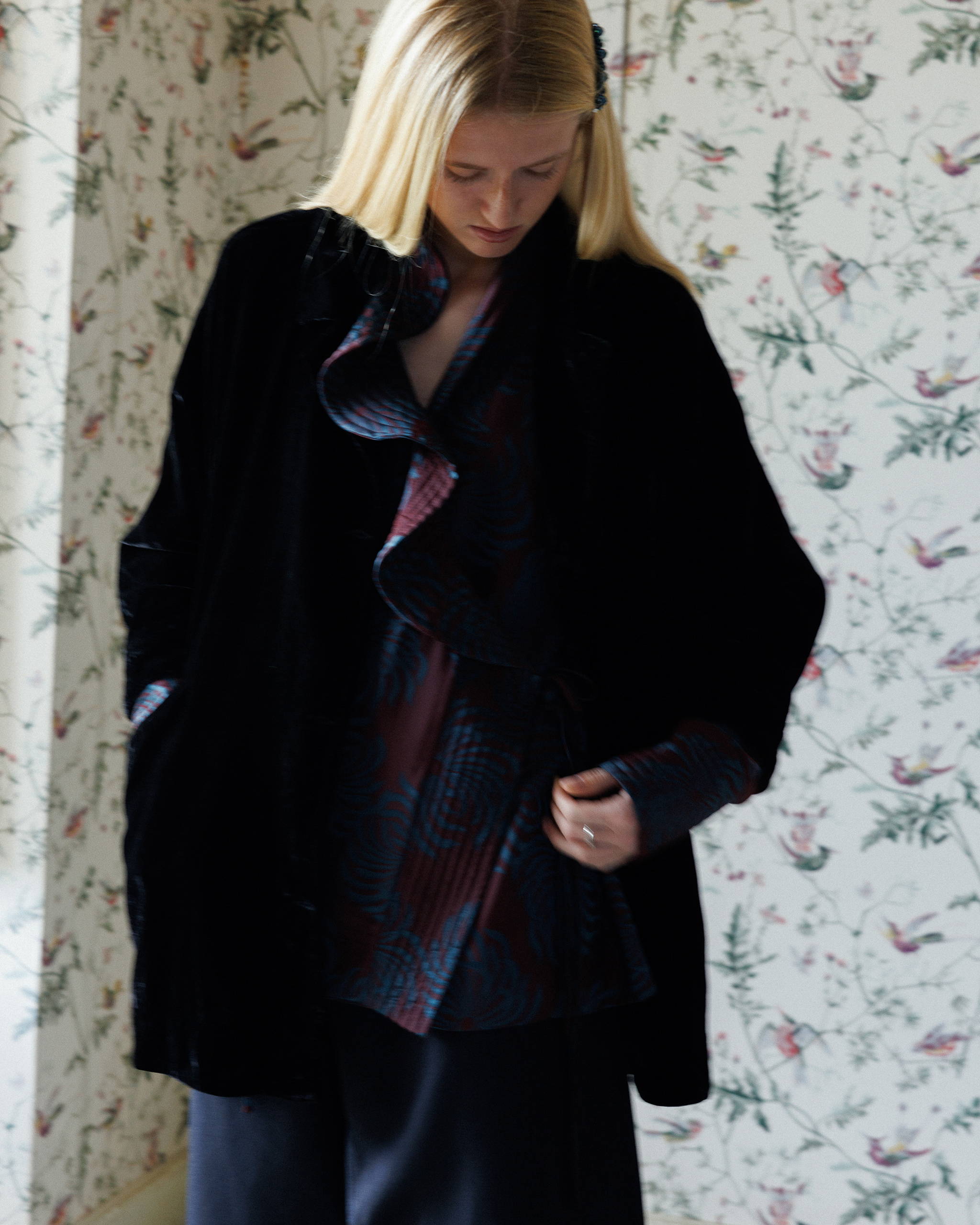 Aodress Bud Embroidered Loose Coat Onyx Velvet, Dries Van Noten Printed Wrap Shirt Burgundy, Sofie D'Hoore Plof Pants Galaxy Twill, Marsèll Sottiletta Heeled Sandal Black, Antipast Mixed Cable Sock Black, Simone Rocha Medium Flower Hair Clip Indigo, Rosa Maria Jewellery.