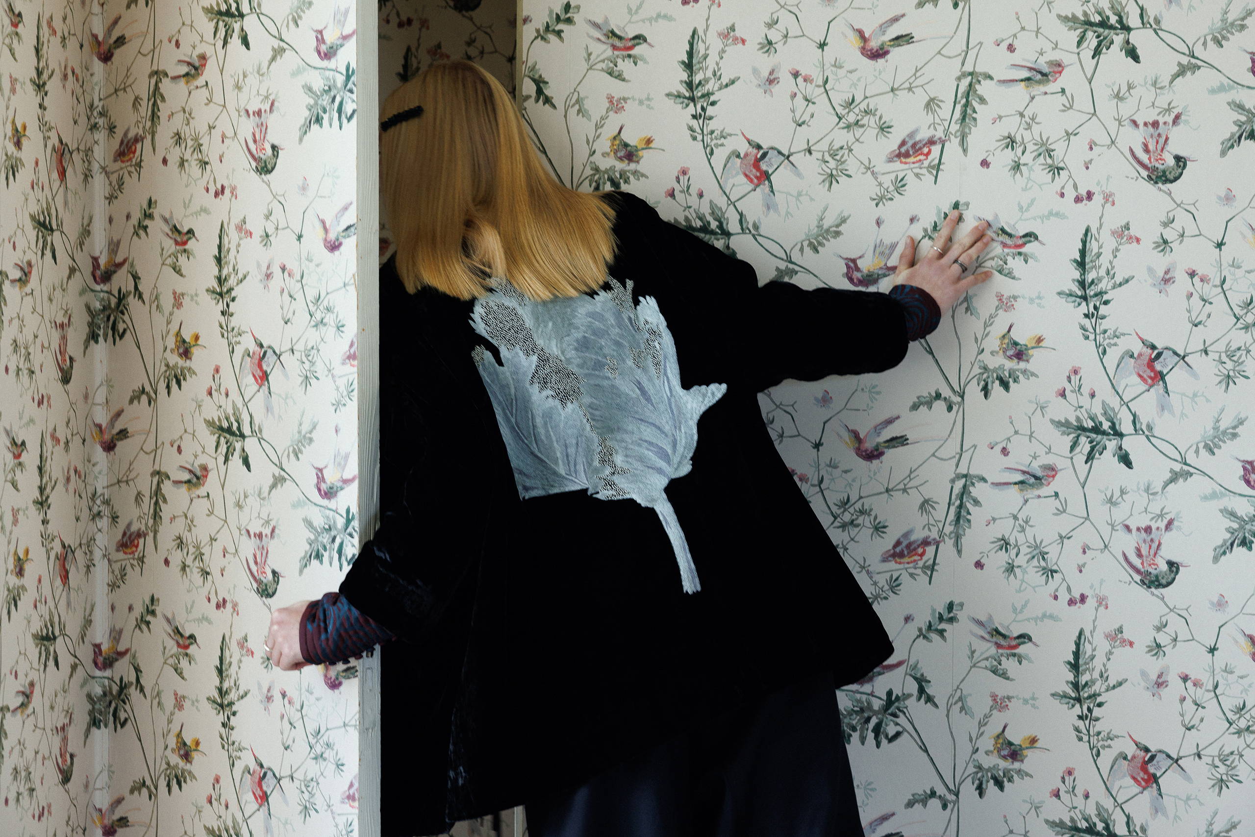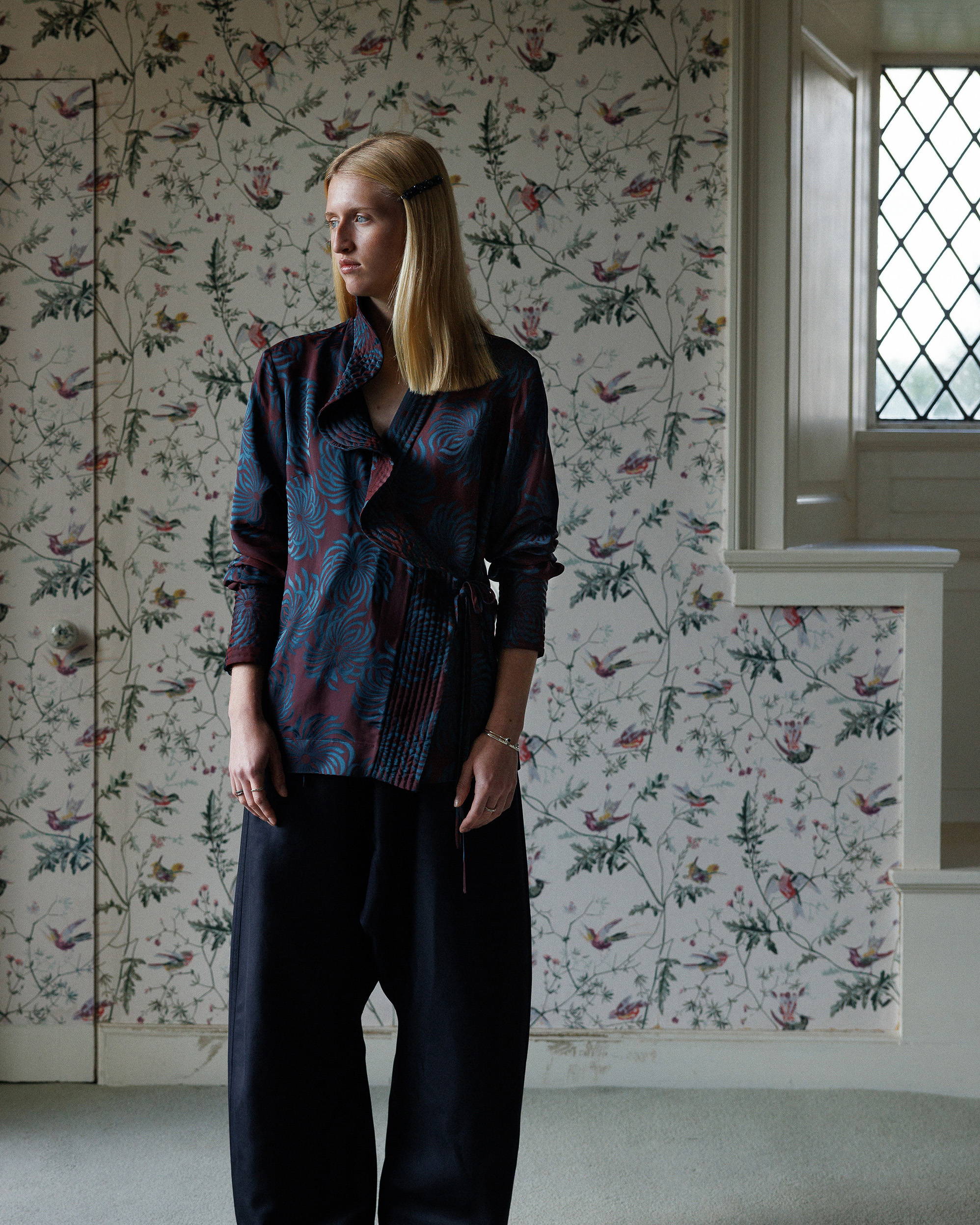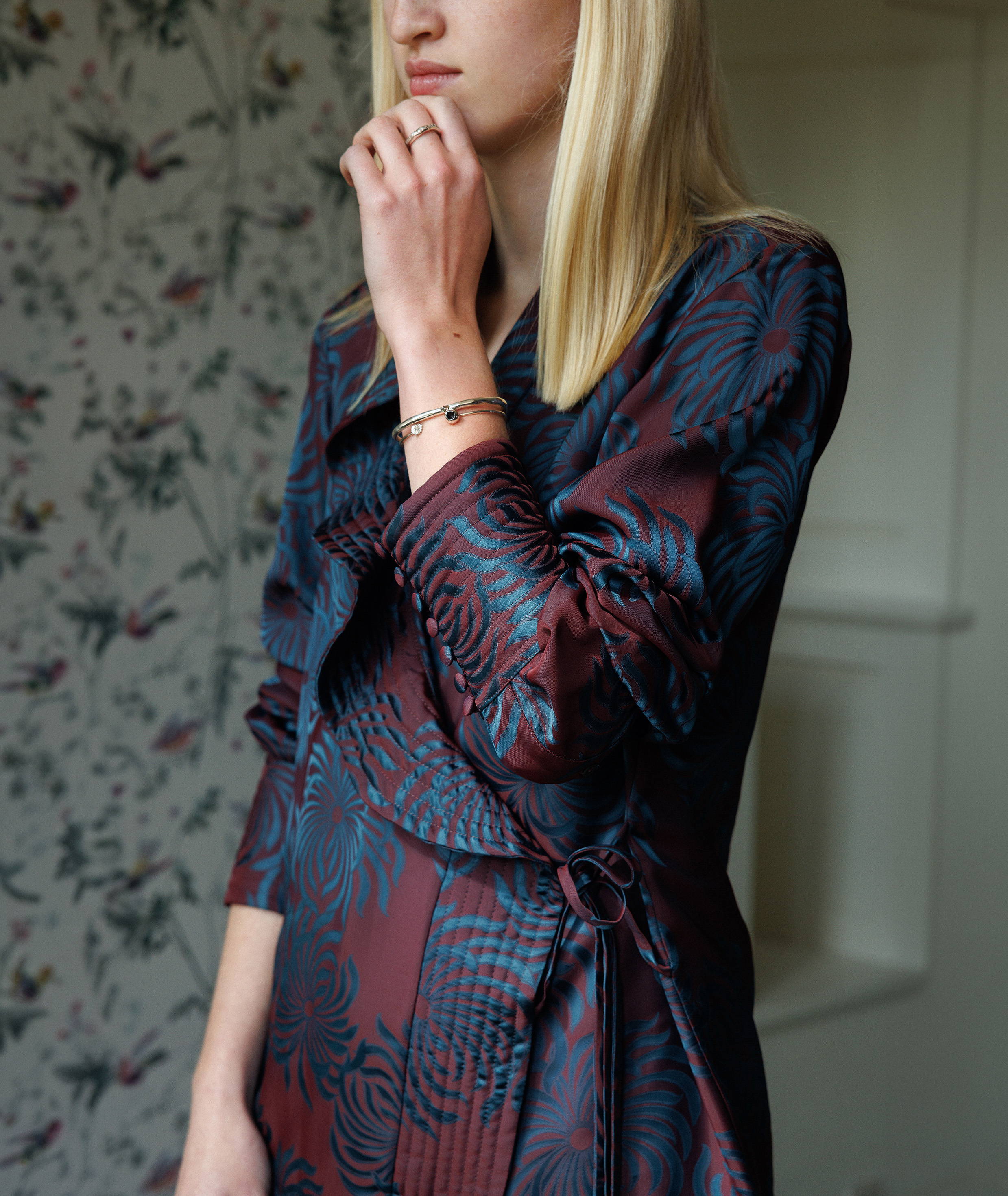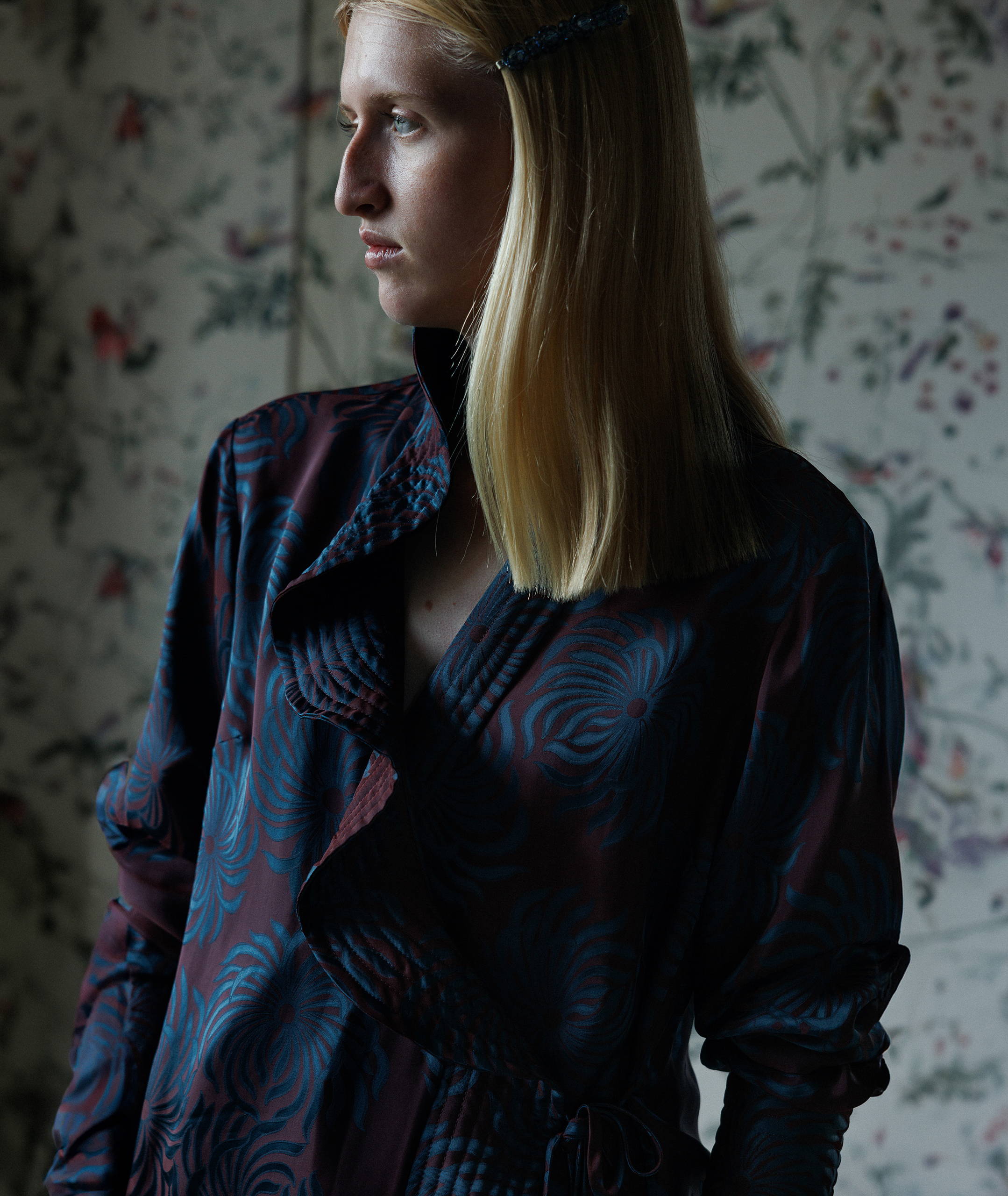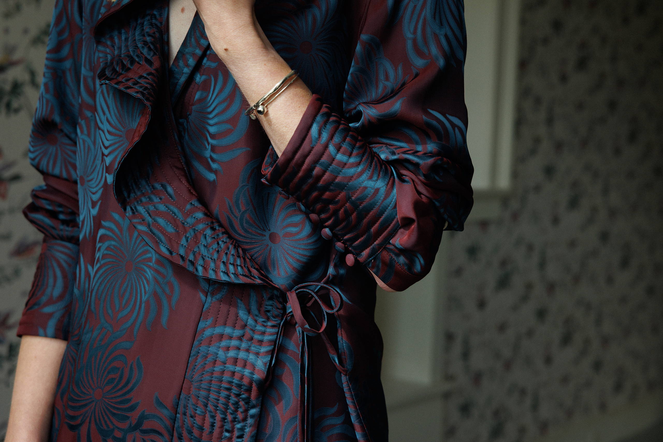Aodress Bud Embroidered Loose Coat Onyx Velvet, Dries Van Noten Printed Wrap Shirt Burgundy, Sofie D'Hoore Plof Pants Galaxy Twill, Marsèll Sottiletta Heeled Sandal Black, Antipast Mixed Cable Sock Black, Simone Rocha Medium Flower Hair Clip Indigo, Rosa Maria Jewellery.