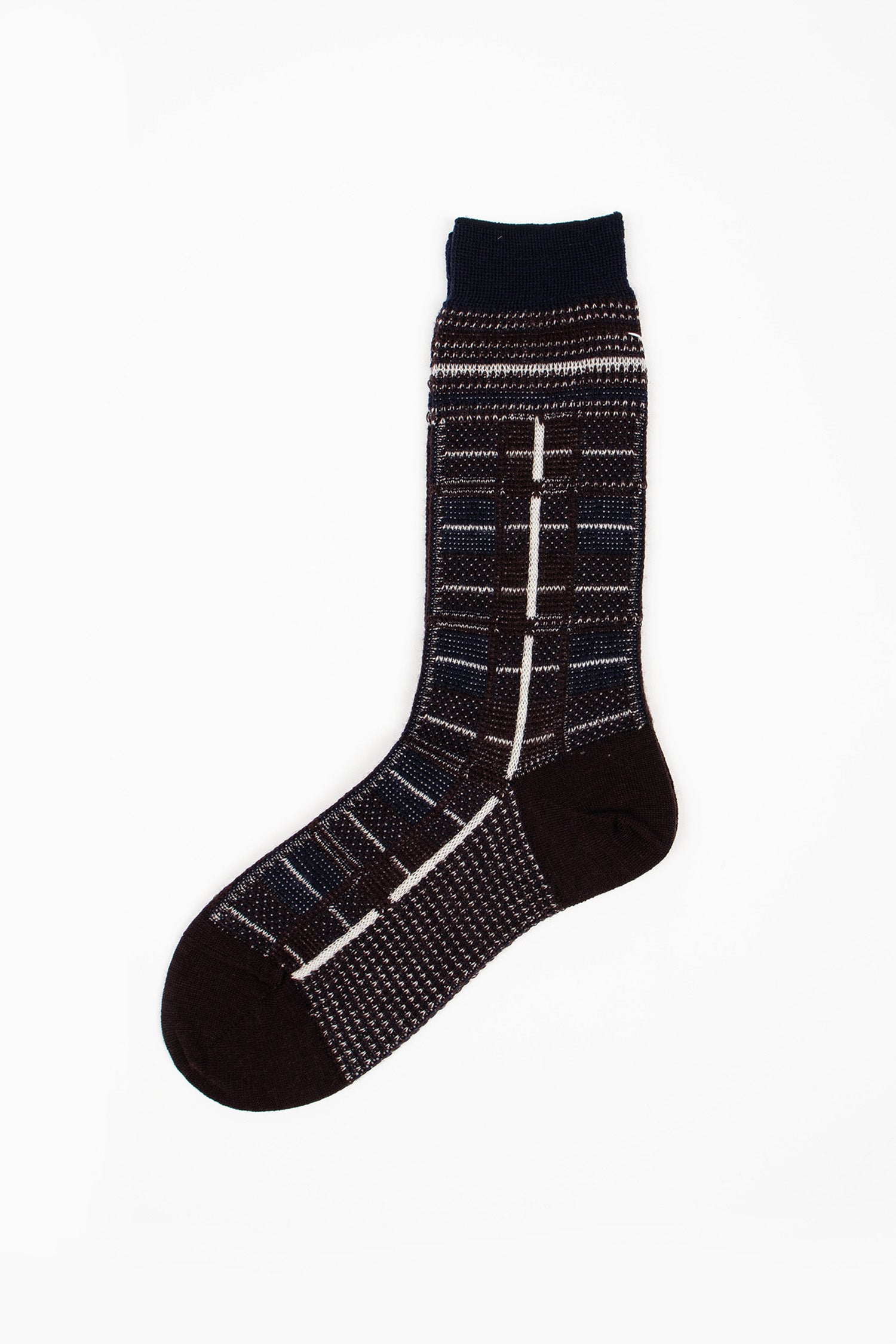 Antipast AM-757B tartan check socks in wine. Elasticated cuff, tartan check throughout, Antipast at base.