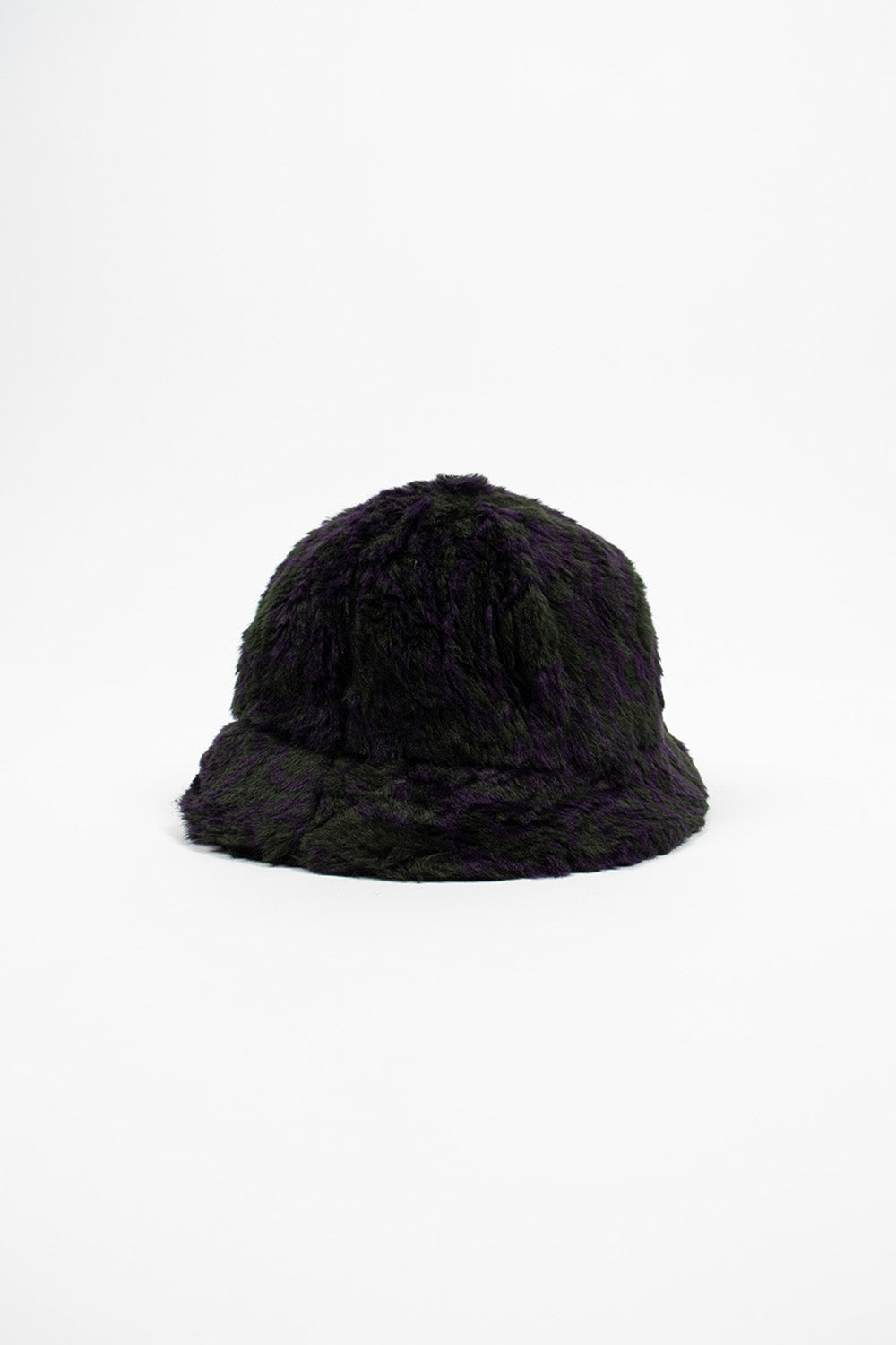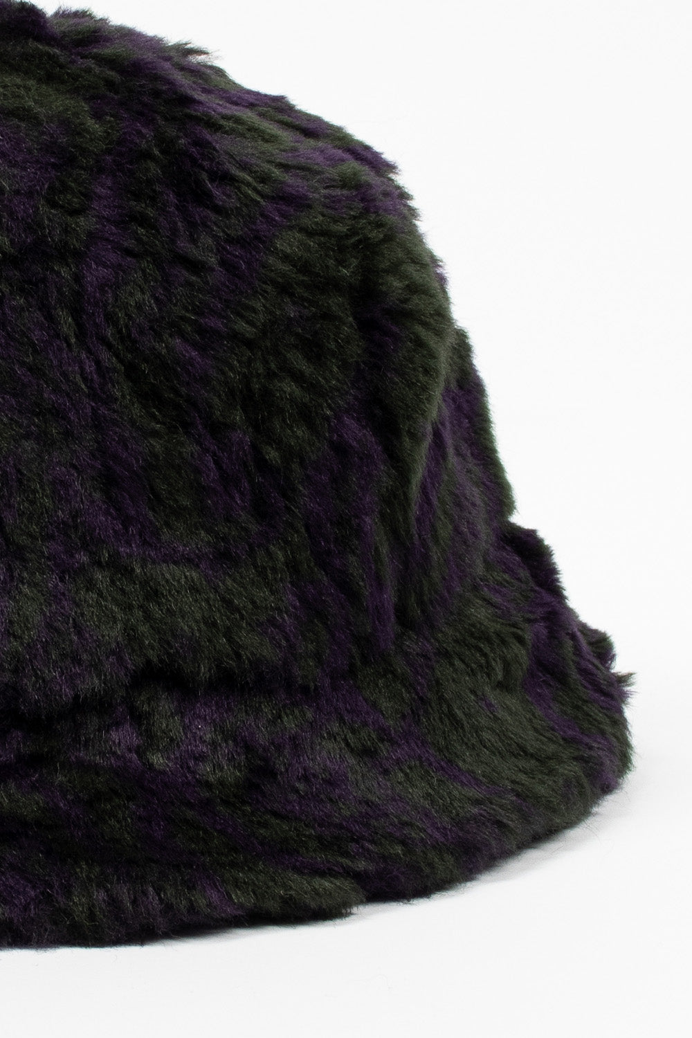 Needles bermuda hat in green with purple paisley print. Faux fur with rounded shape and brim.