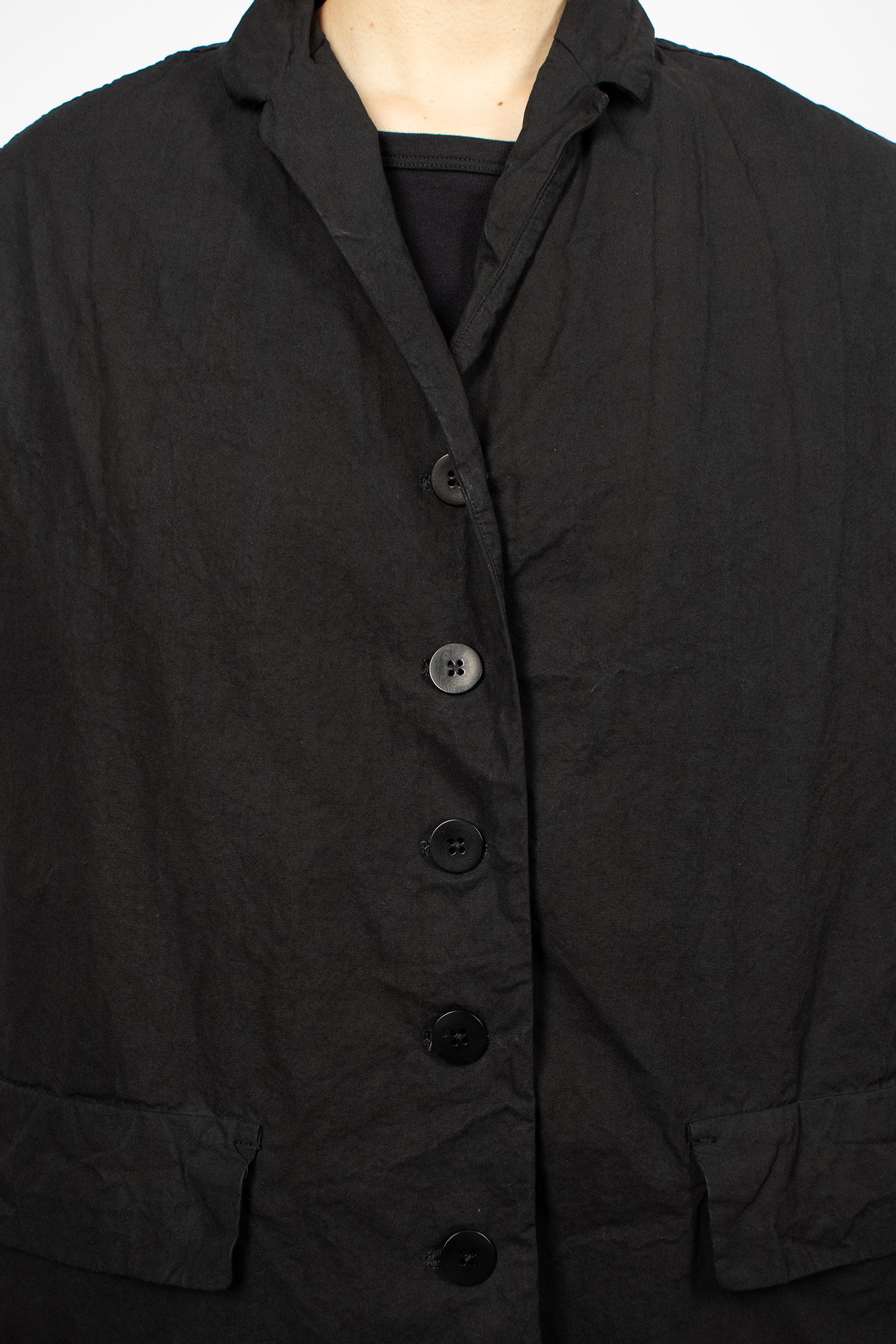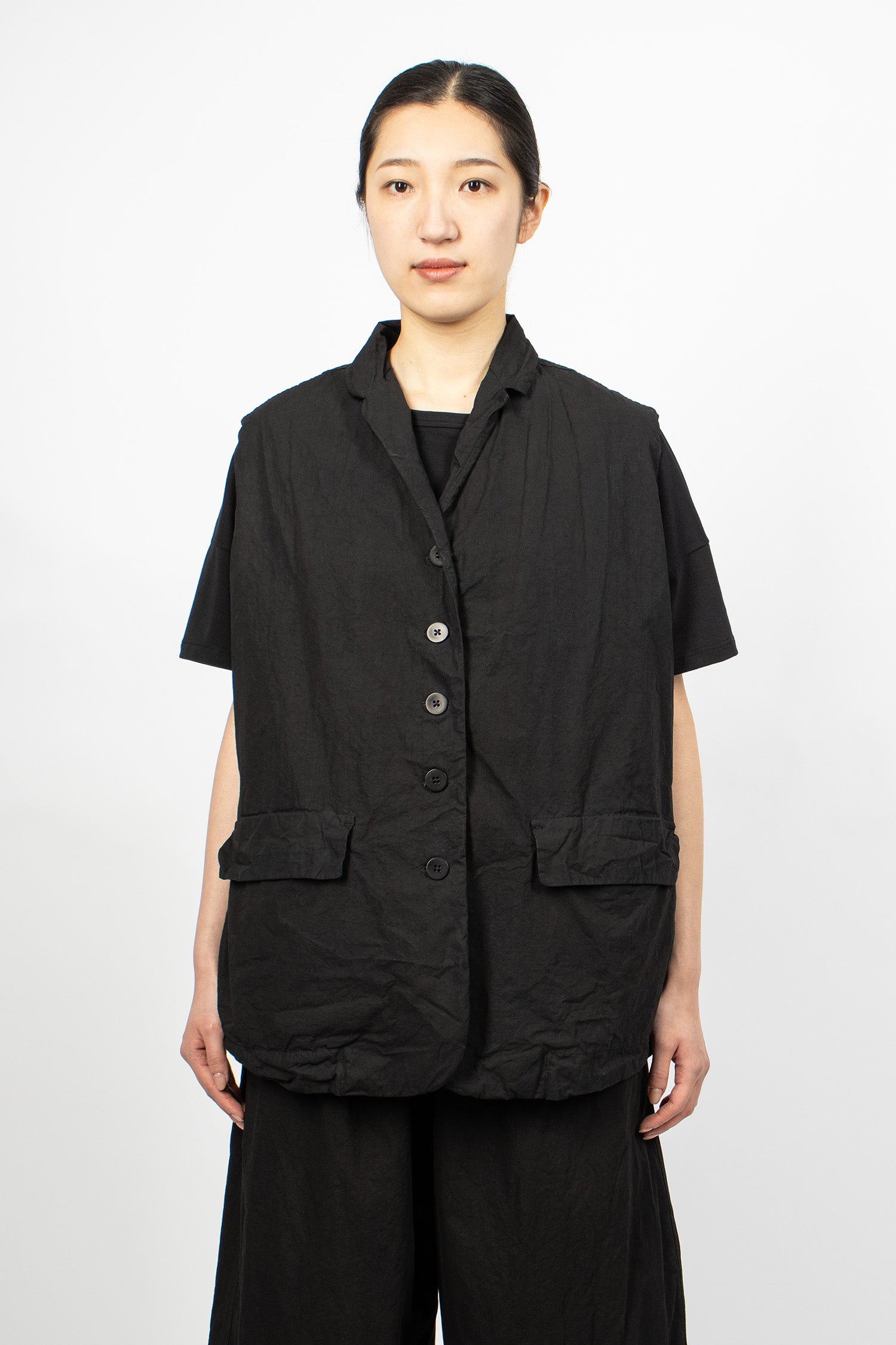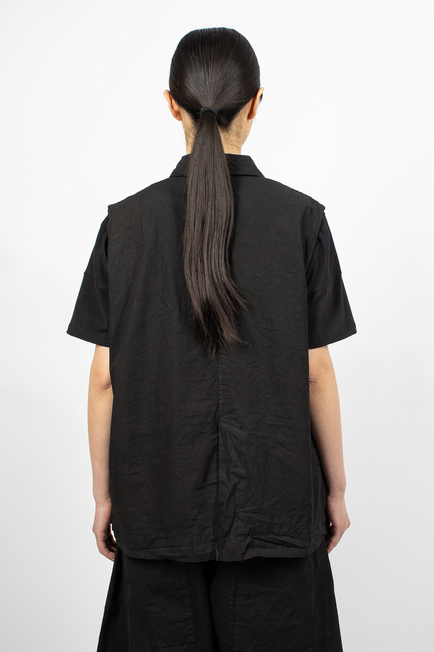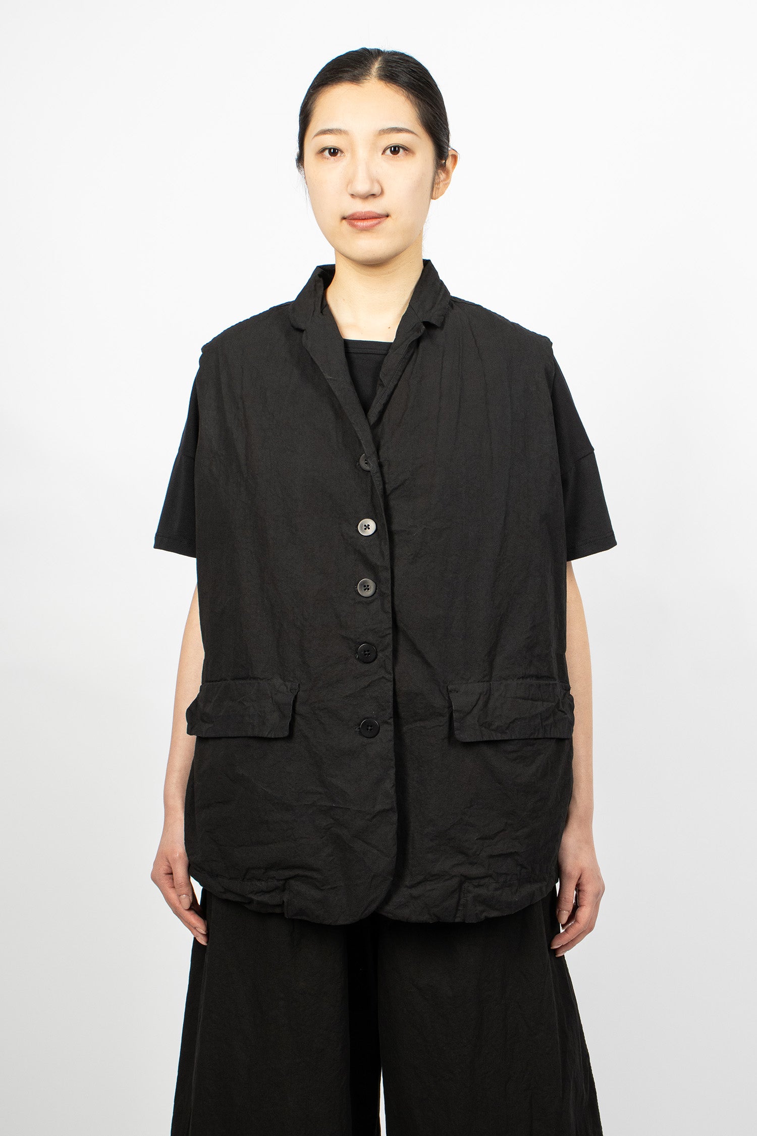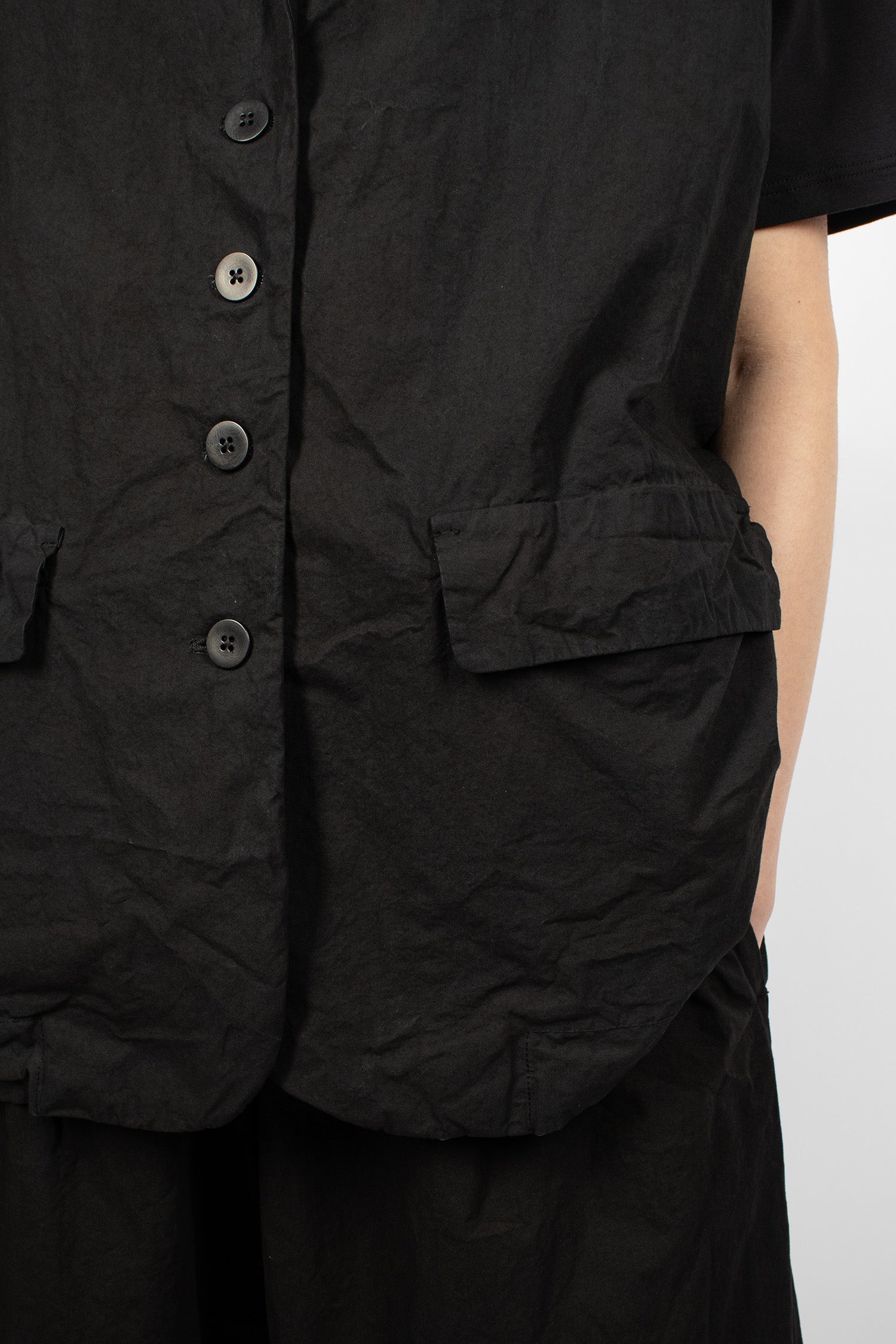 Album di Famiglia 12_143 short sleeveless shirt TC in black. Collar with mother of pearl button front fastening, sleeveless, straight hem with drawstring detailing. Relaxed boxy fit.