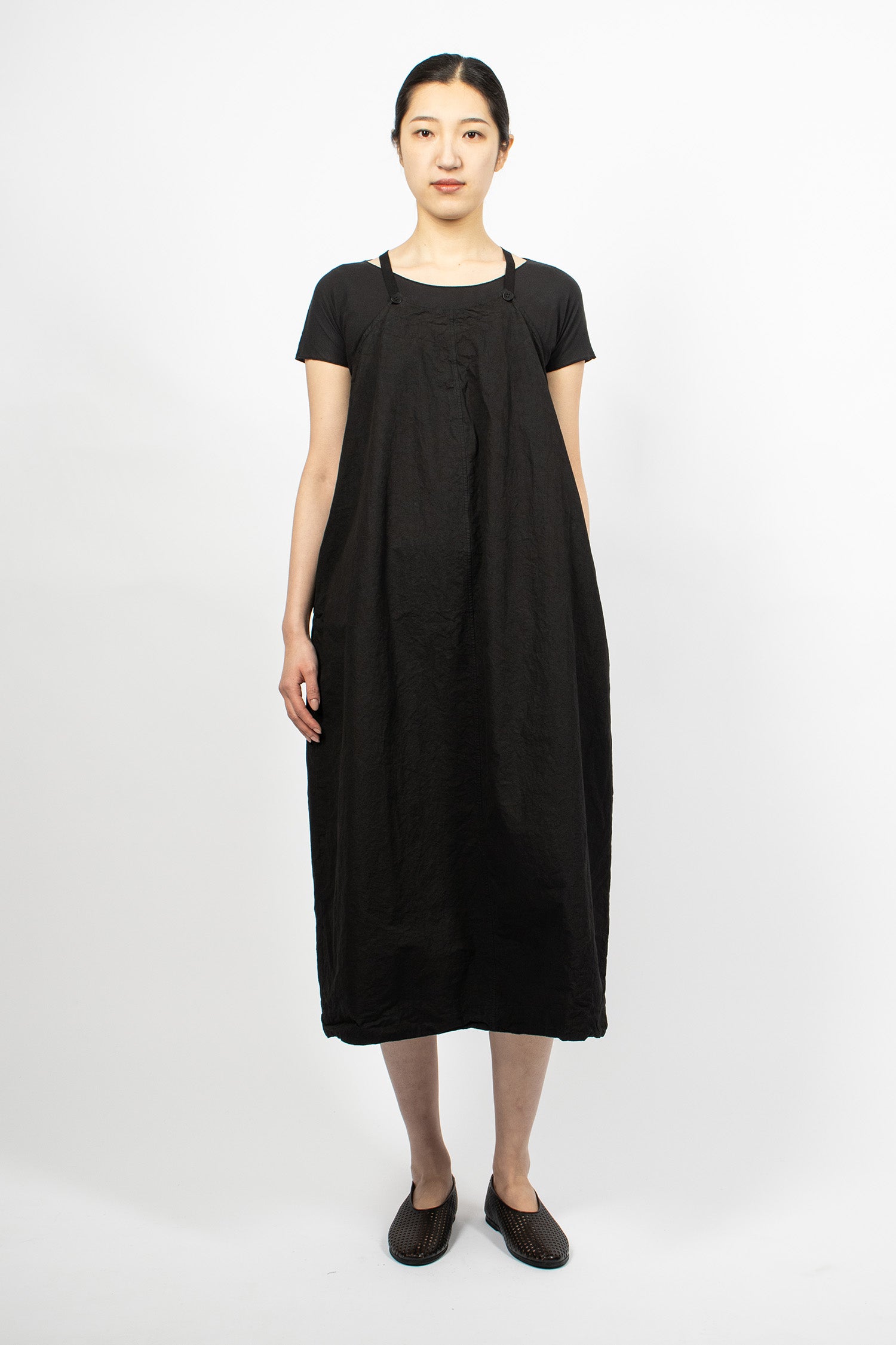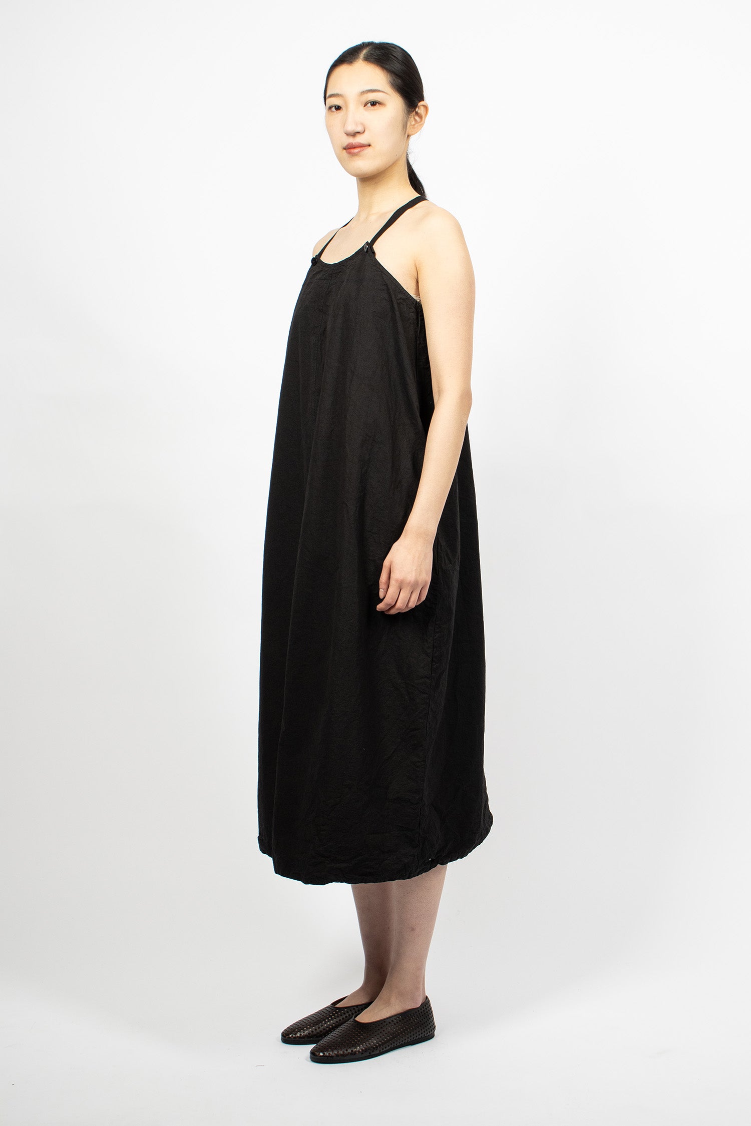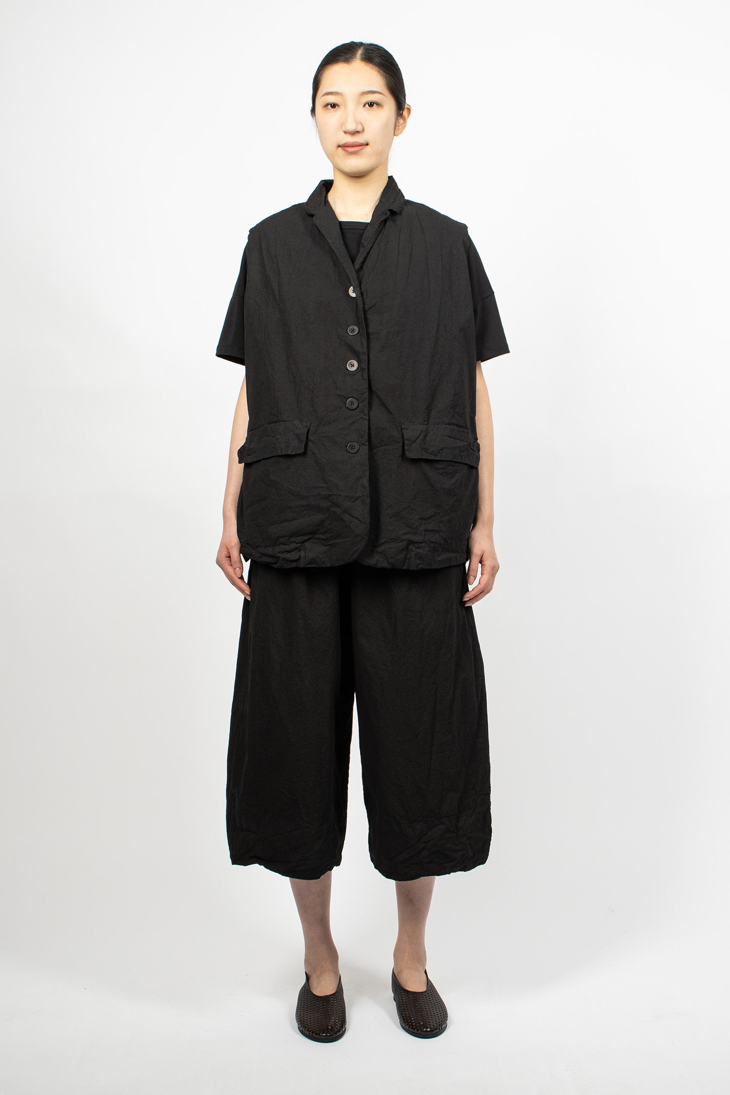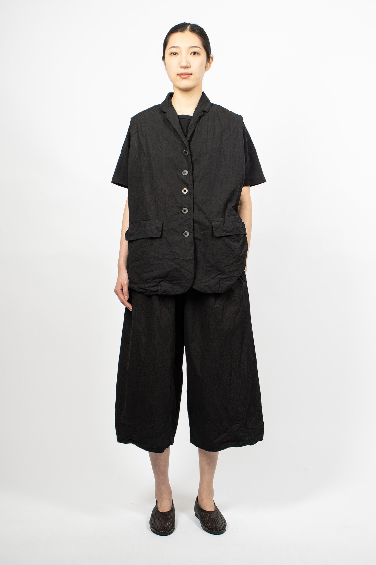 Album di Famiglia 12_143 short sleeveless shirt TC in black. Collar with mother of pearl button front fastening, sleeveless, straight hem with drawstring detailing. Relaxed boxy fit.