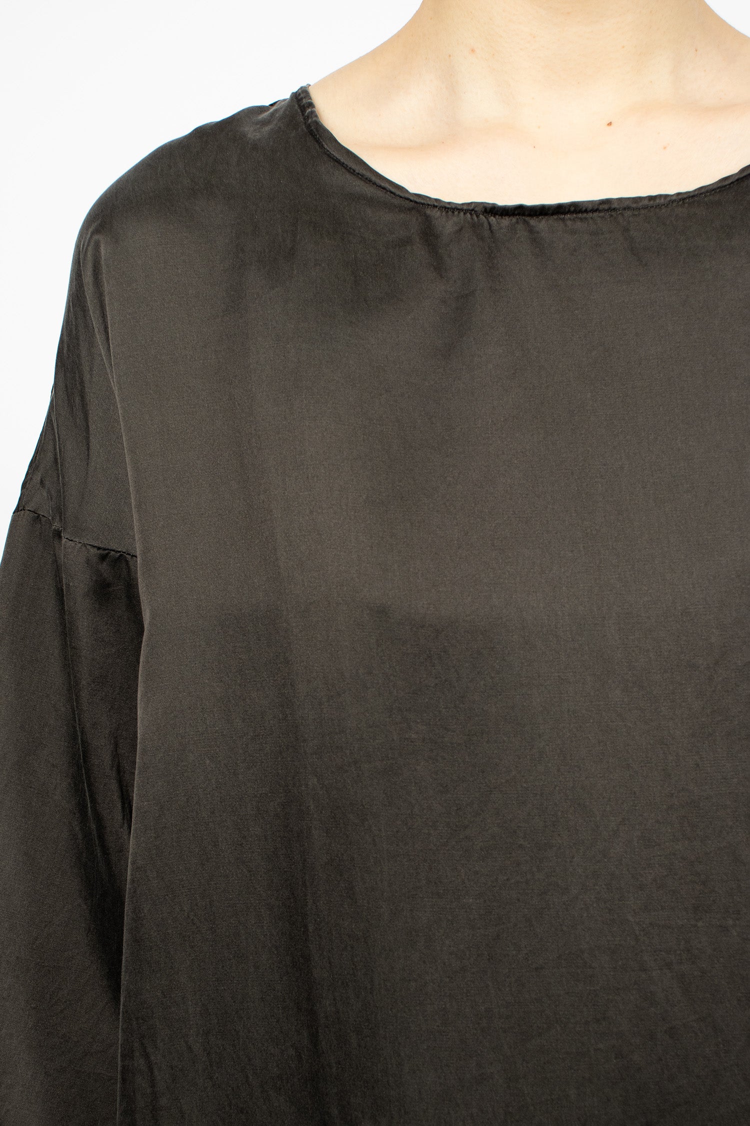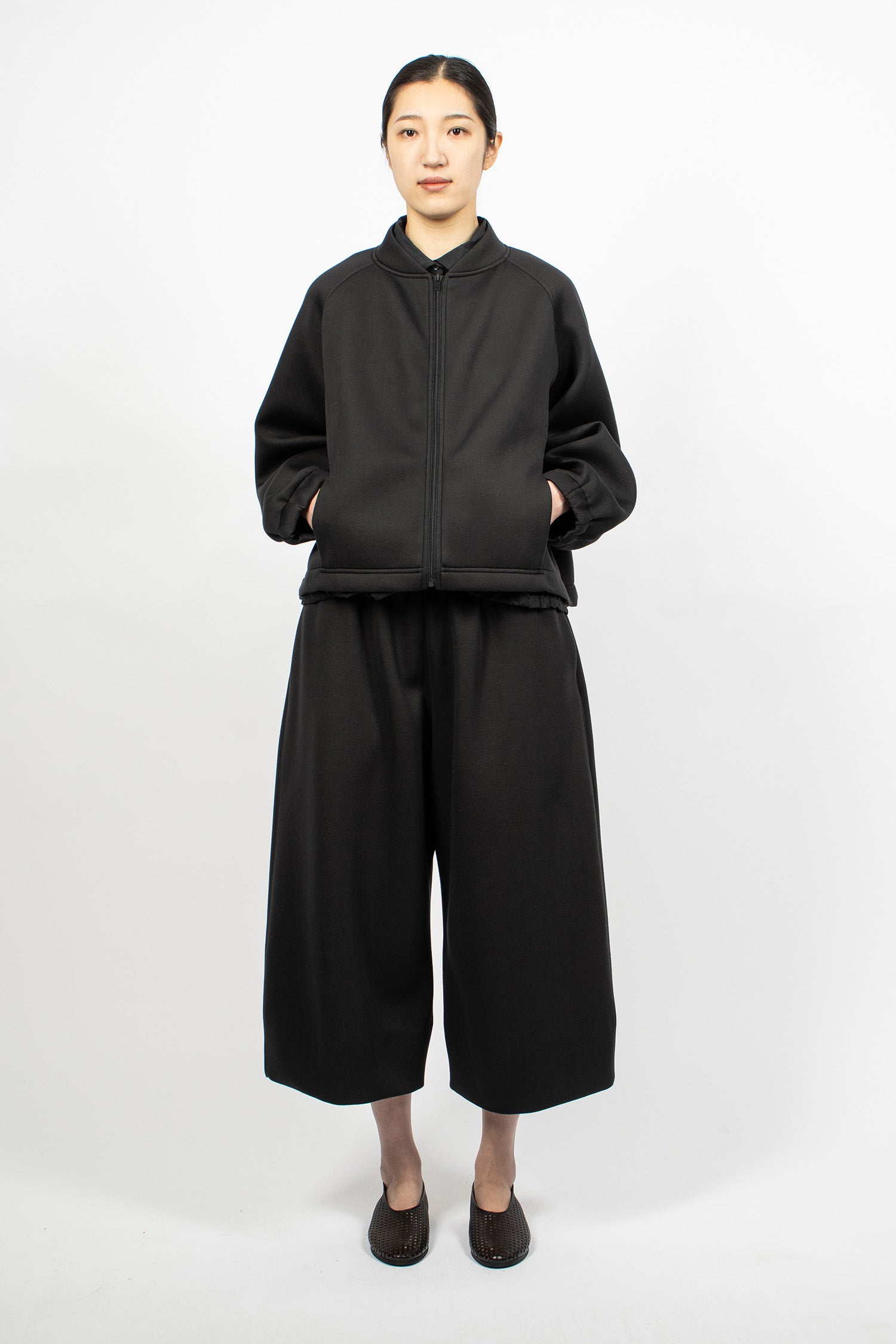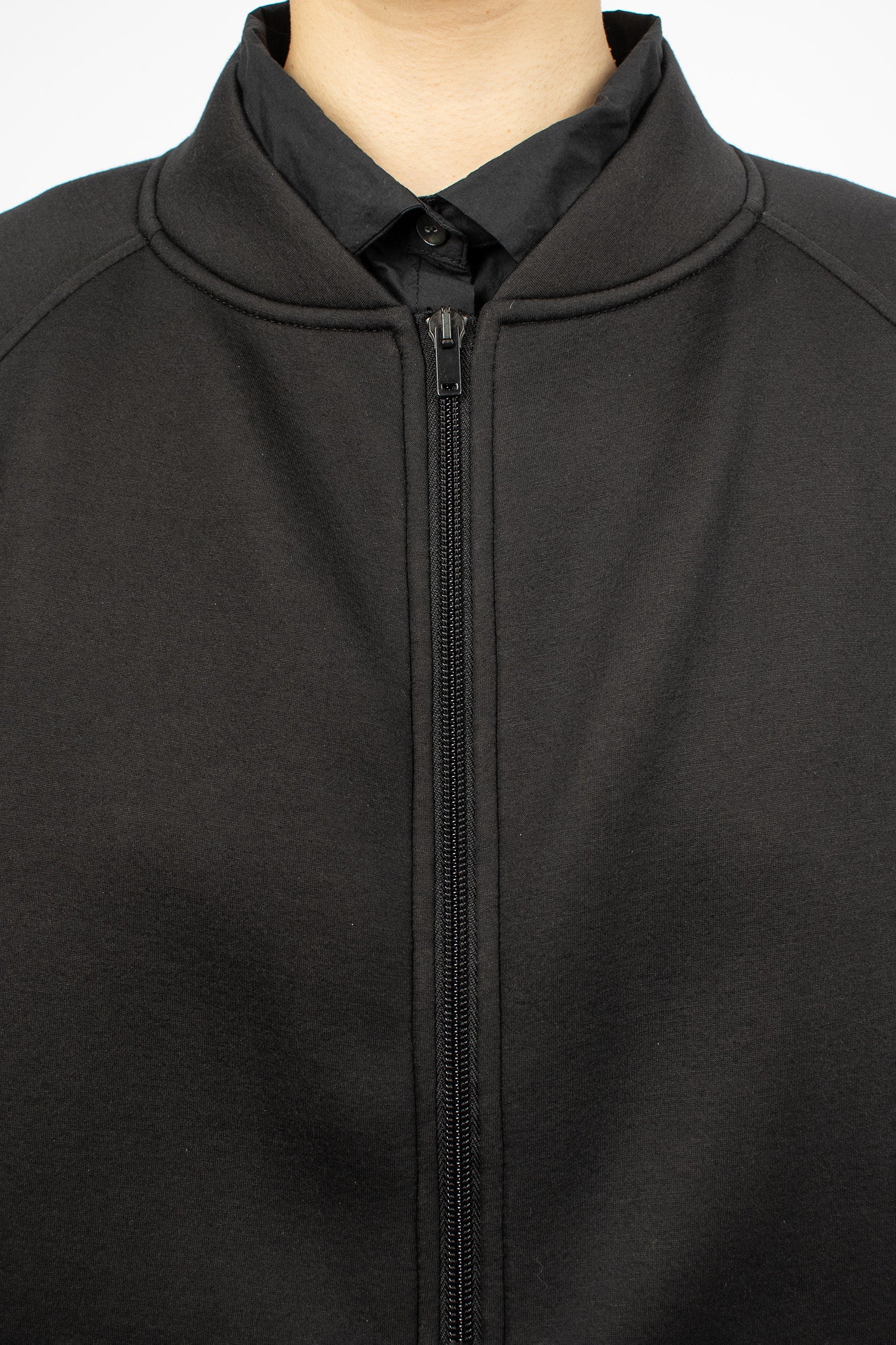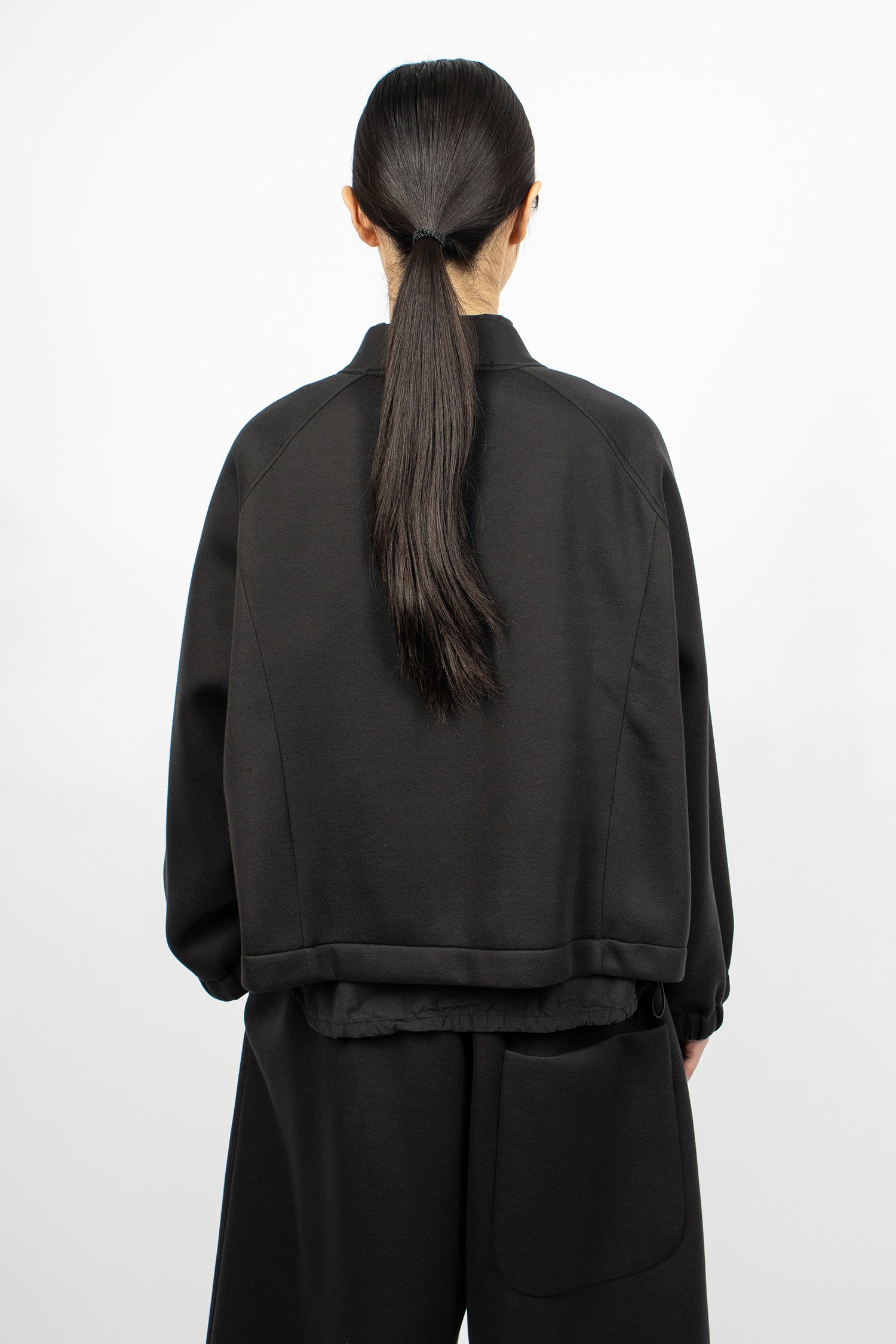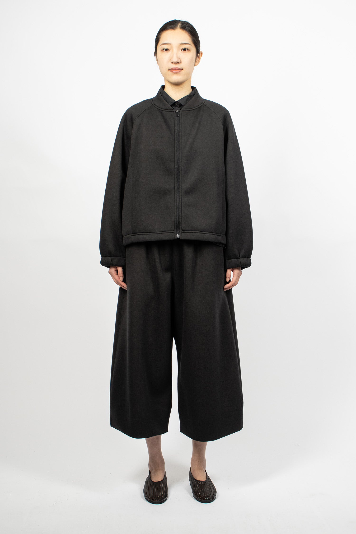 Album di Famiglia 12_143 short sleeveless shirt TC in black. Collar with mother of pearl button front fastening, sleeveless, straight hem with drawstring detailing. Relaxed boxy fit.