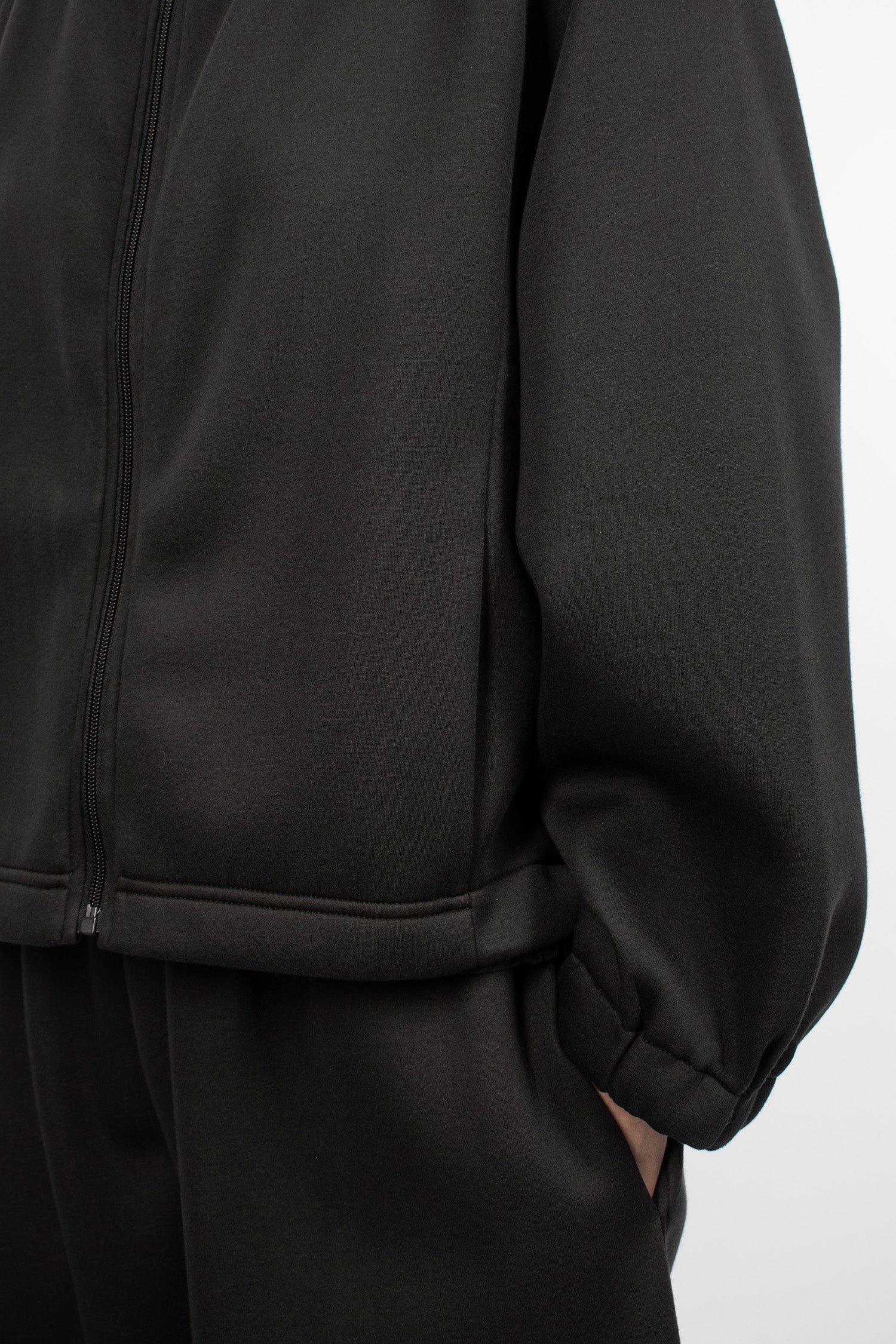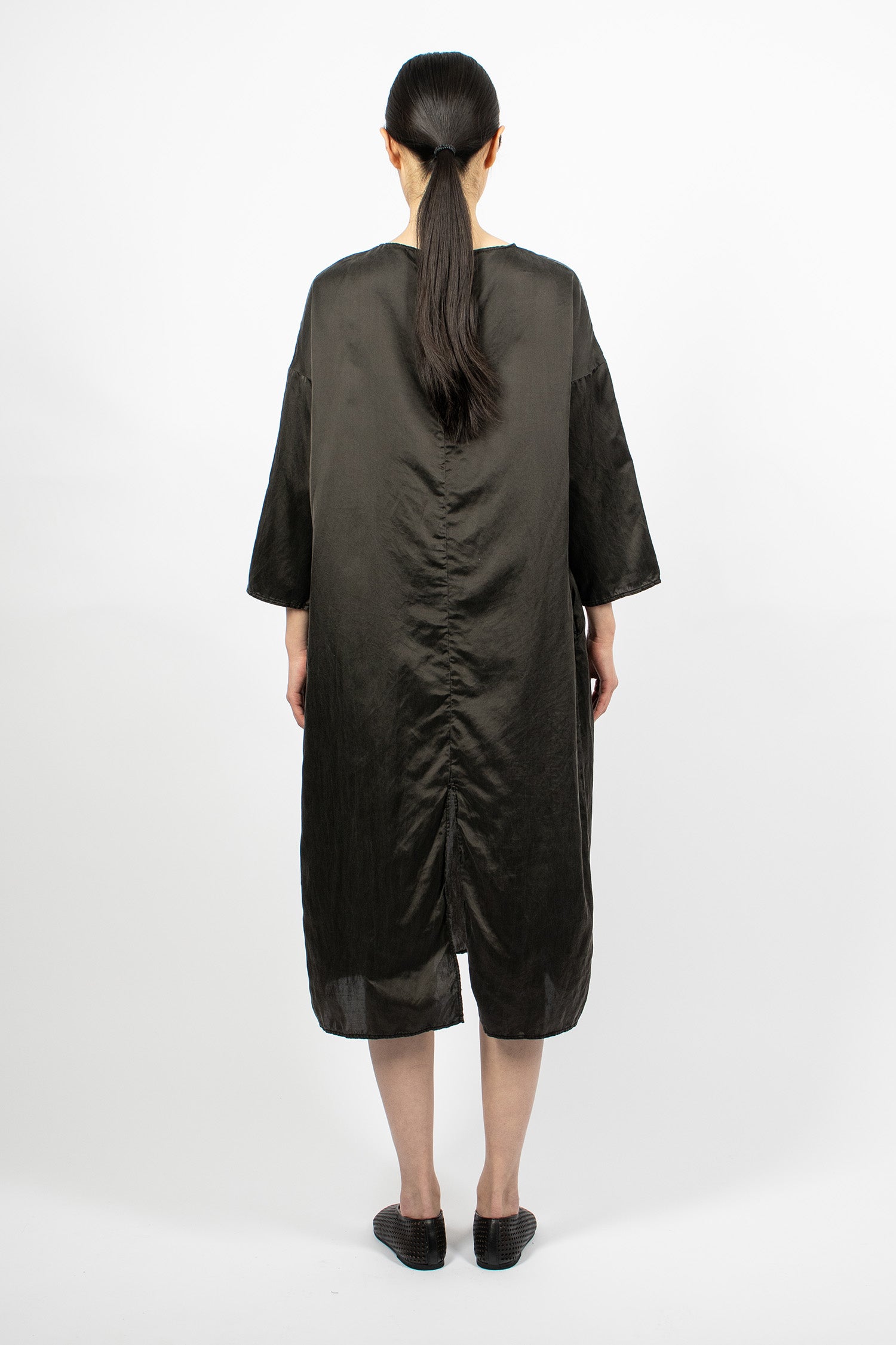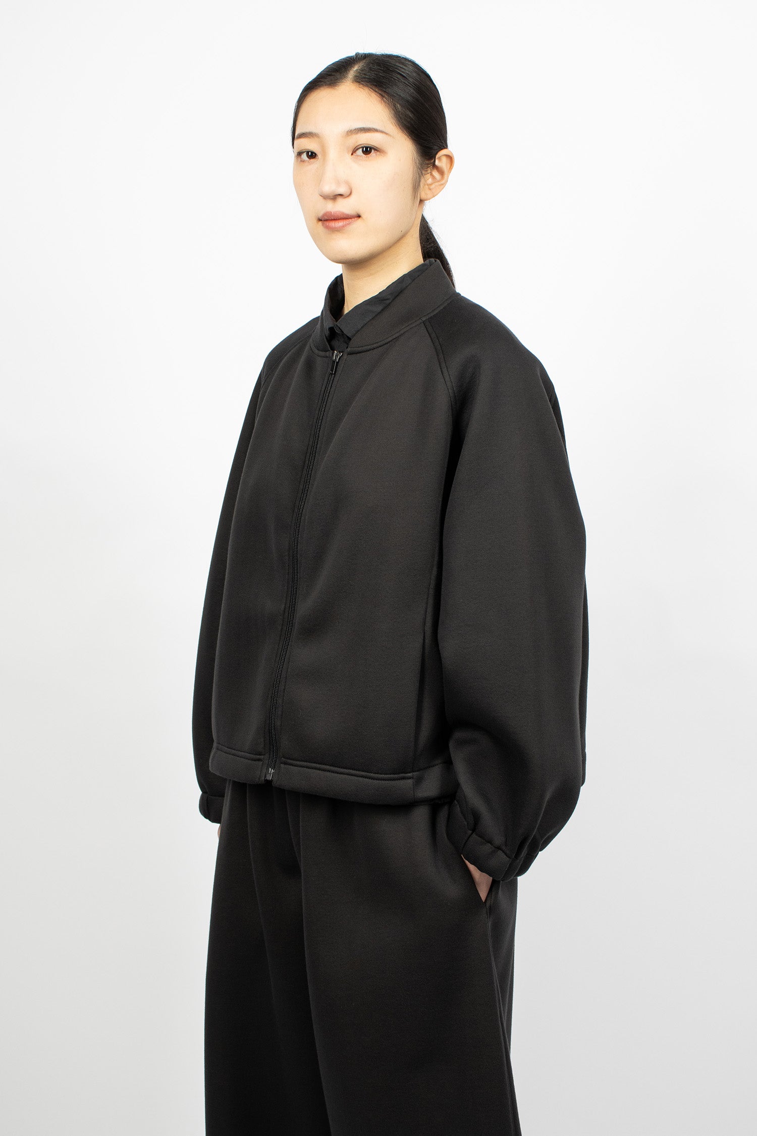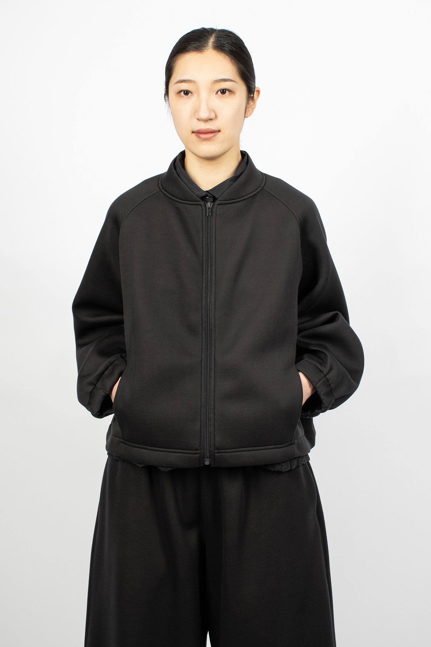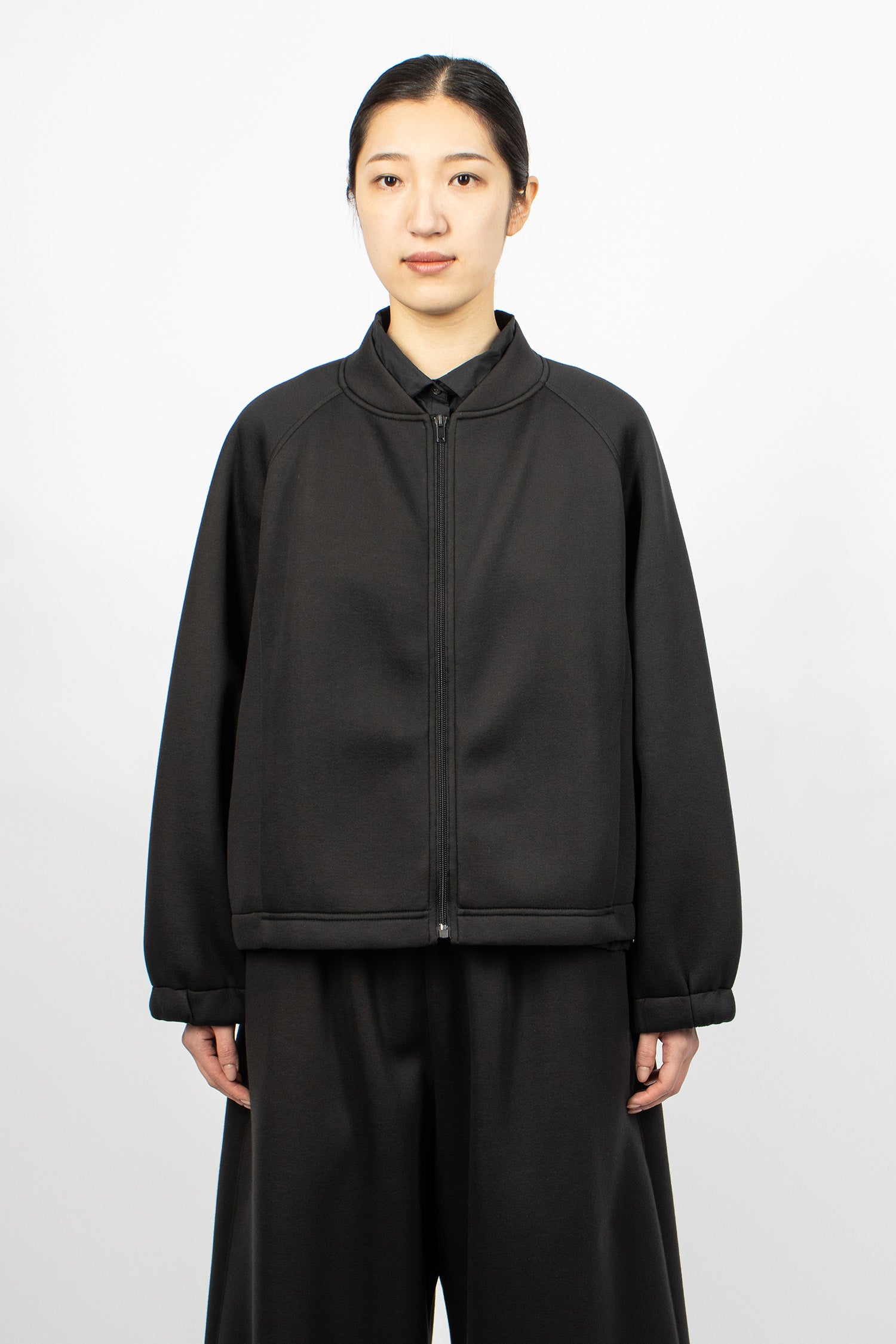 Album di Famiglia 12_143 short sleeveless shirt TC in black. Collar with mother of pearl button front fastening, sleeveless, straight hem with drawstring detailing. Relaxed boxy fit.