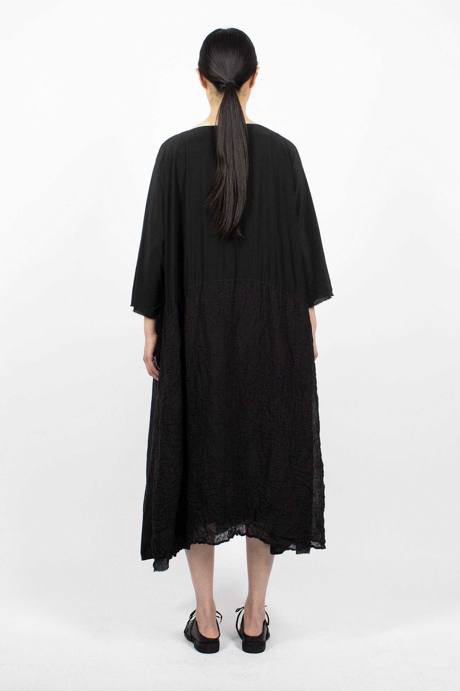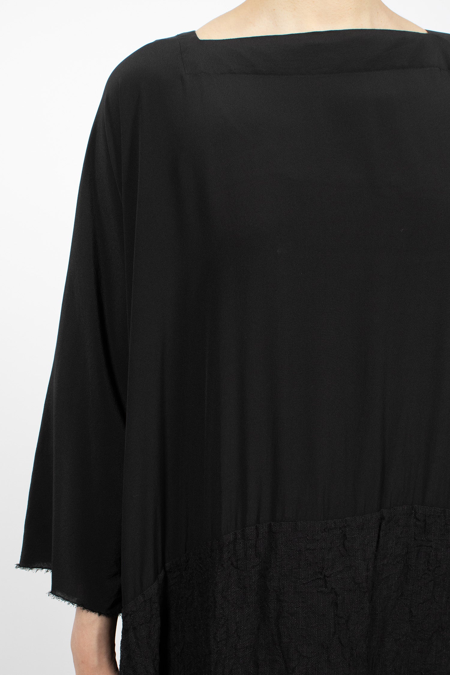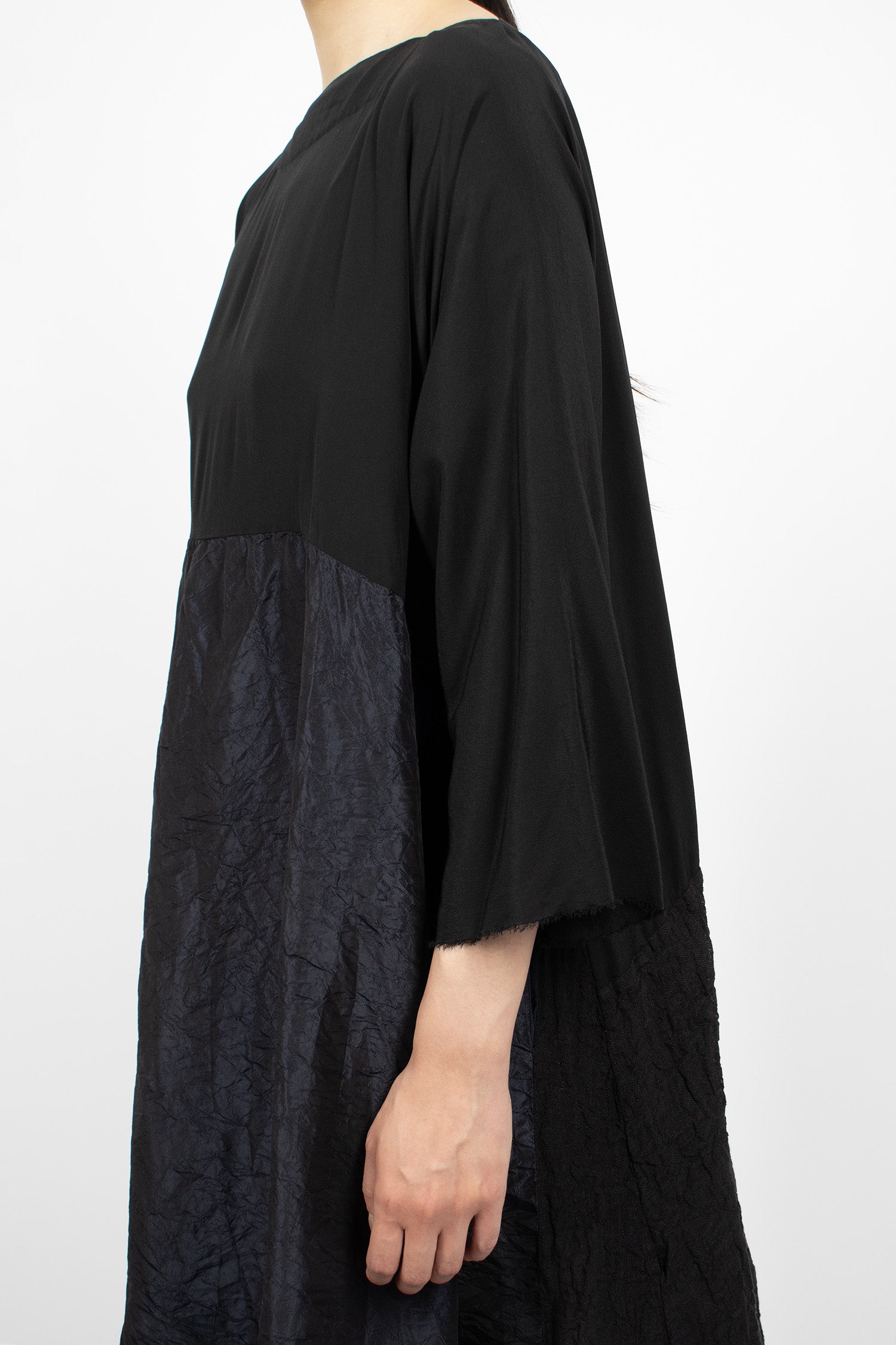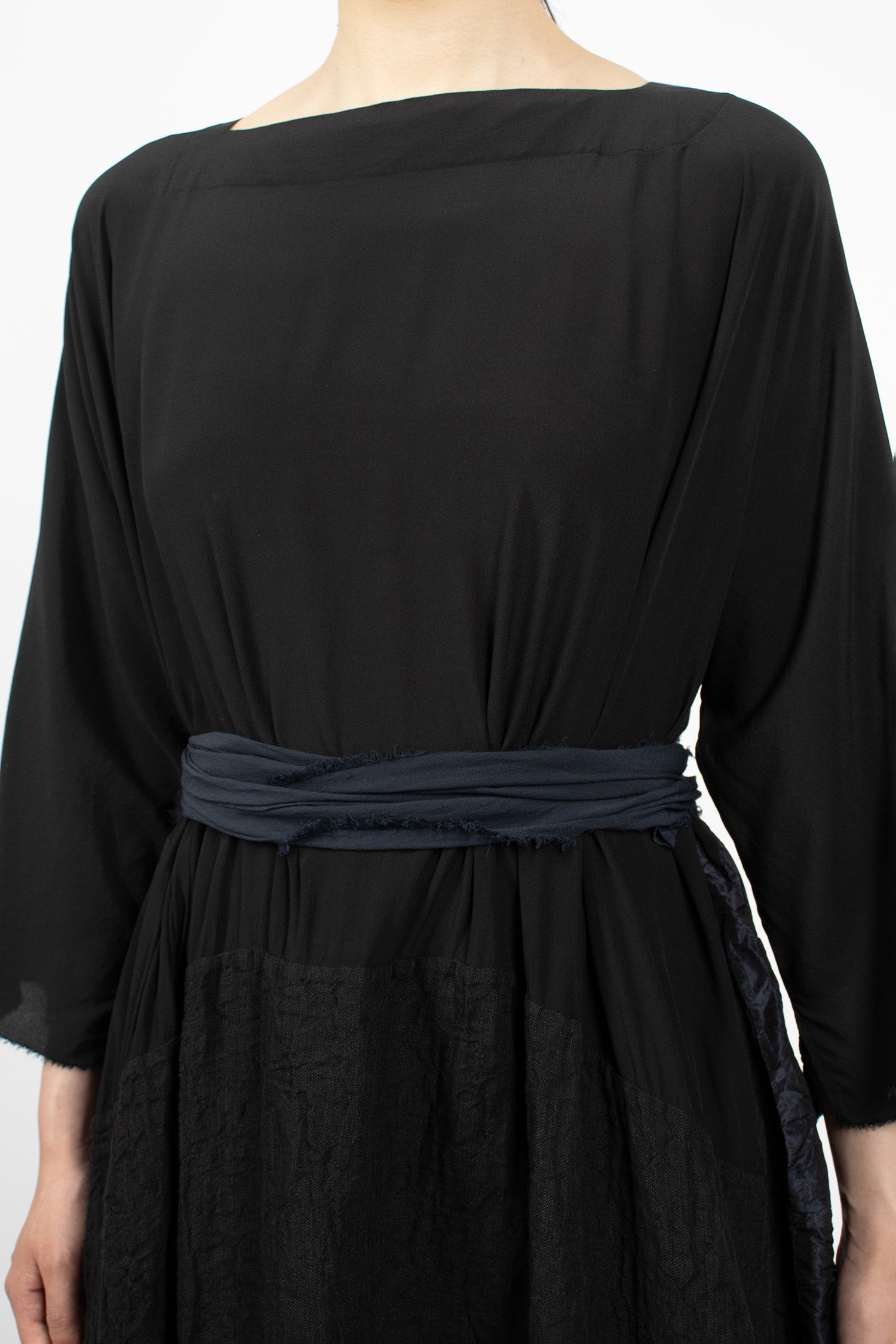 Daniela Gregis 4 sheets dress in black and navy blue silk, taffeta silk and linen patchwork. Boatneck, bracelet length sleeve, raw cut cuff with side split, side seam pockets. A-line and relaxed. Either side can be worn on the front or back. Optional belt or scarf with contrast raw cut edge. Garment washed.