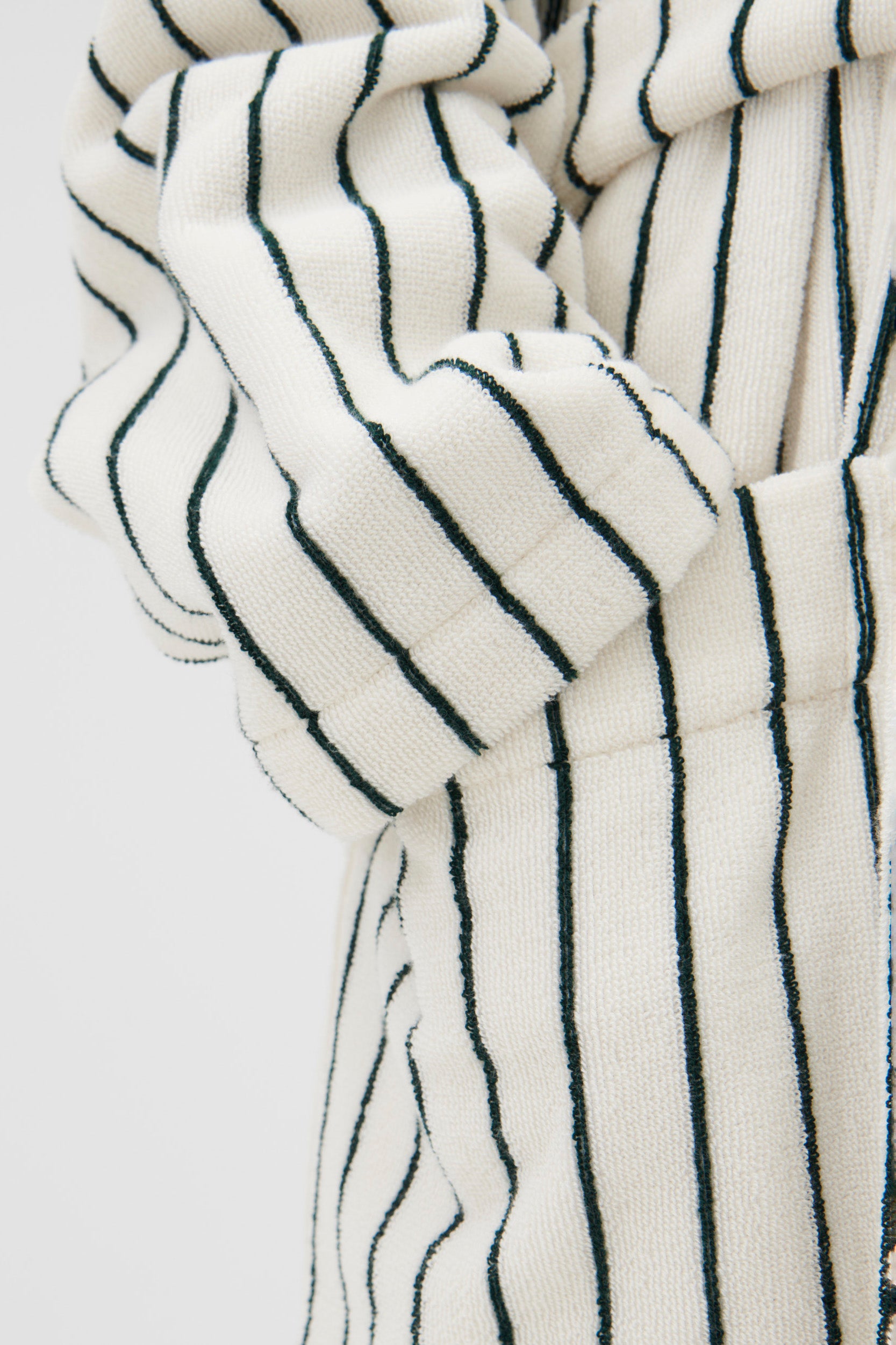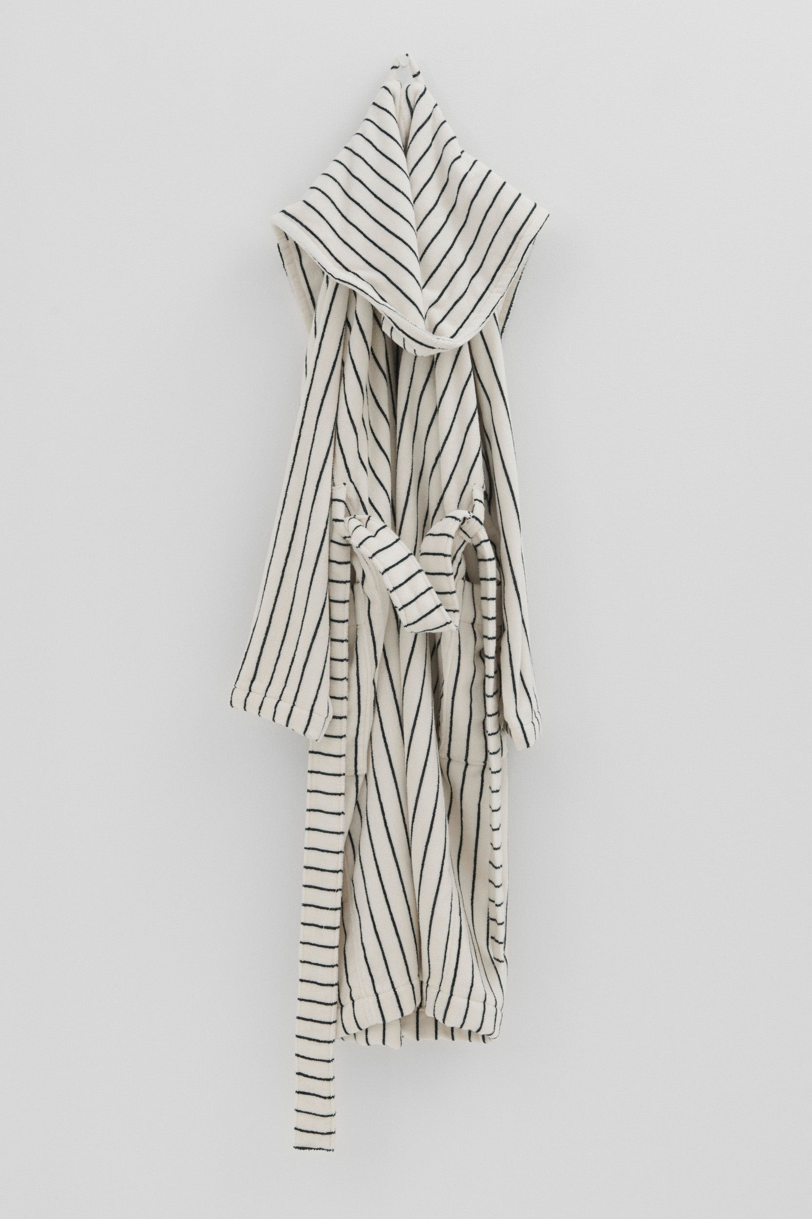 Tekla hooded bathrobe in striped racing green heavyweight 385 GSM terry weave. Large hood with detachable belt, topstitched seams and patch pockets.