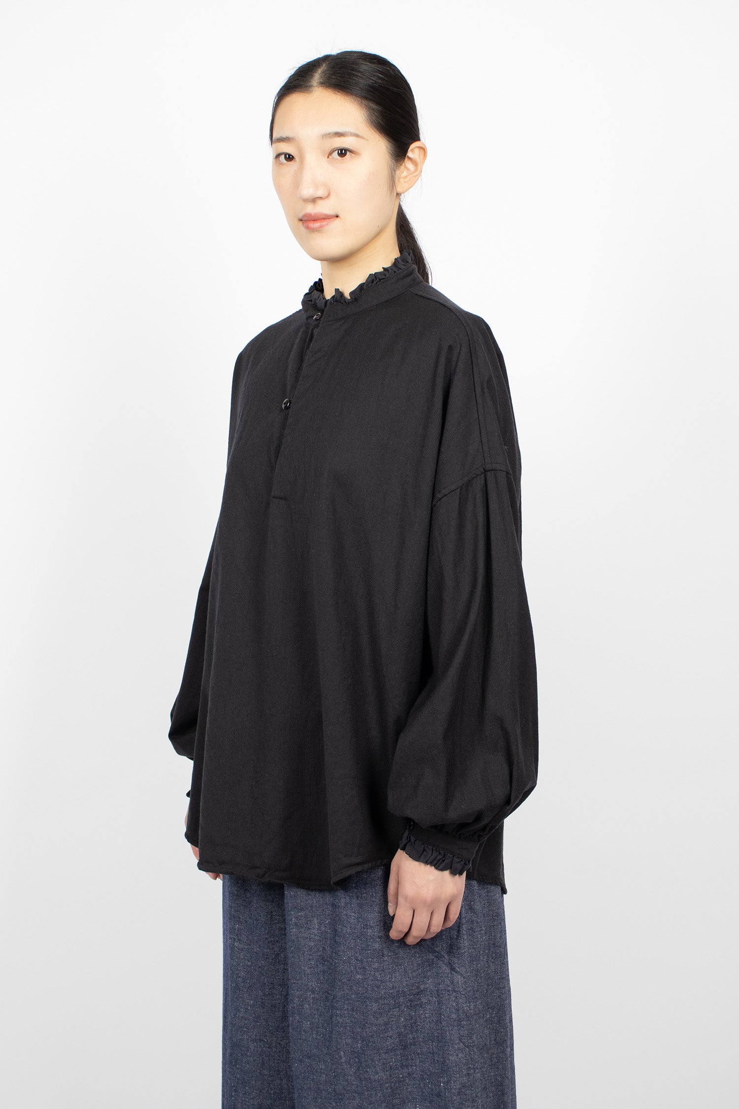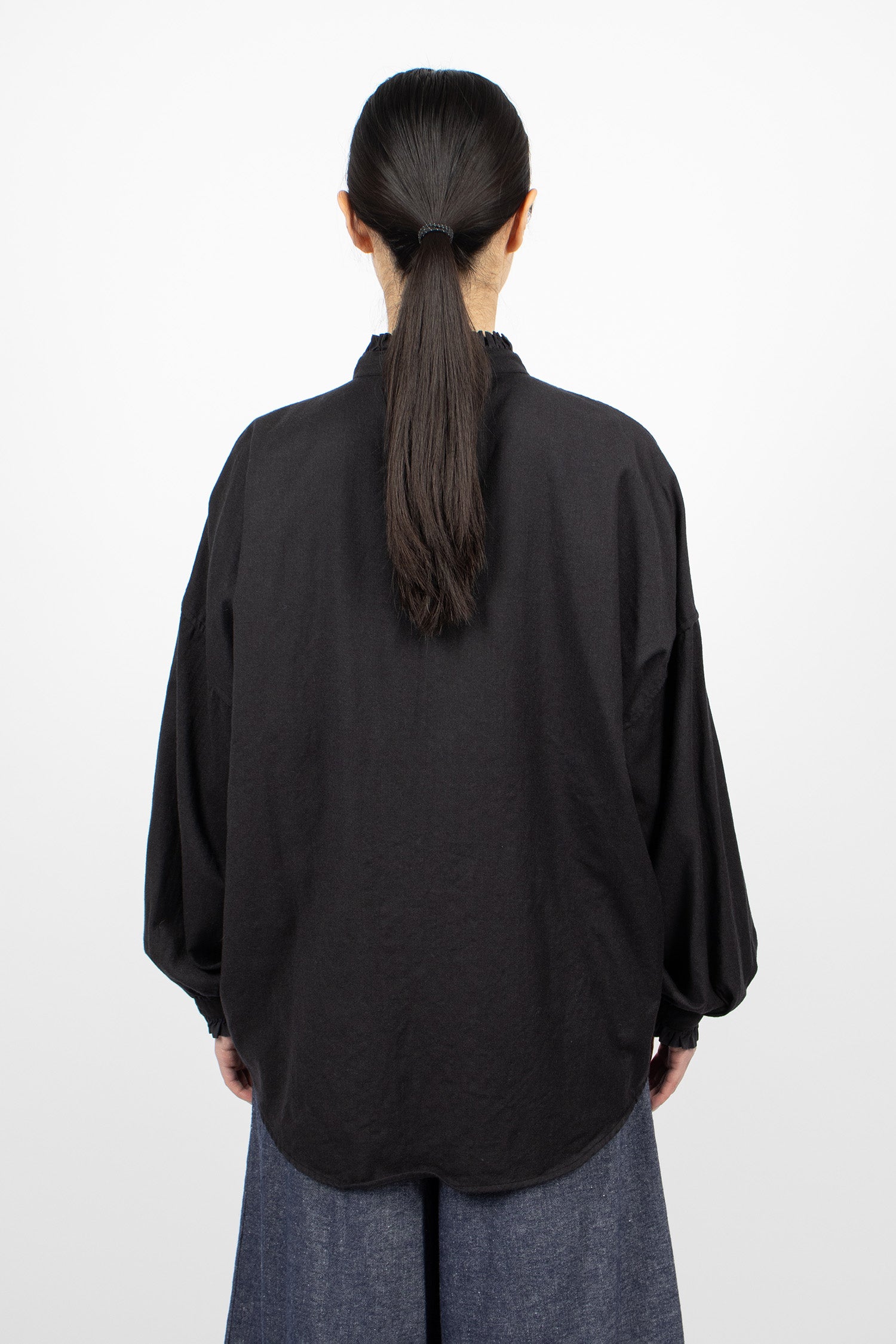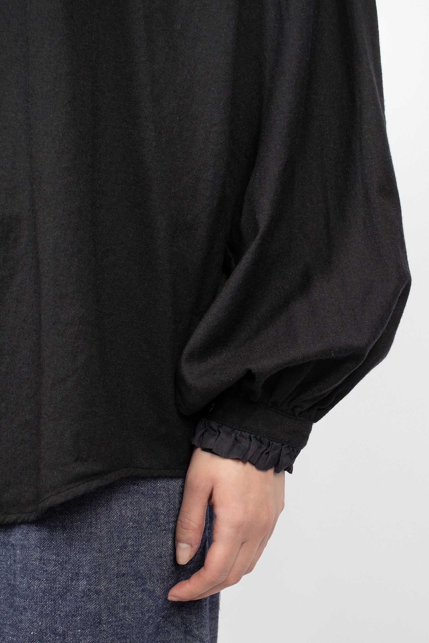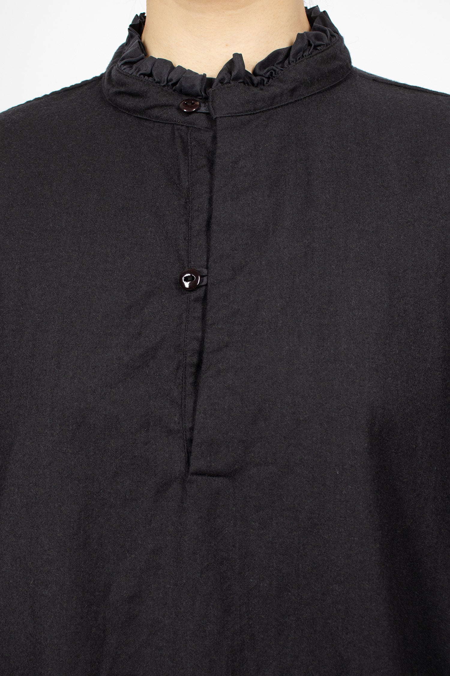 Chez Vidalenc mini medici shirt in black wool. Contrast silk trimmed frill stand collar. Button keyhole front fastening, dropped shoulder, long sleeves with silk frill cuffs. Curved hem with dropped back and relaxed, loose fit.