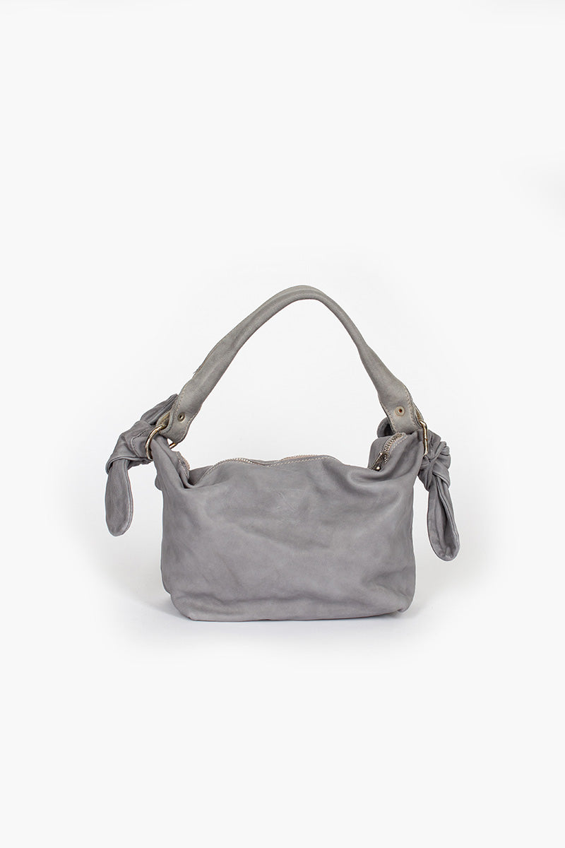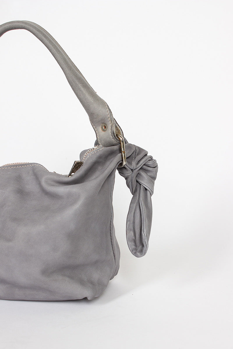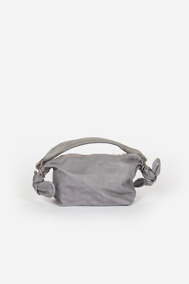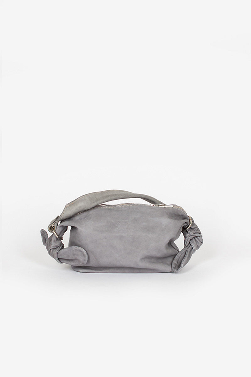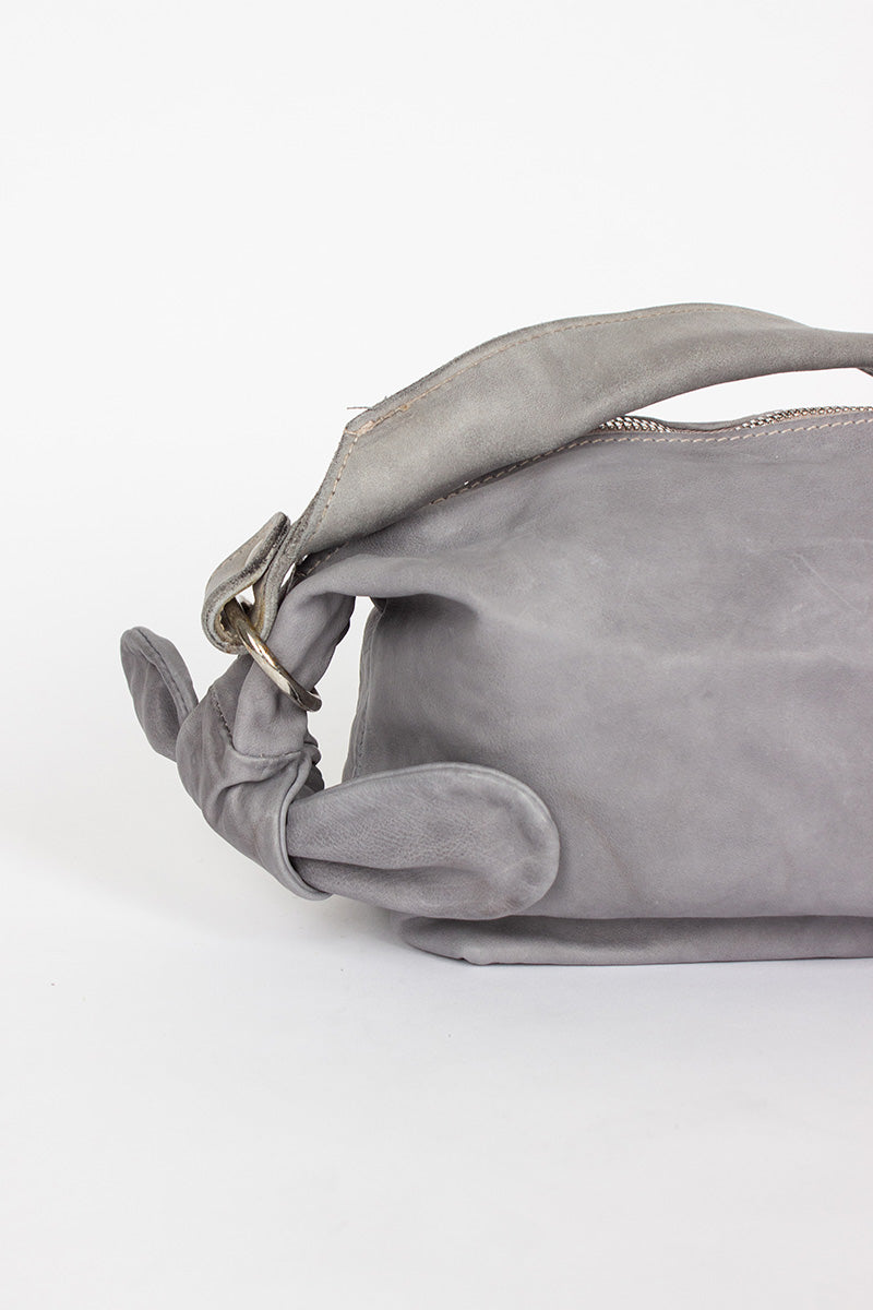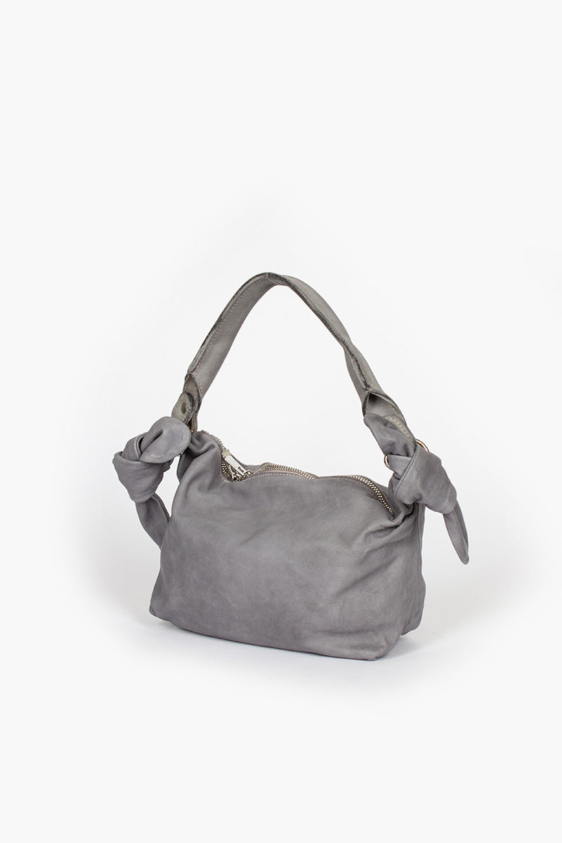 Guidi ND05 calf full grain shoulder bag in CO49T grey. Fixed shoulder strap with knot detailing, silver hardware, double zip fastening and internal zip pouch.