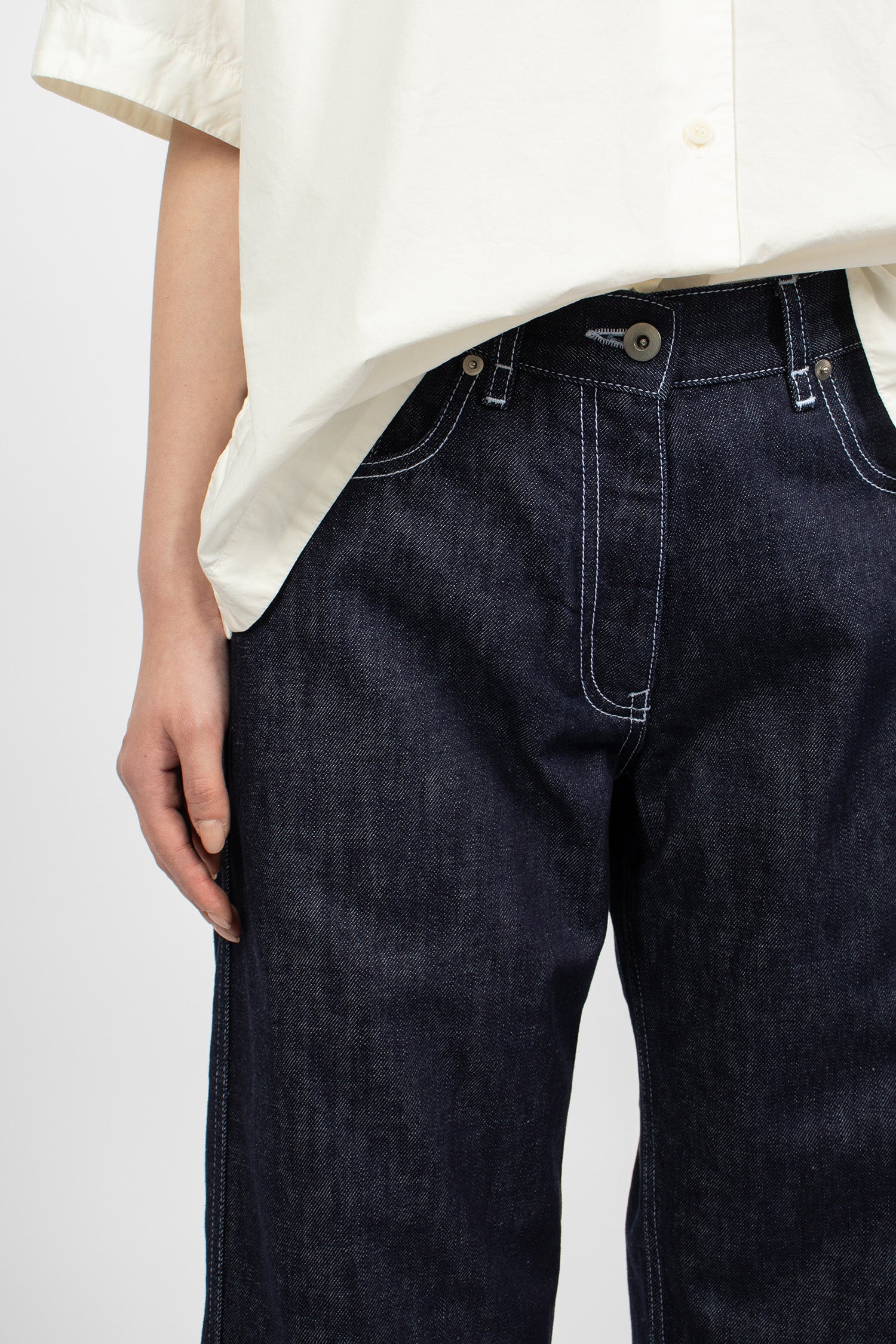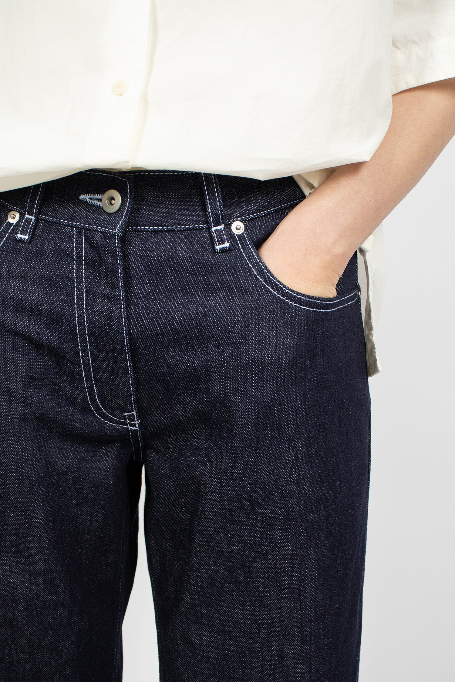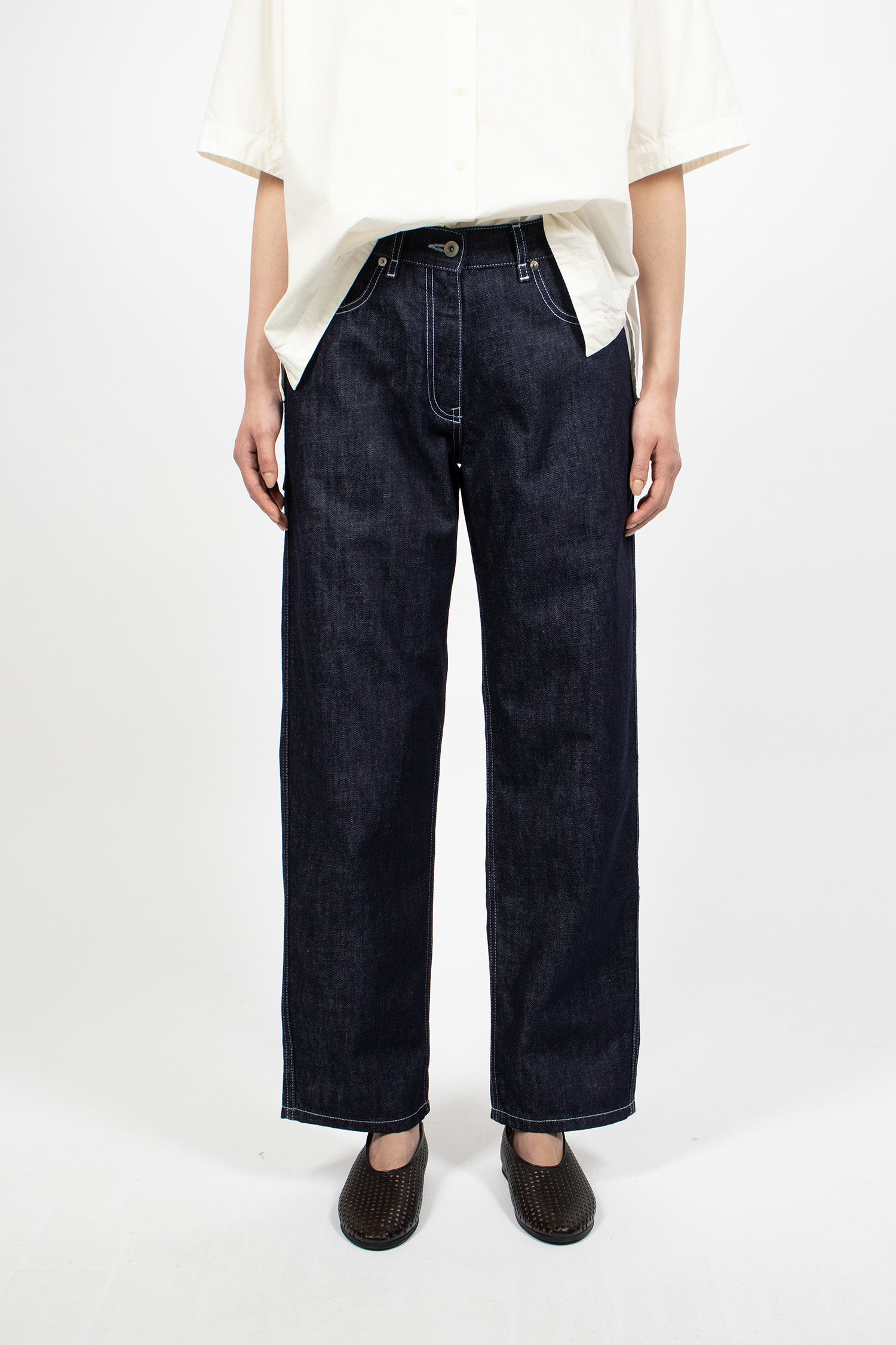 Casey Casey Paulo denim pants in indigo. Button and zip front fastening. Belt loops, classic 5-pocket style, leather tab at back. Contrast stitching throughout. Straight leg.