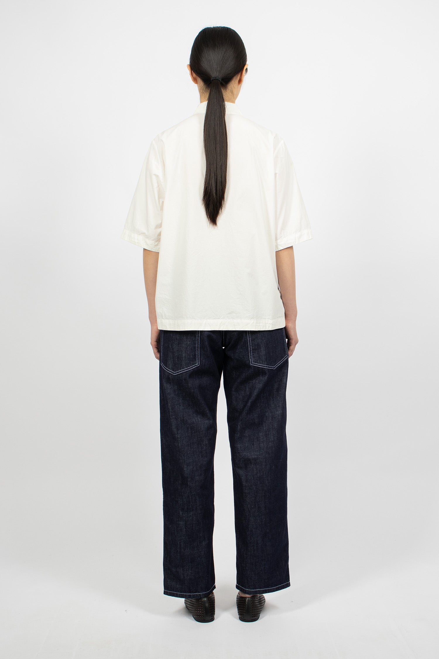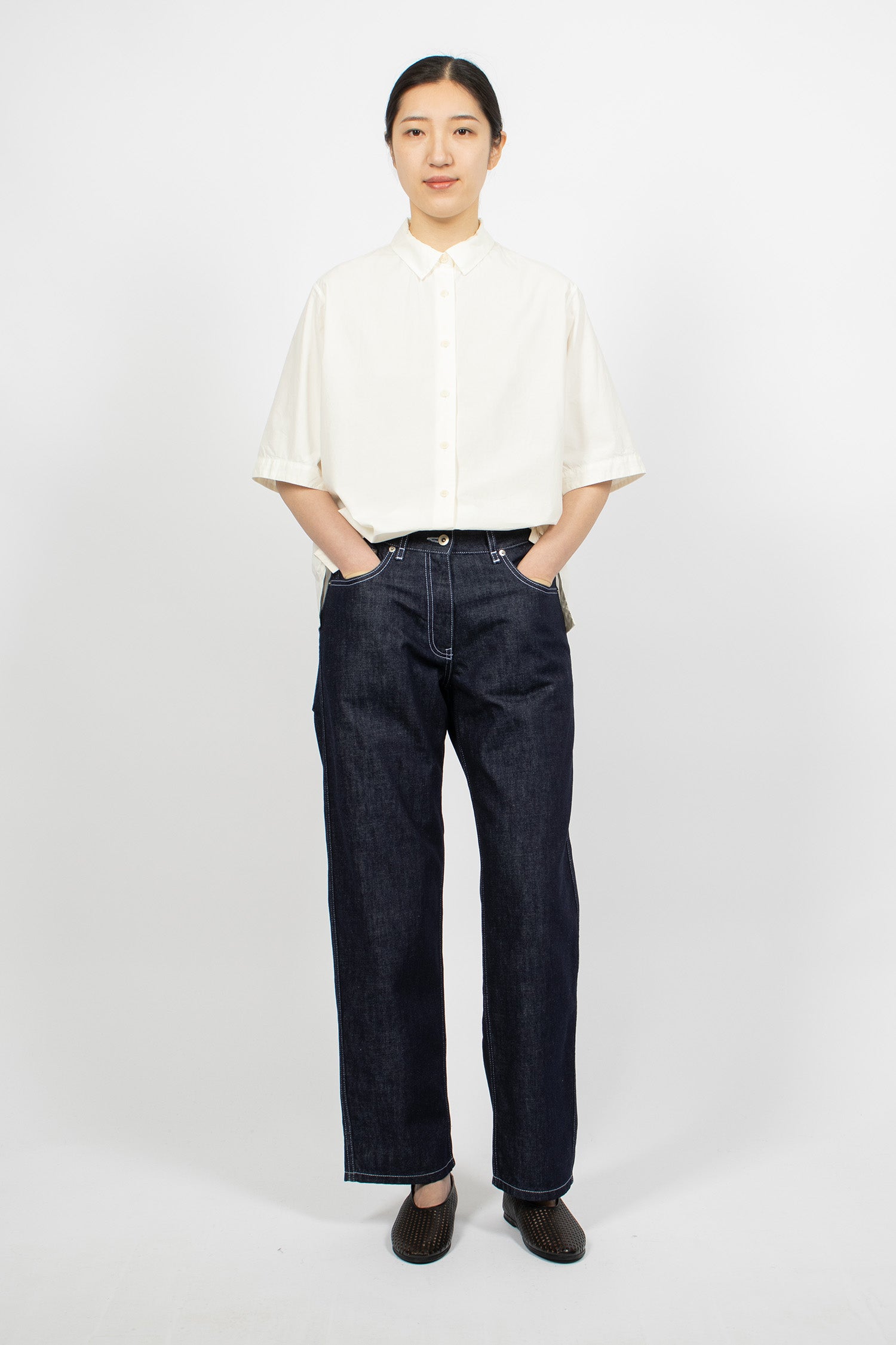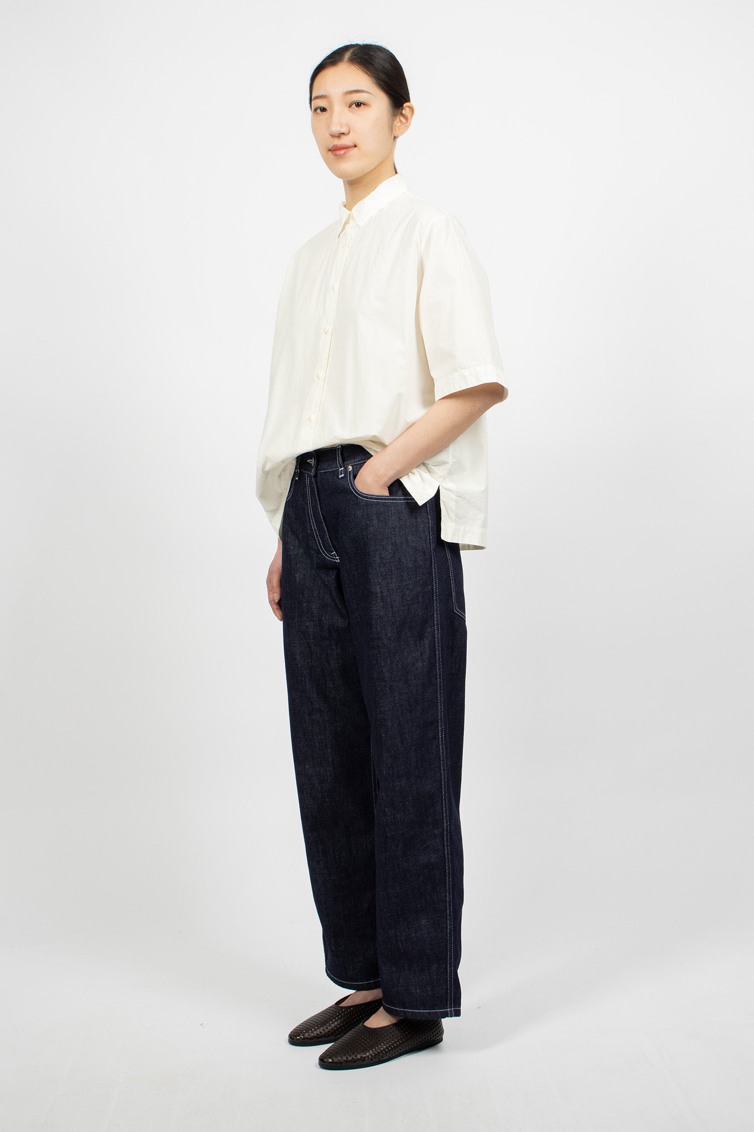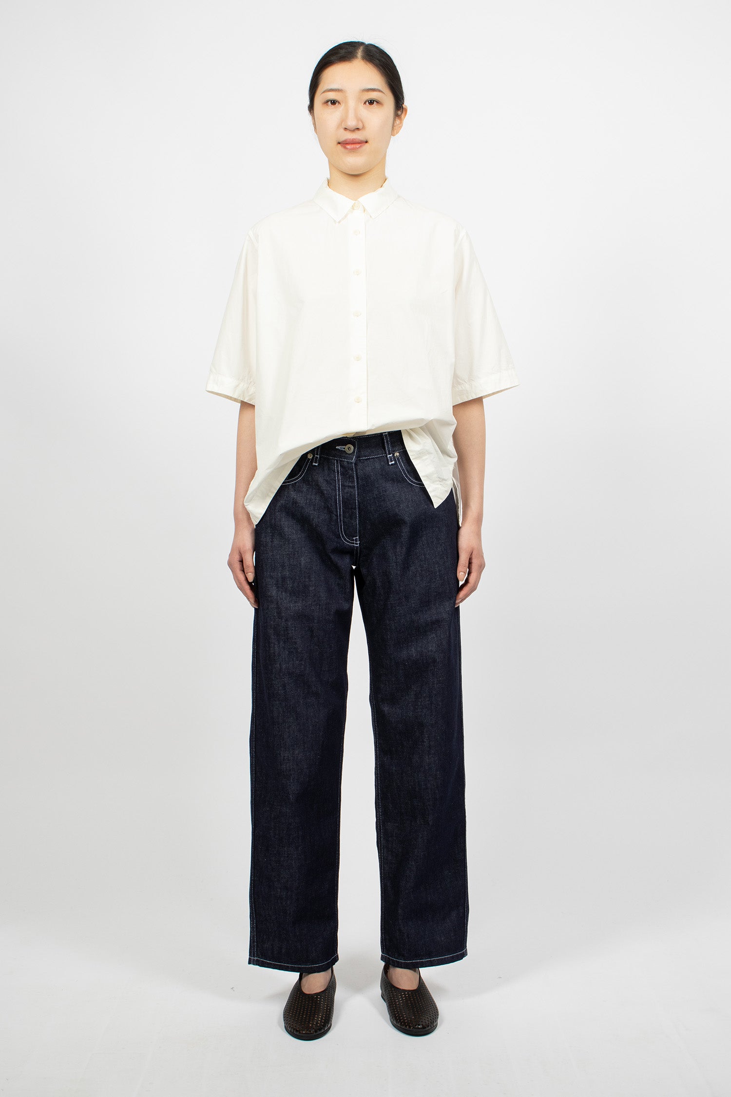 Casey Casey Paulo denim pants in indigo. Button and zip front fastening. Belt loops, classic 5-pocket style, leather tab at back. Contrast stitching throughout. Straight leg.