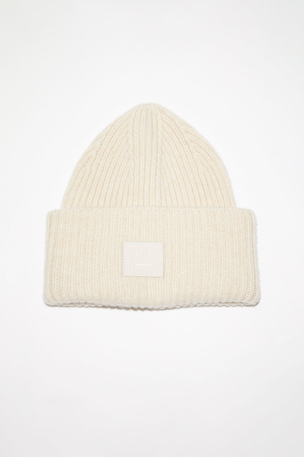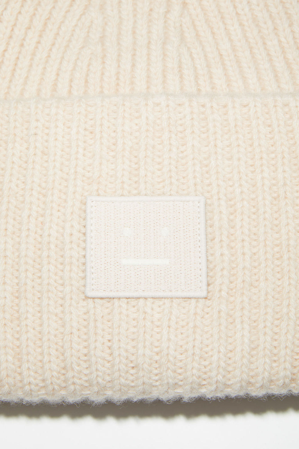 Acne Studios ribbed knit beanie in oatmeal melange. Tonal embroidered face patch at front cuff. Made with certified wool according to the Responsible Wool Standard. 100% wool, hand wash.