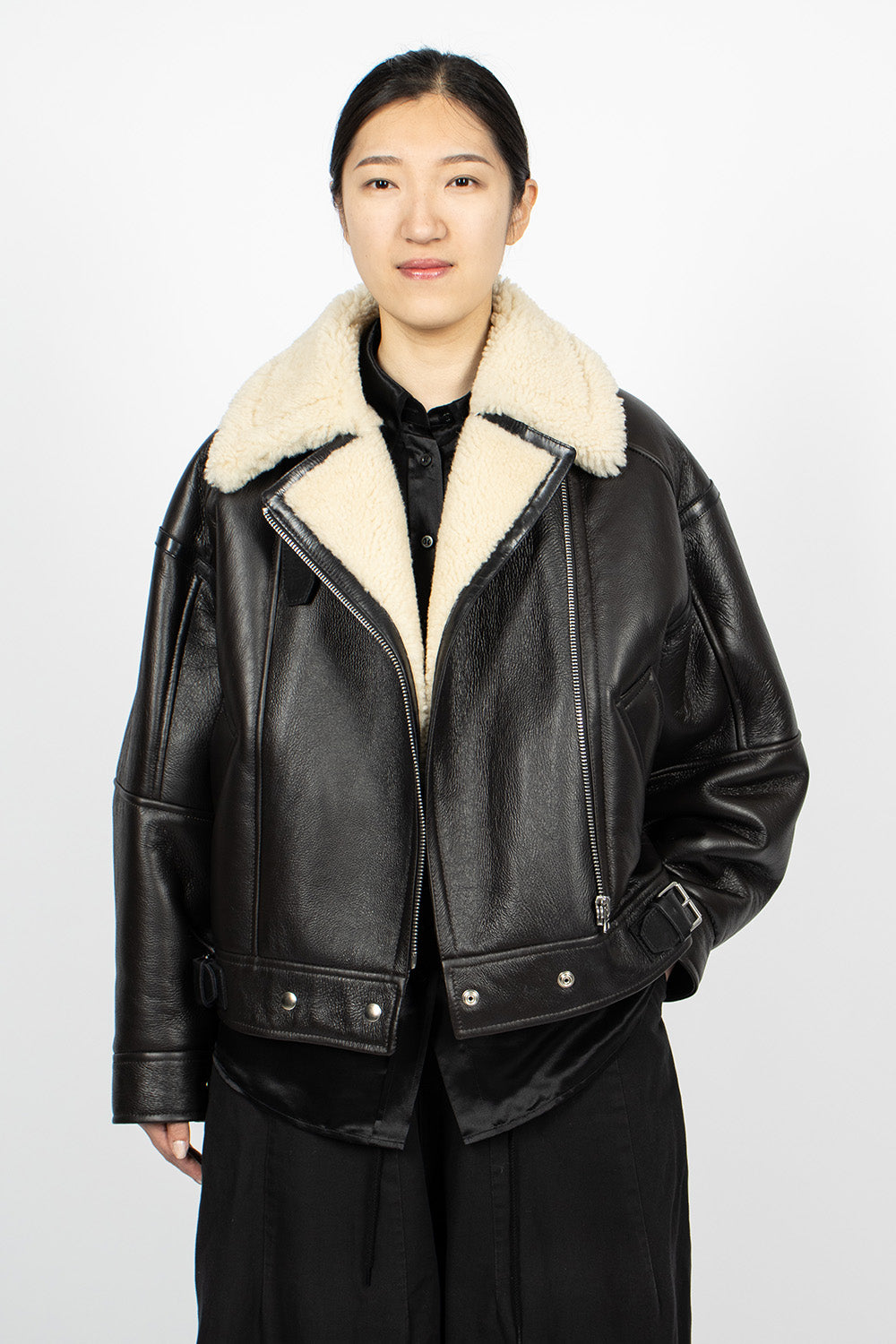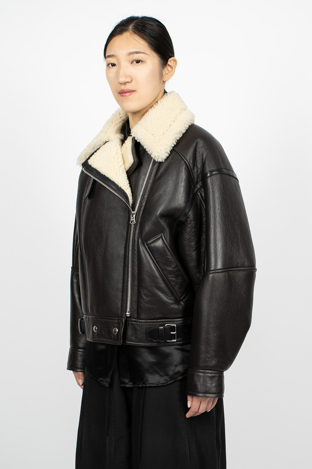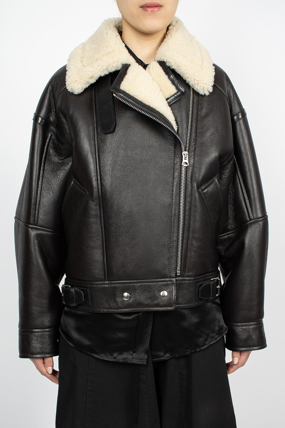 Acne Studios aviator style jacket in dark brown grained leather. Oversized lamb shearling collar with adjustable buckle at underside. Front zip fastening, long sleeves with snap button cuff, side welt pockets, cinch buckles at cropped waist and snap button closure. Lamb shearling lining. 100% calf leather outer.