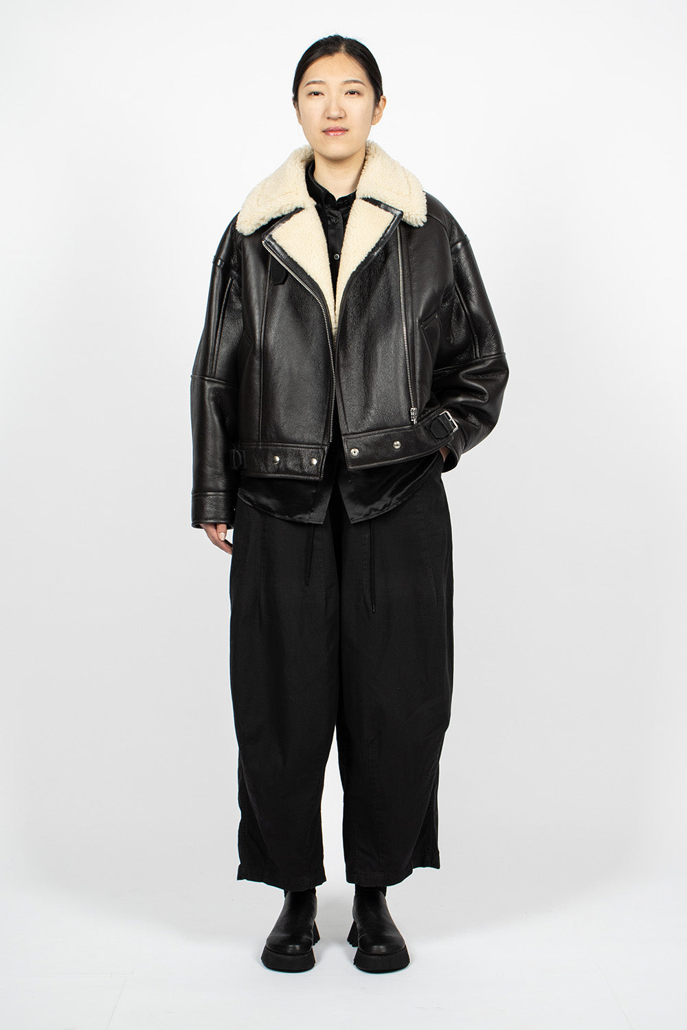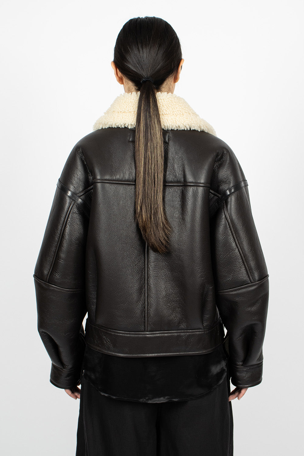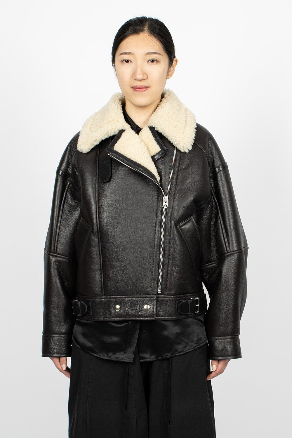 Acne Studios aviator style jacket in dark brown grained leather. Oversized lamb shearling collar with adjustable buckle at underside. Front zip fastening, long sleeves with snap button cuff, side welt pockets, cinch buckles at cropped waist and snap button closure. Lamb shearling lining. 100% calf leather outer.
