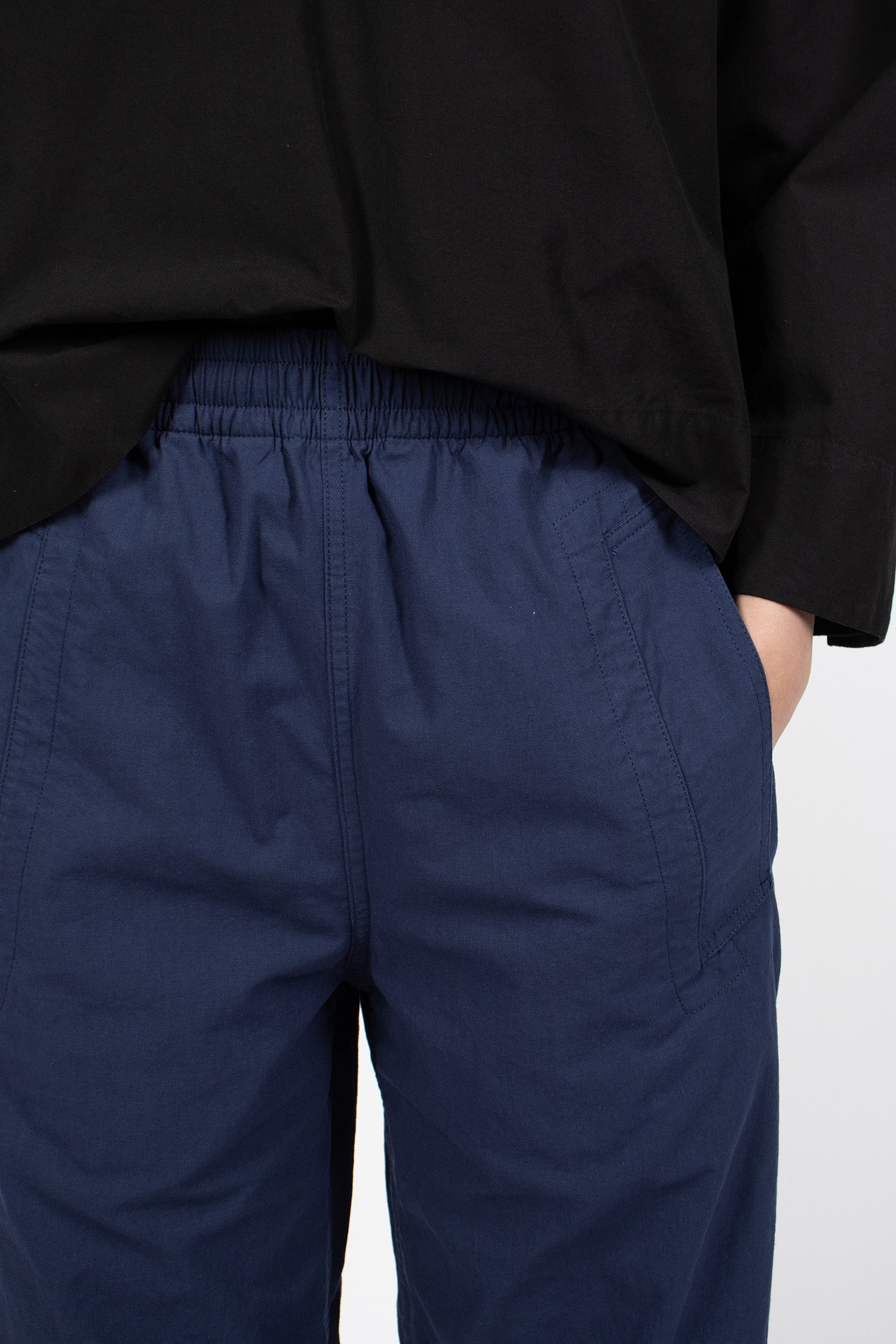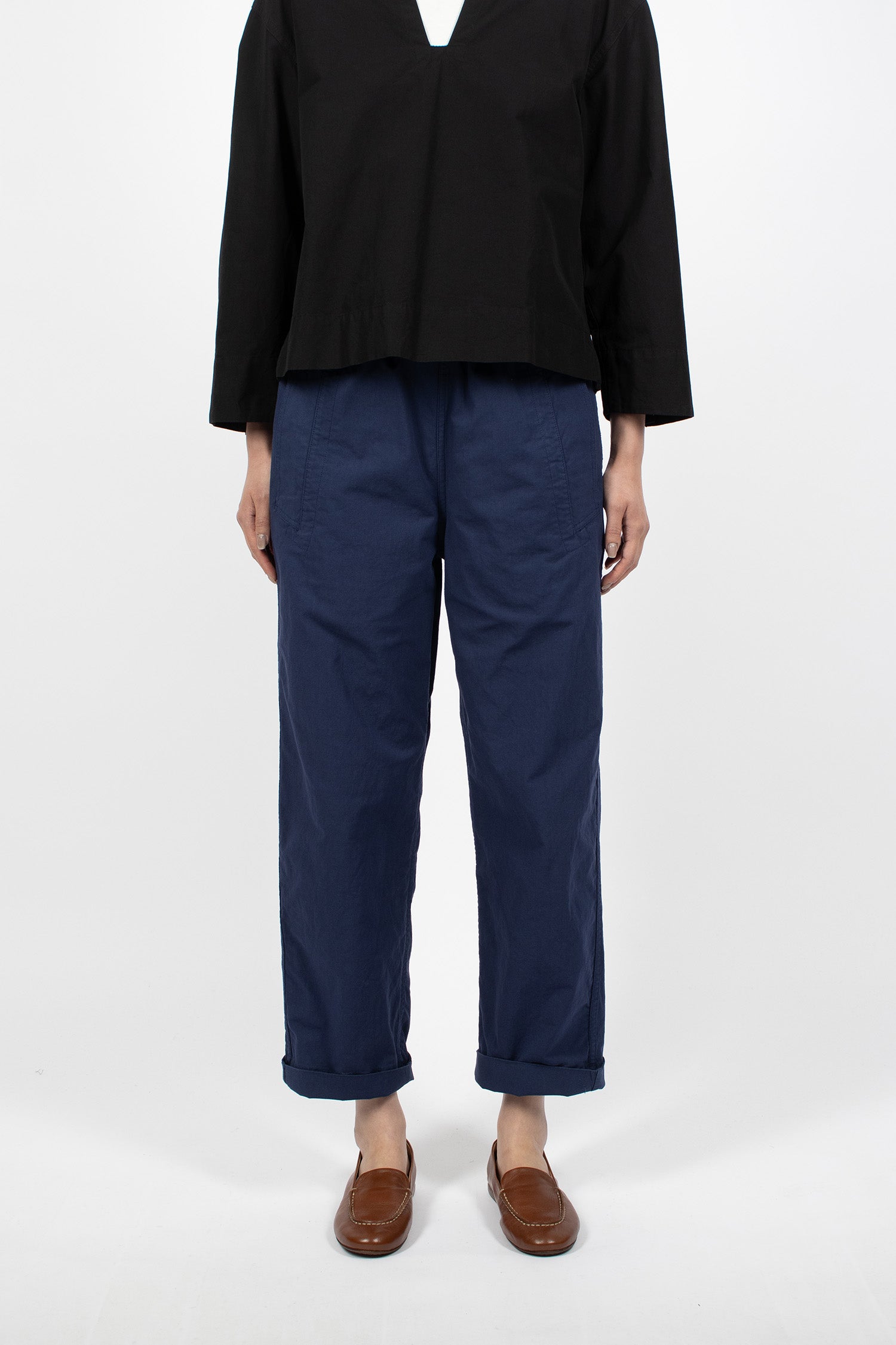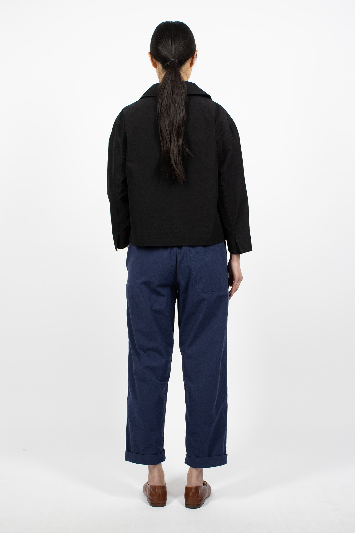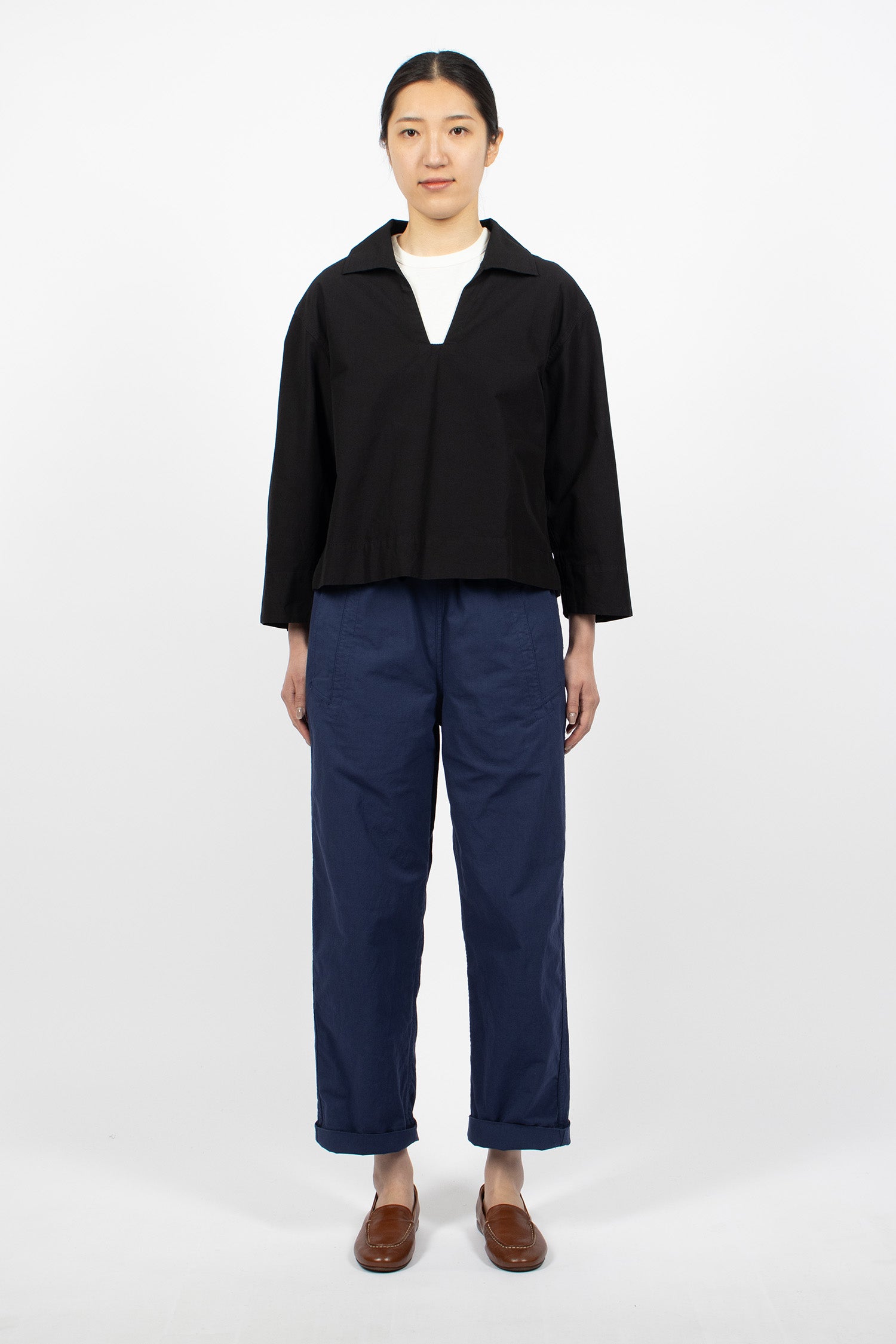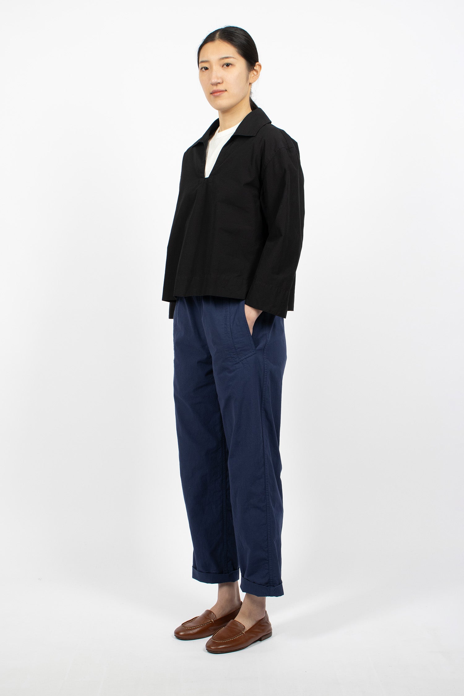 Margaret Howell MHL smock shirt in lightweight black indigo dyed cotton plainweave with a dry hand feel. Collar with open neck, dropped shoulder, long sleeve. Side split cuff and hem. Pull-on shirt in cropped, relaxed fit.