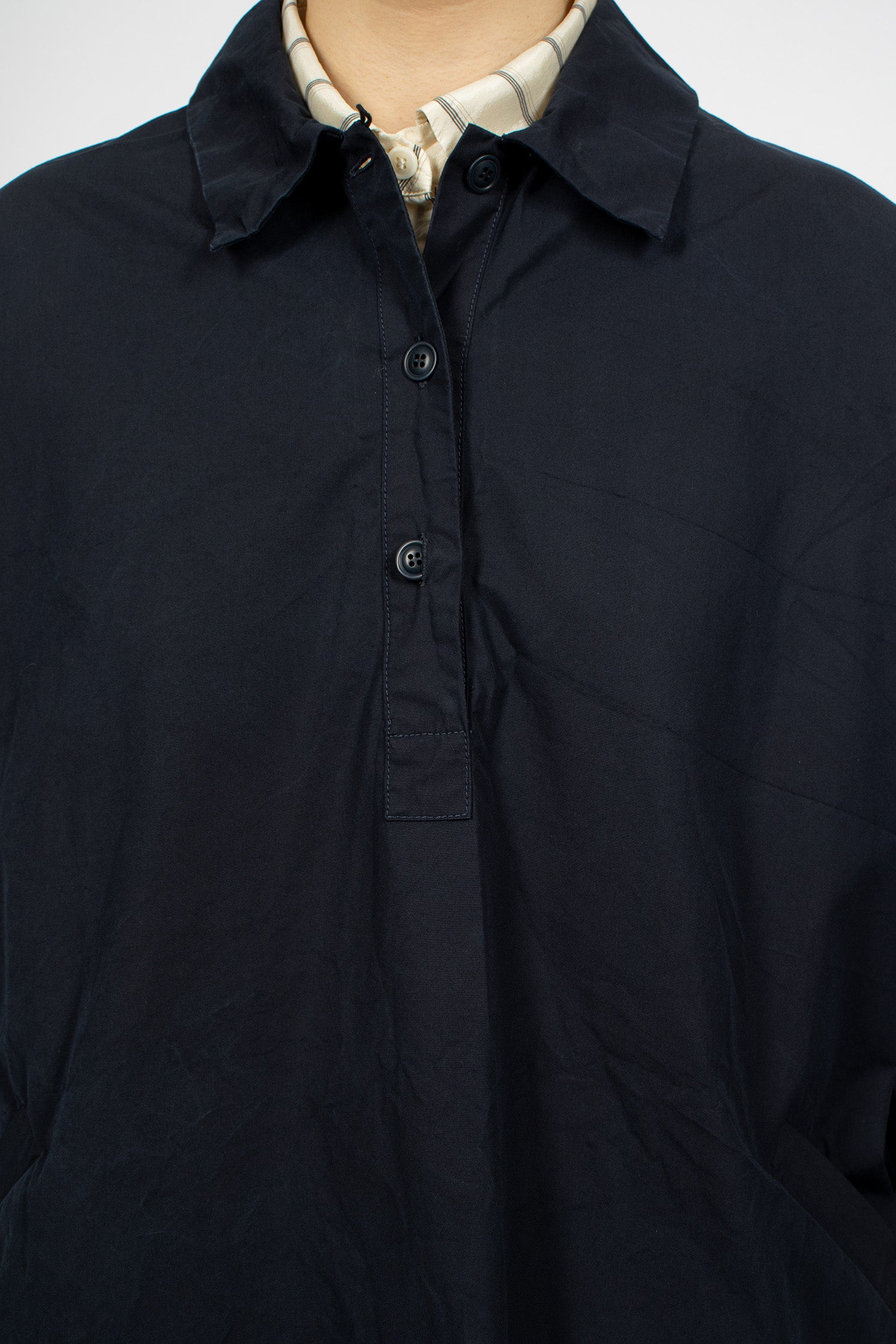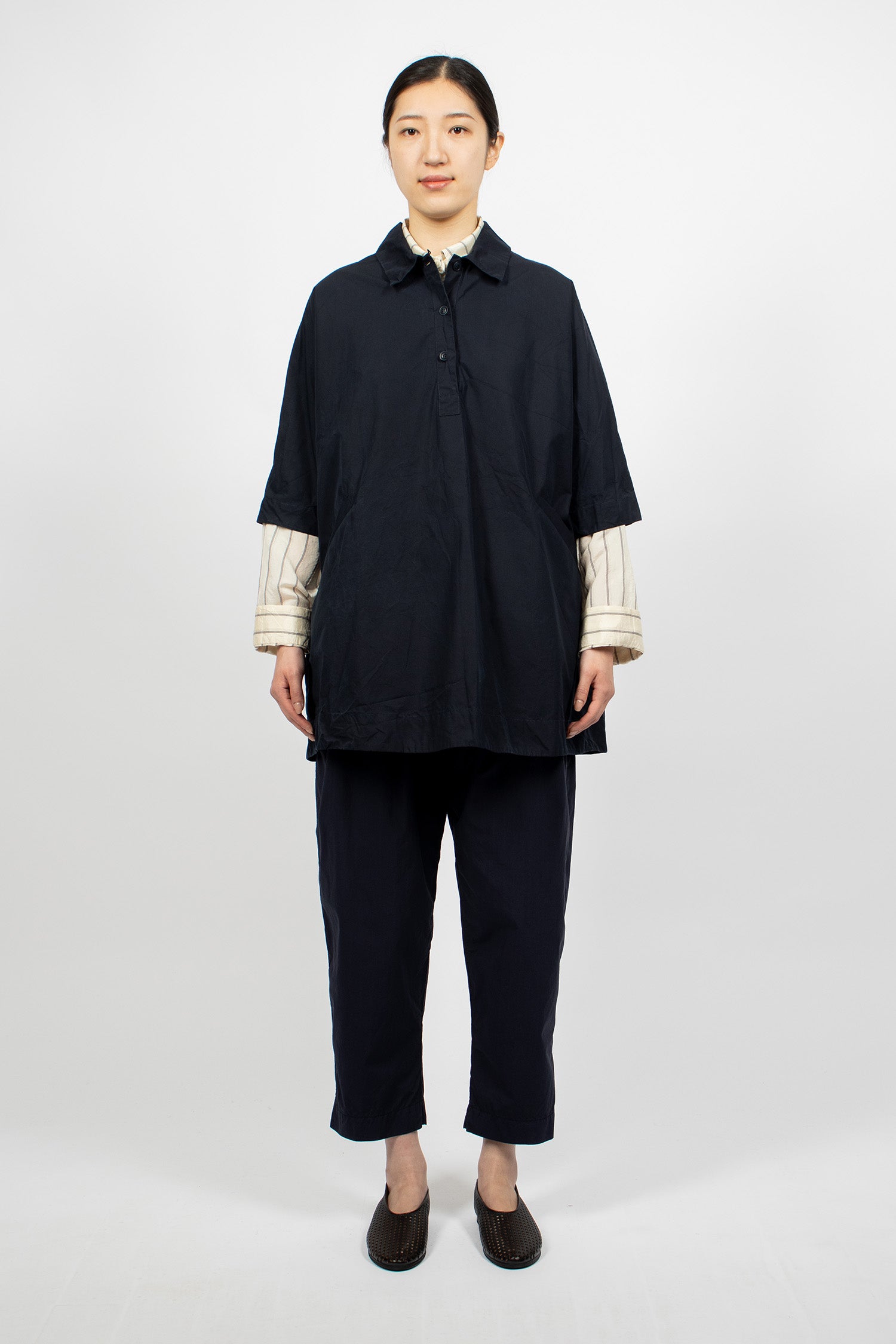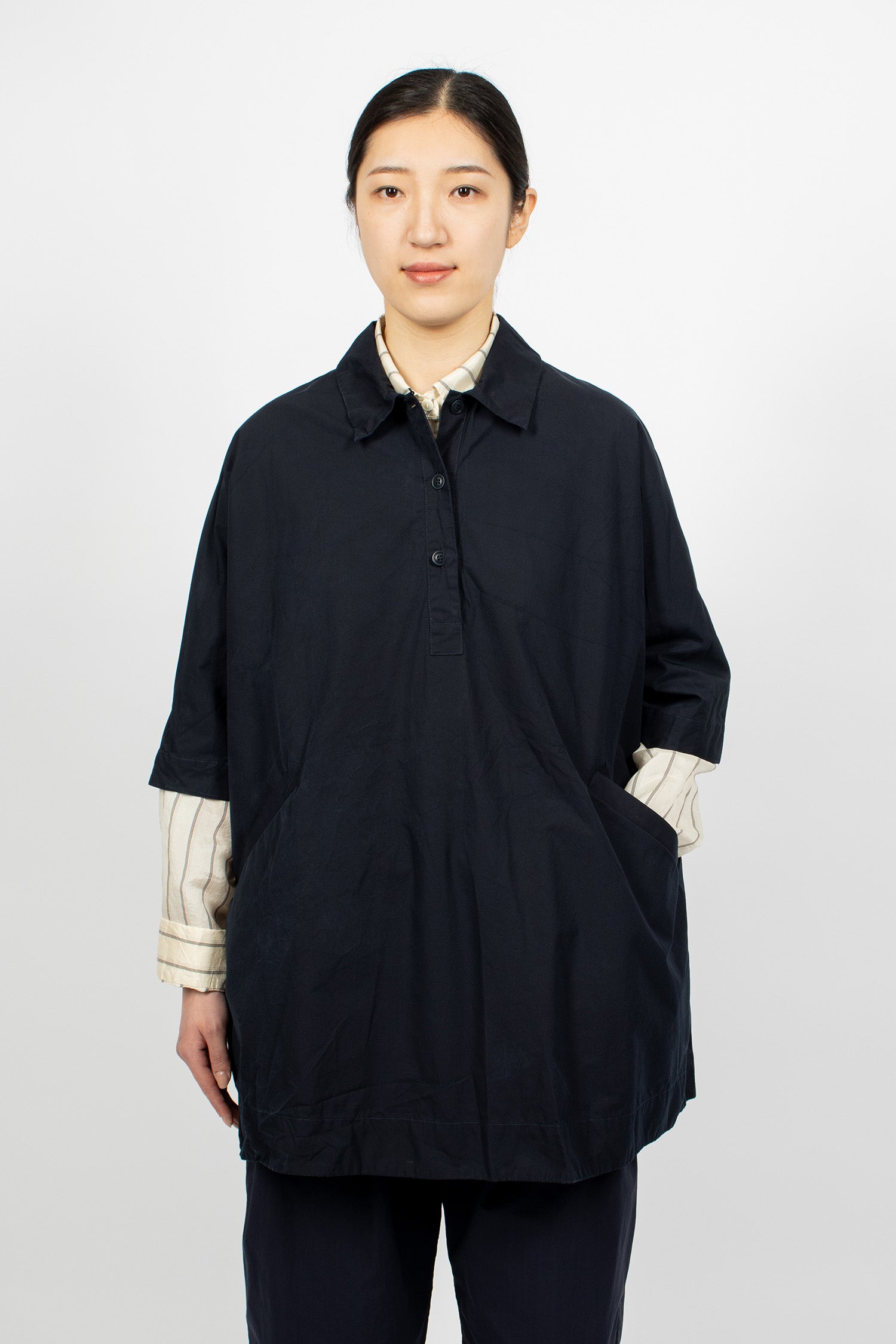 Casey Casey Tatiana tunic top in night card cotton. Collar with half button placket fastening, short dolman sleeve. Slash welt pockets on the front. Dropped back with pleated detailing. Relaxed, loose fit. Washed finish.