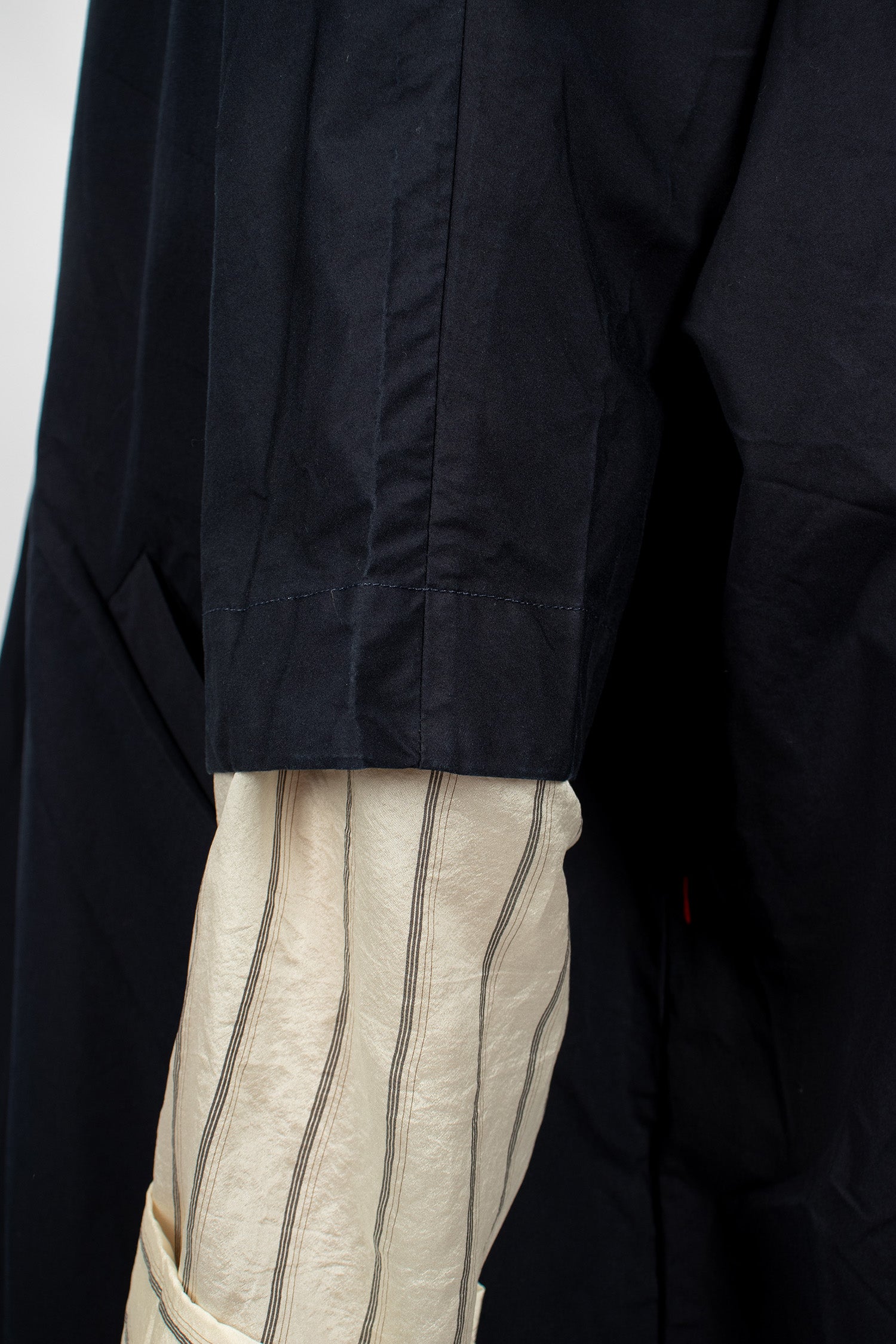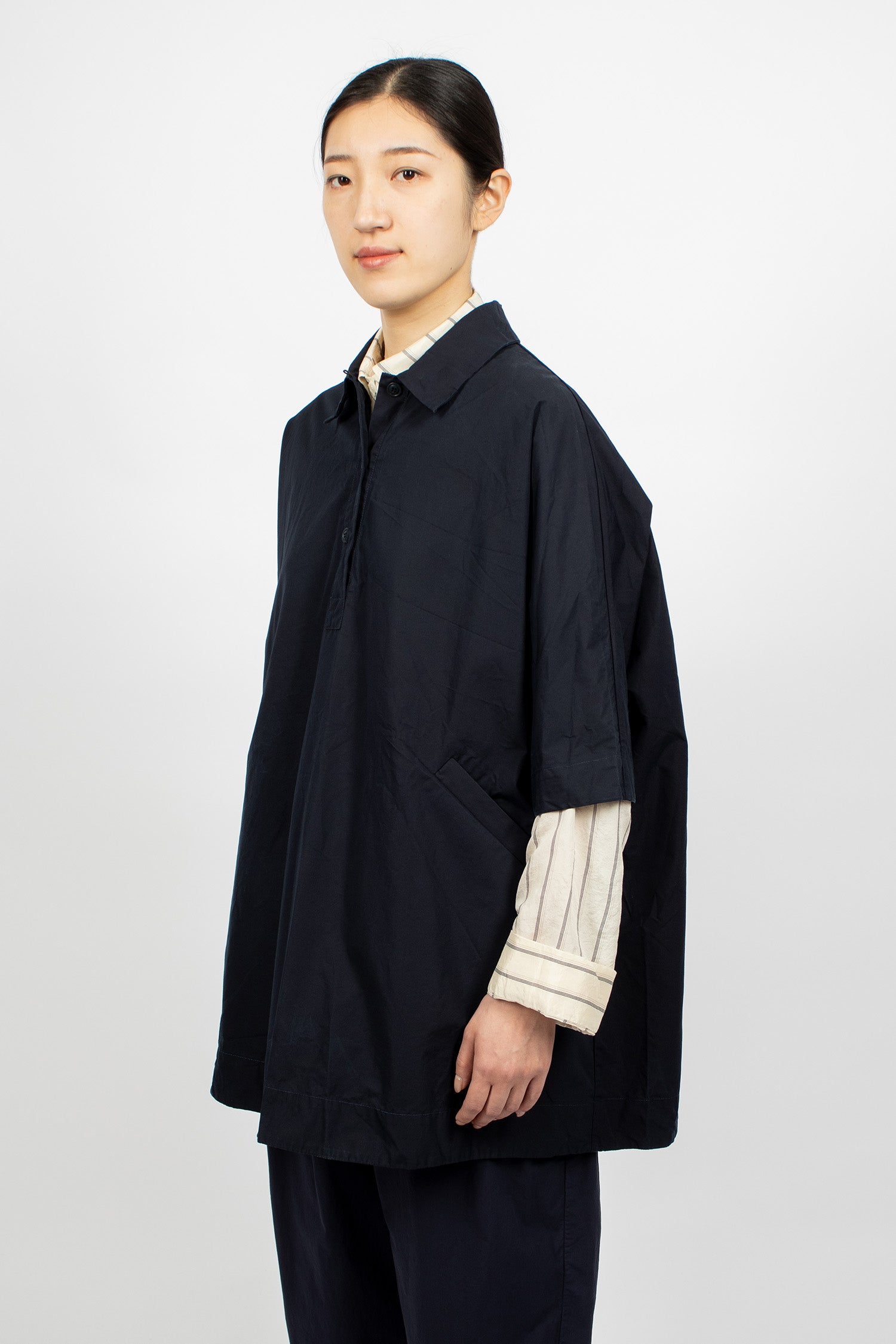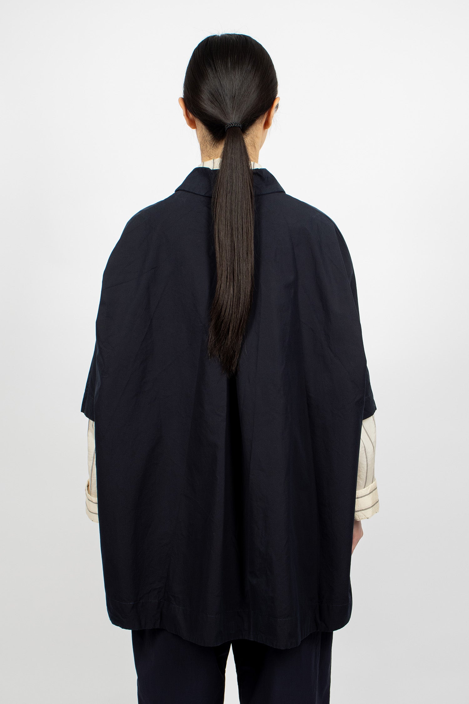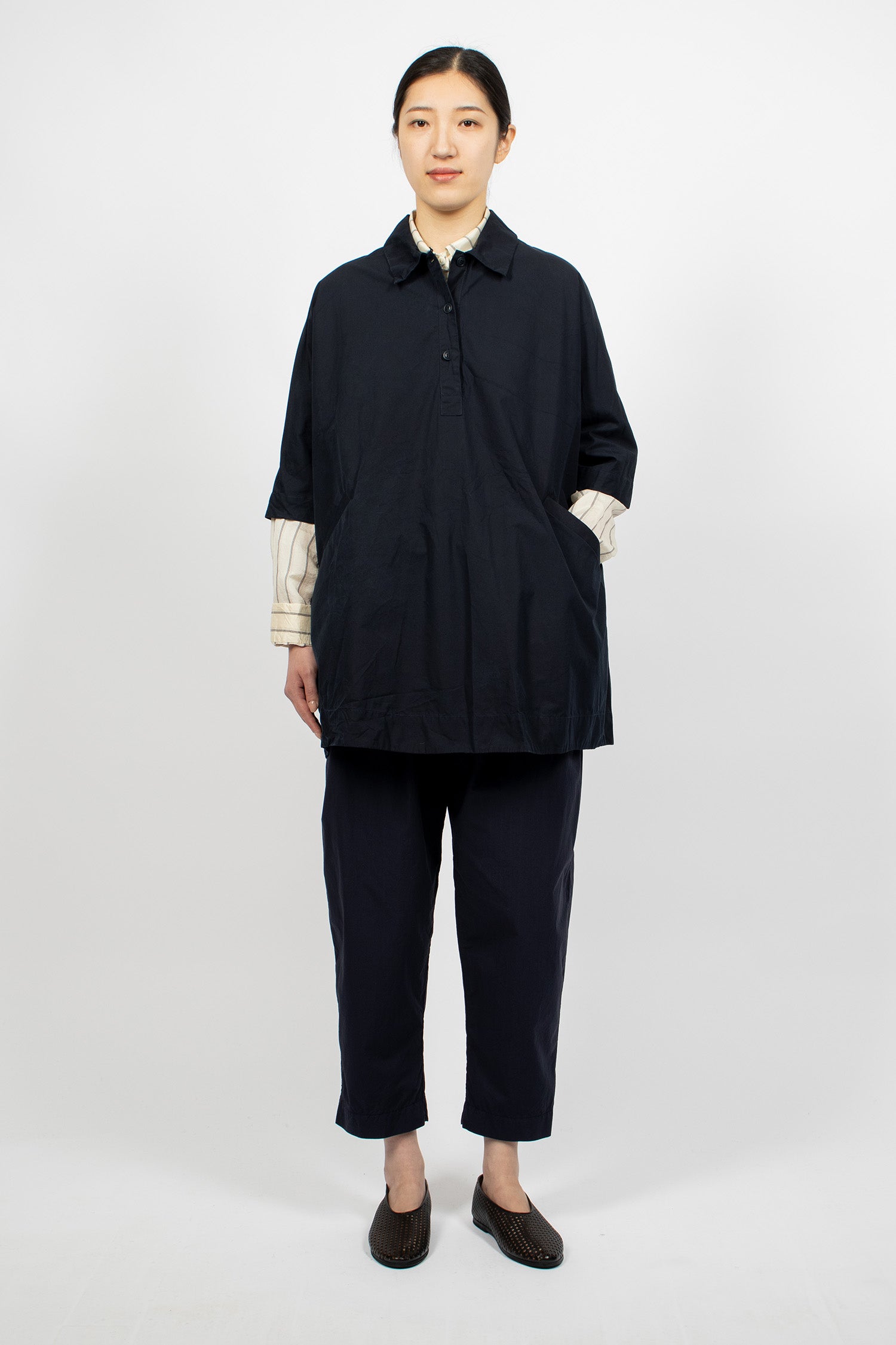 Casey Casey Tatiana tunic top in night card cotton. Collar with half button placket fastening, short dolman sleeve. Slash welt pockets on the front. Dropped back with pleated detailing. Relaxed, loose fit. Washed finish.
