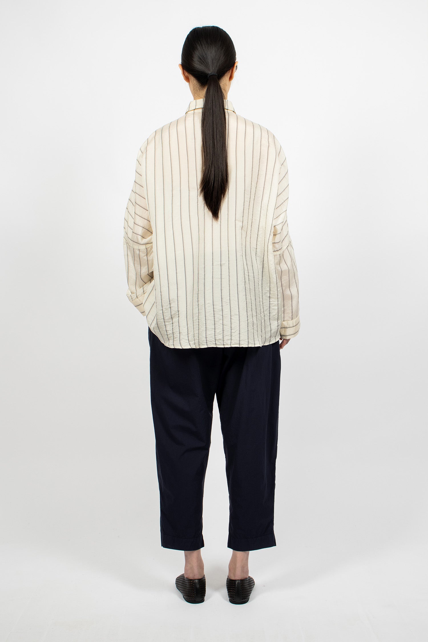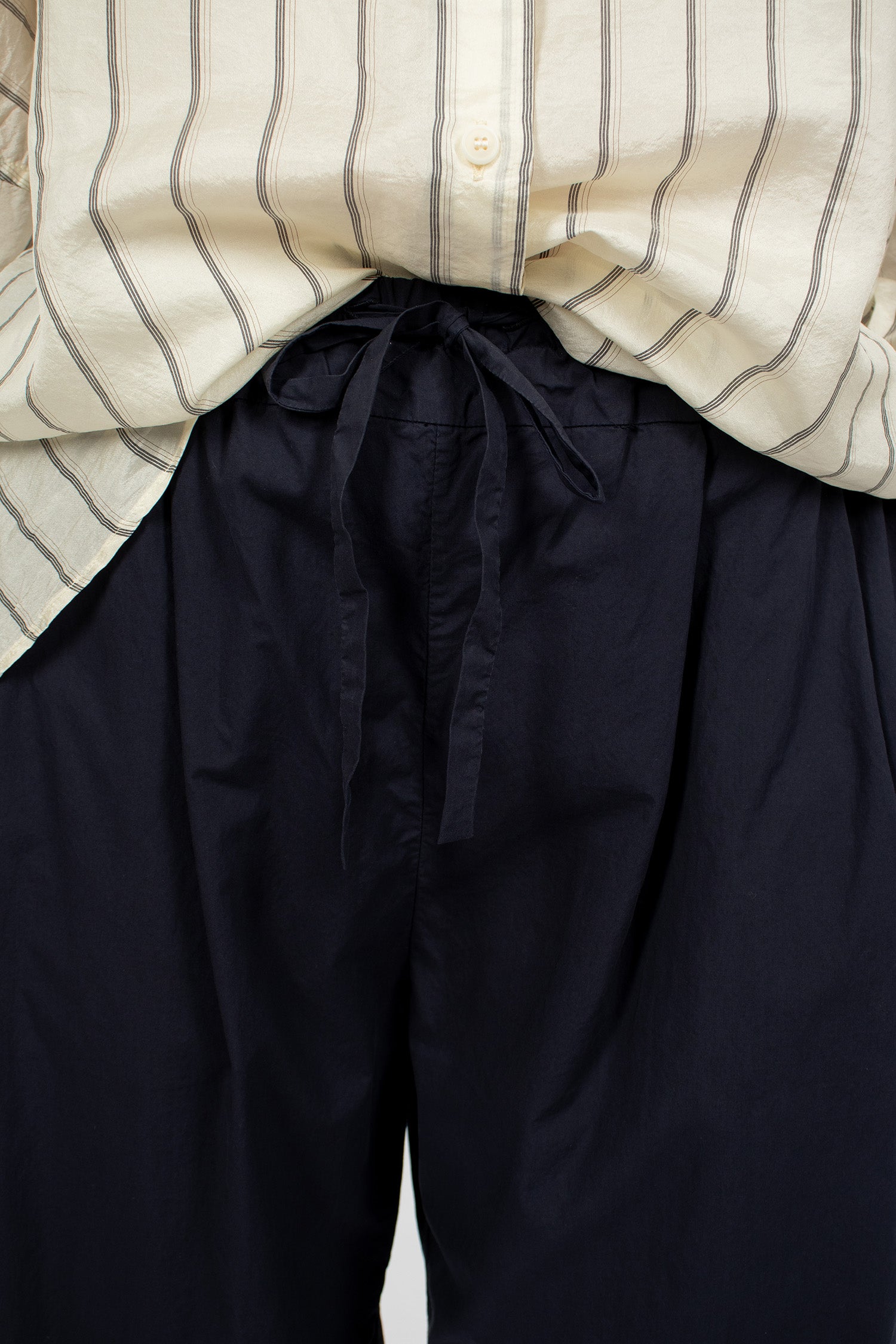 Casey Casey Tippy pant in night. Elasticated waist with drawstring fastening. Gathered detailing below waist with front pleats. Dropped rise and side seam pocket. Lightweight pant with tapered cropped leg.