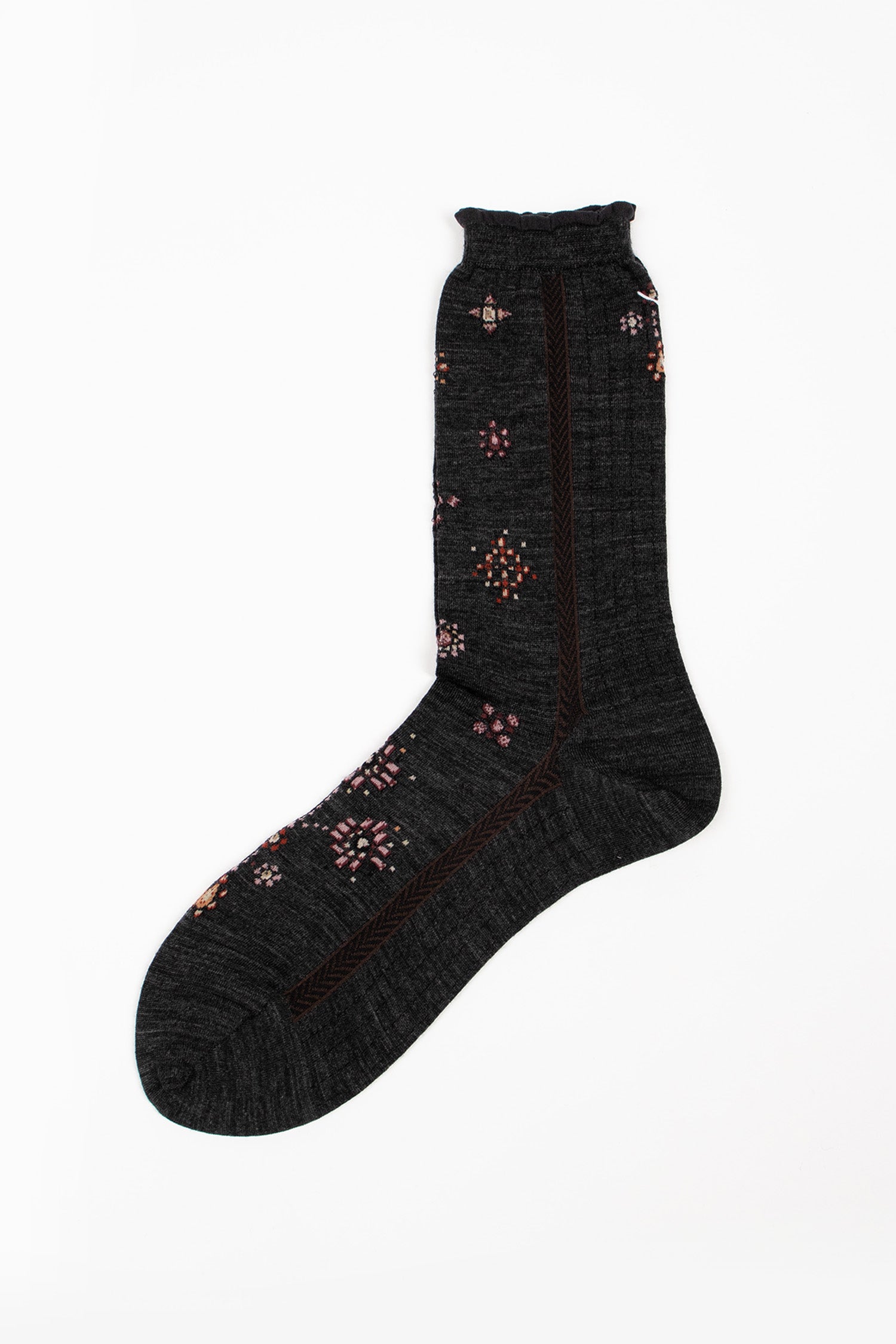Antipast AM-677C ring ring ring socks in sage. Elasticated cuff with frill, circle and dot pattern throughout, Antipast at base.