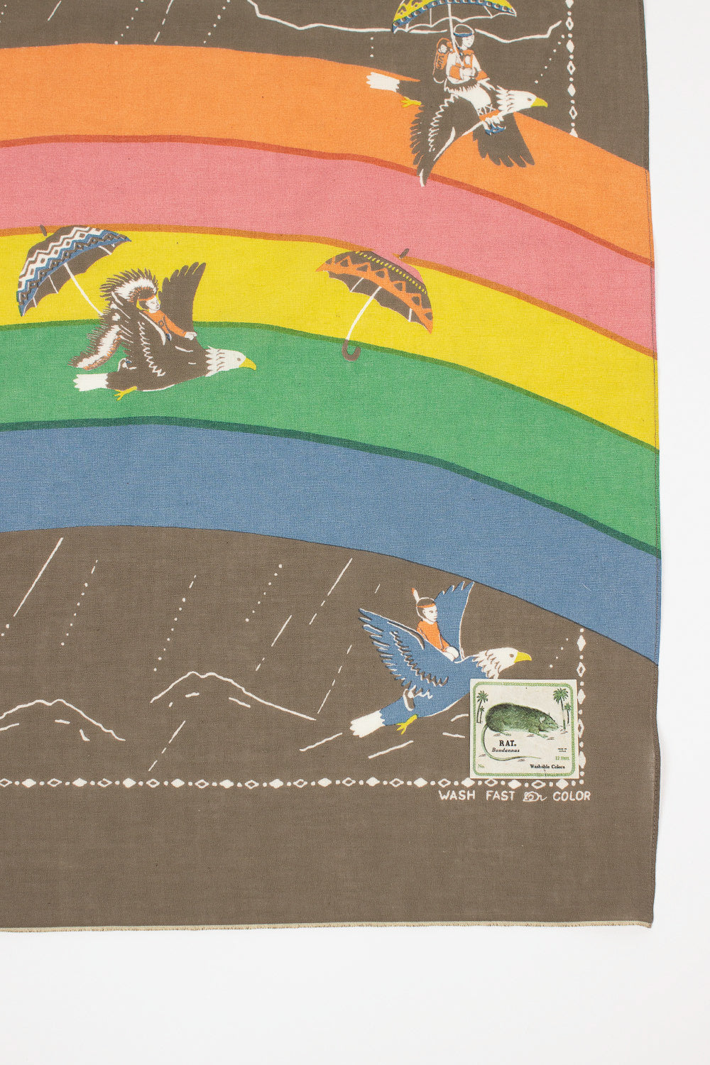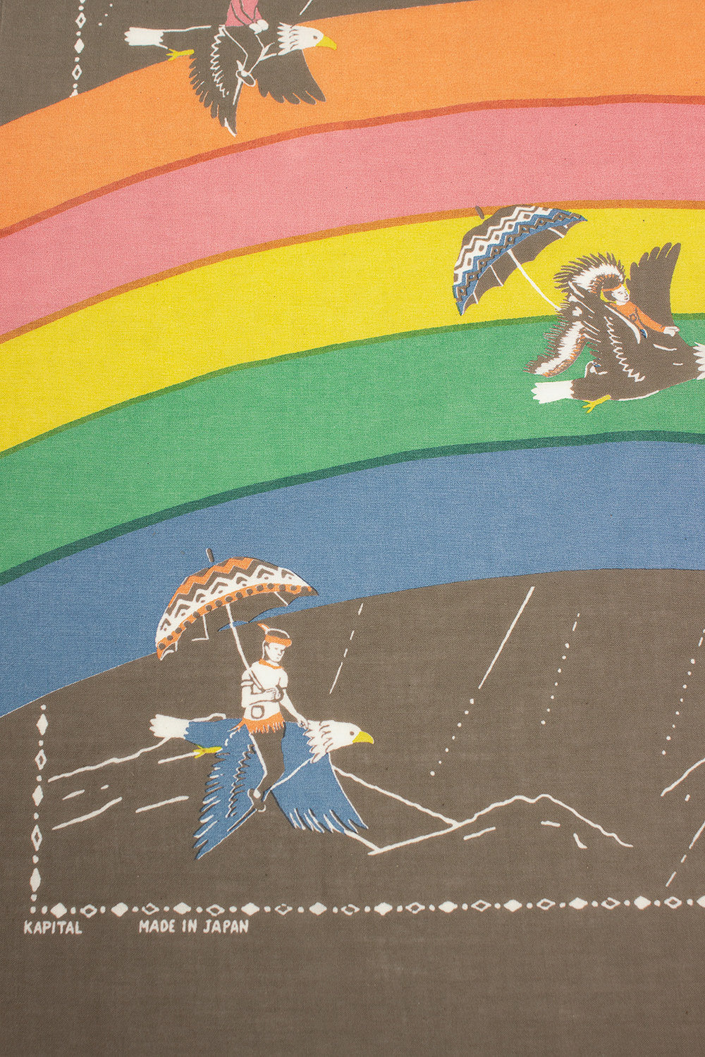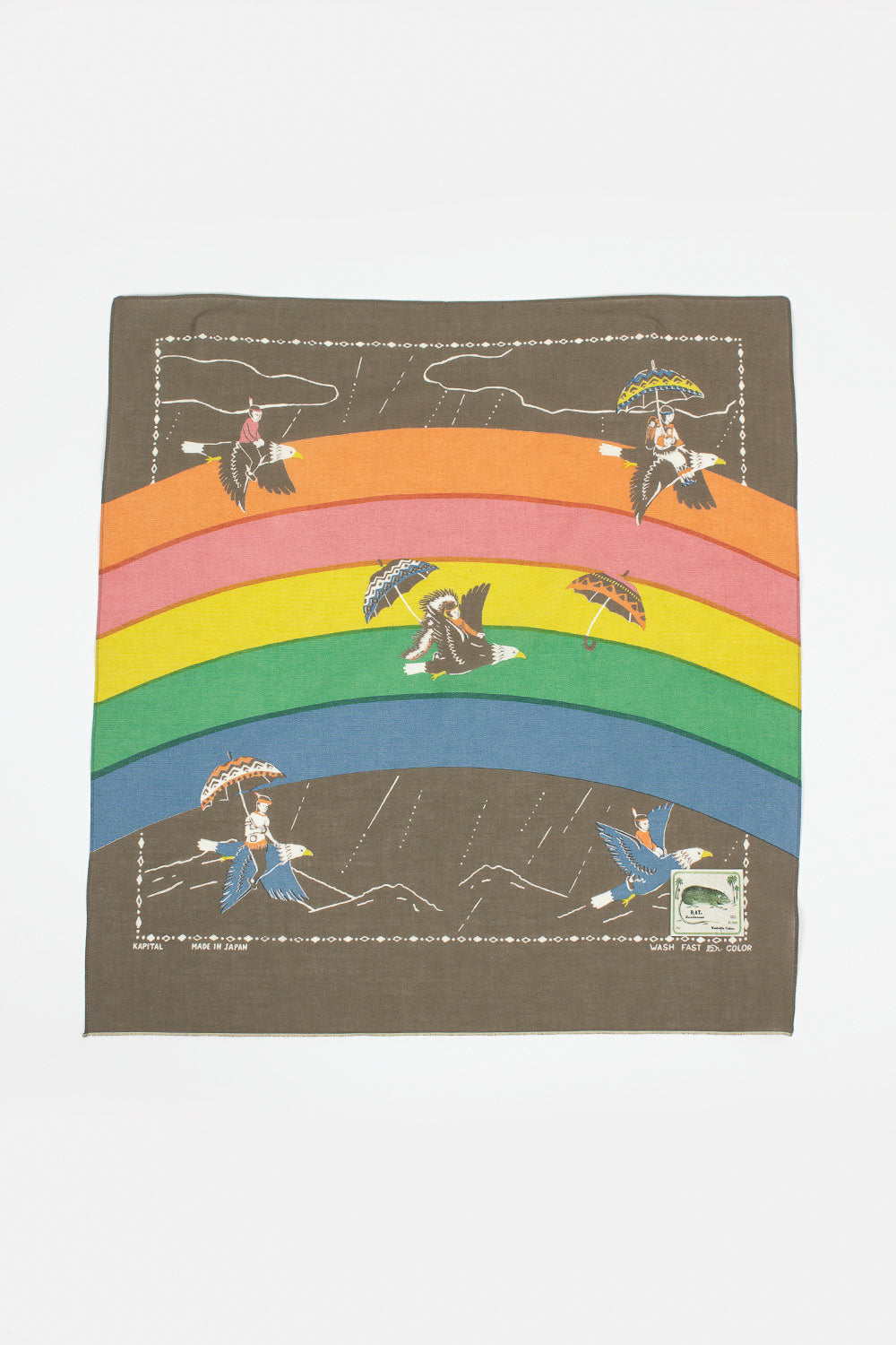 Kapital selvedge fastcolour bandana in khaki with rainbow and birds print. Hem detail with border print and printed Kapital branding. 100% cotton, machine wash. Made in Japan.