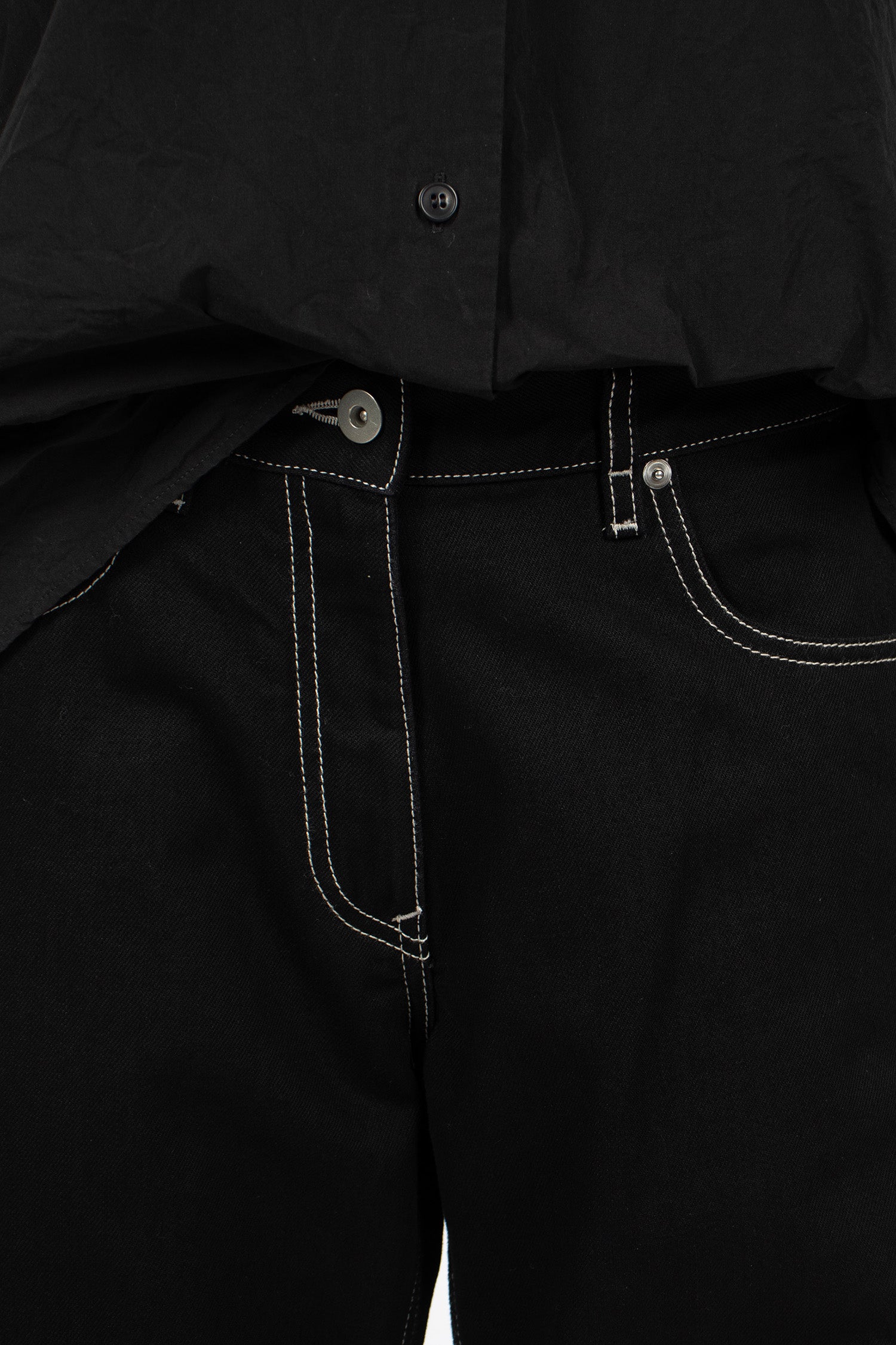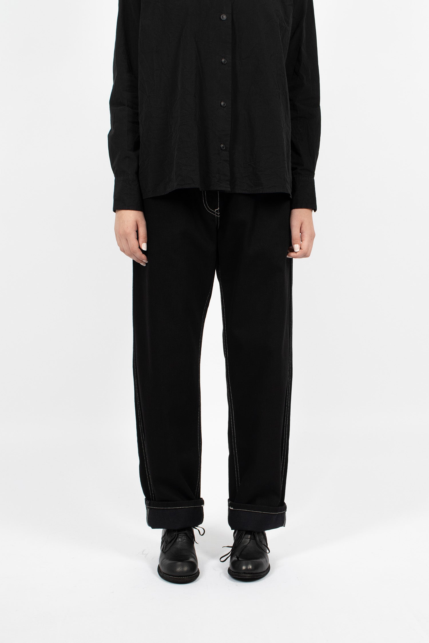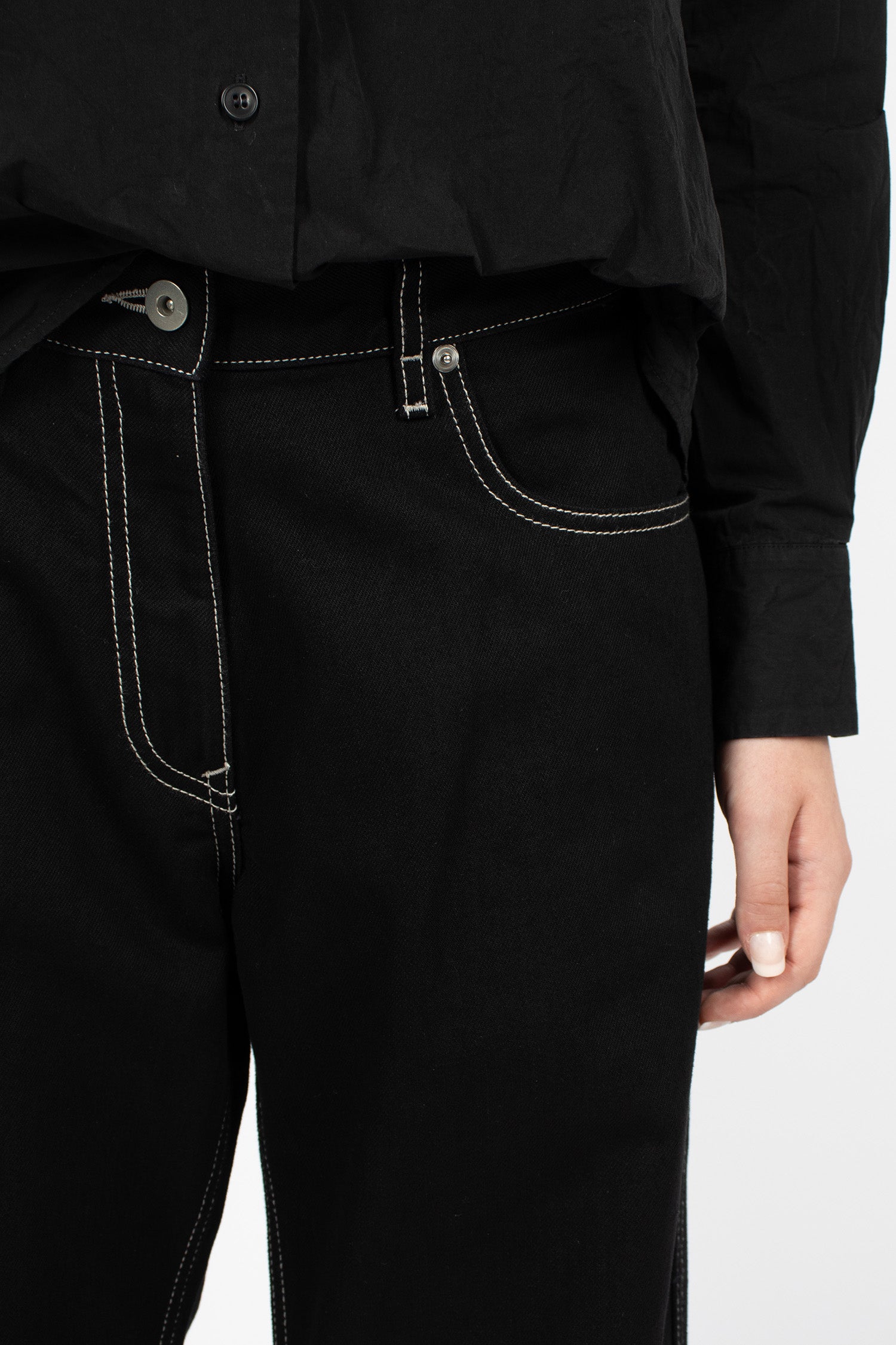 Casey Casey Paulo denim pants in black. Button and zip front fastening. Belt loops, classic 5-pocket style, leather tab at back. Contrast stitching throughout. Straight leg.
