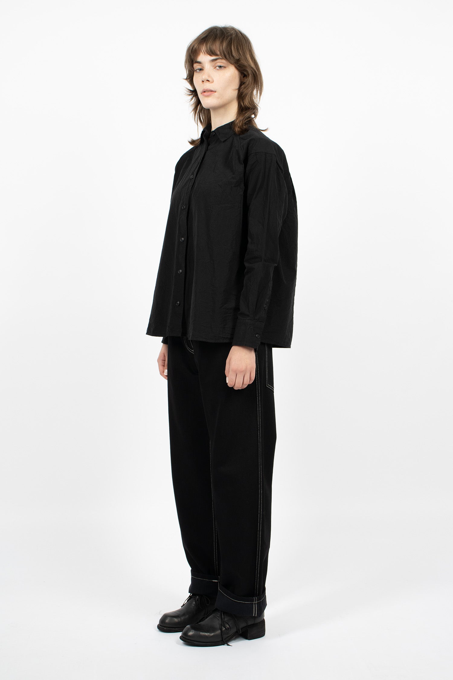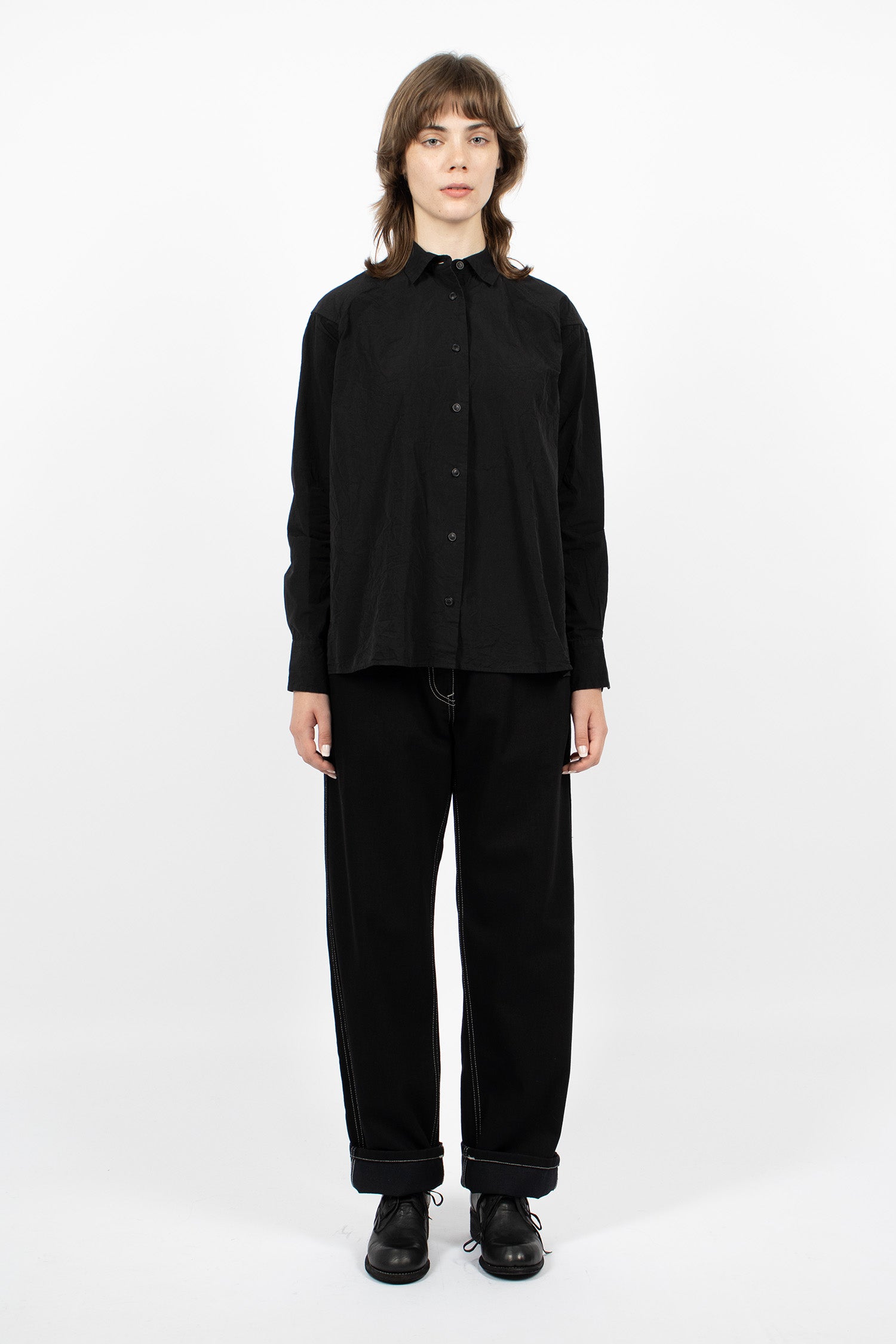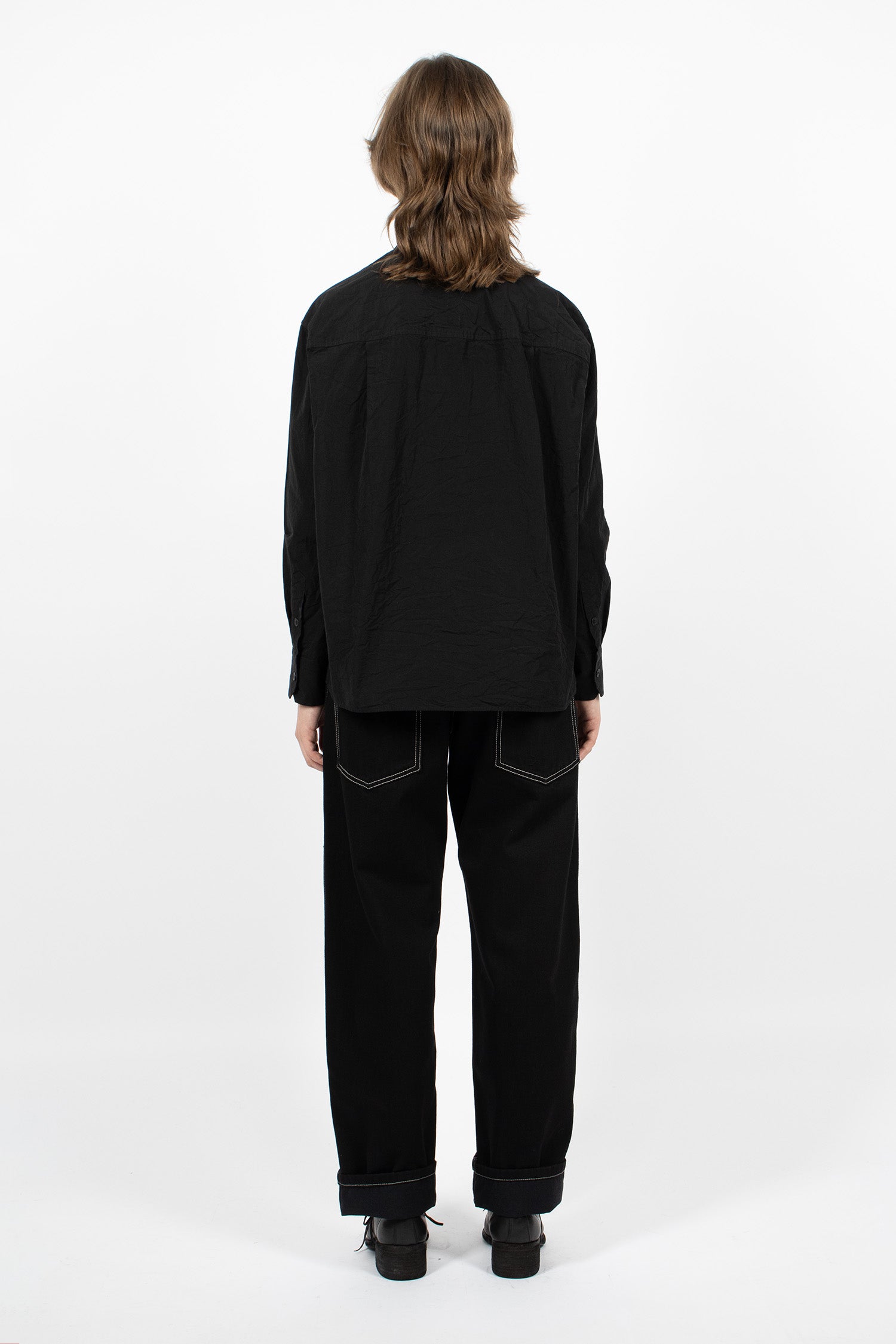 Casey Casey Paulo denim pants in black. Button and zip front fastening. Belt loops, classic 5-pocket style, leather tab at back. Contrast stitching throughout. Straight leg.