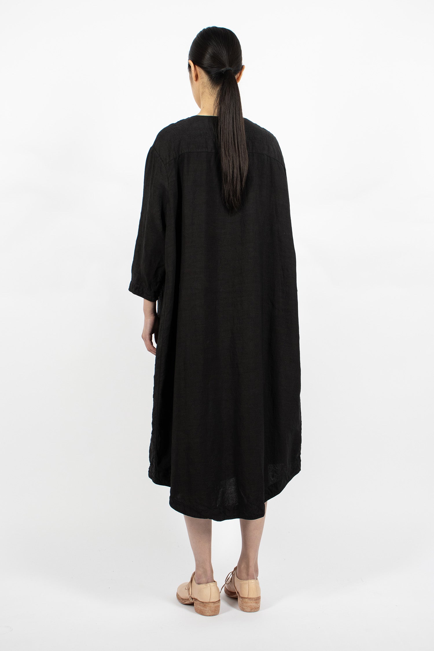 Chez Vidalenc Juliet dress in black antique linen. Square neckline with dropped shoulder, long sleeves, wide patch pockets and maxi length. Relaxed fit.