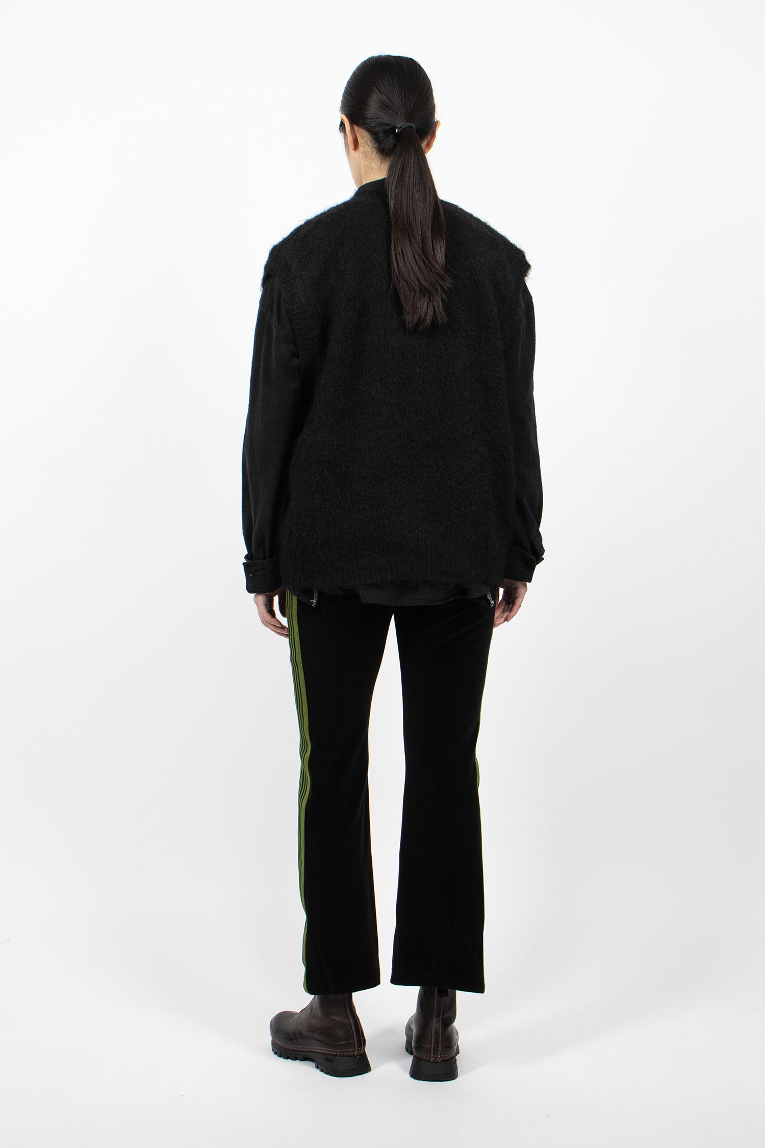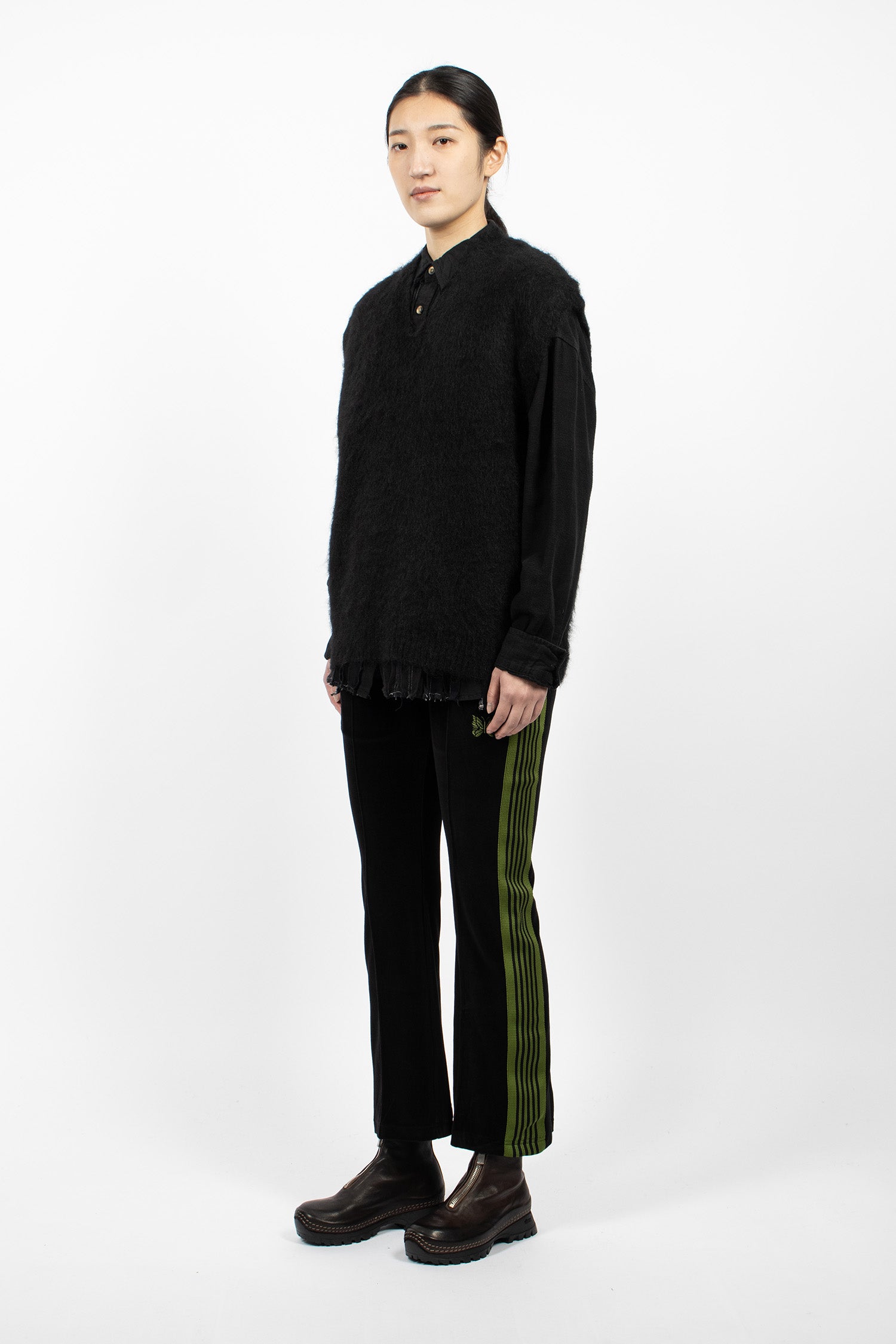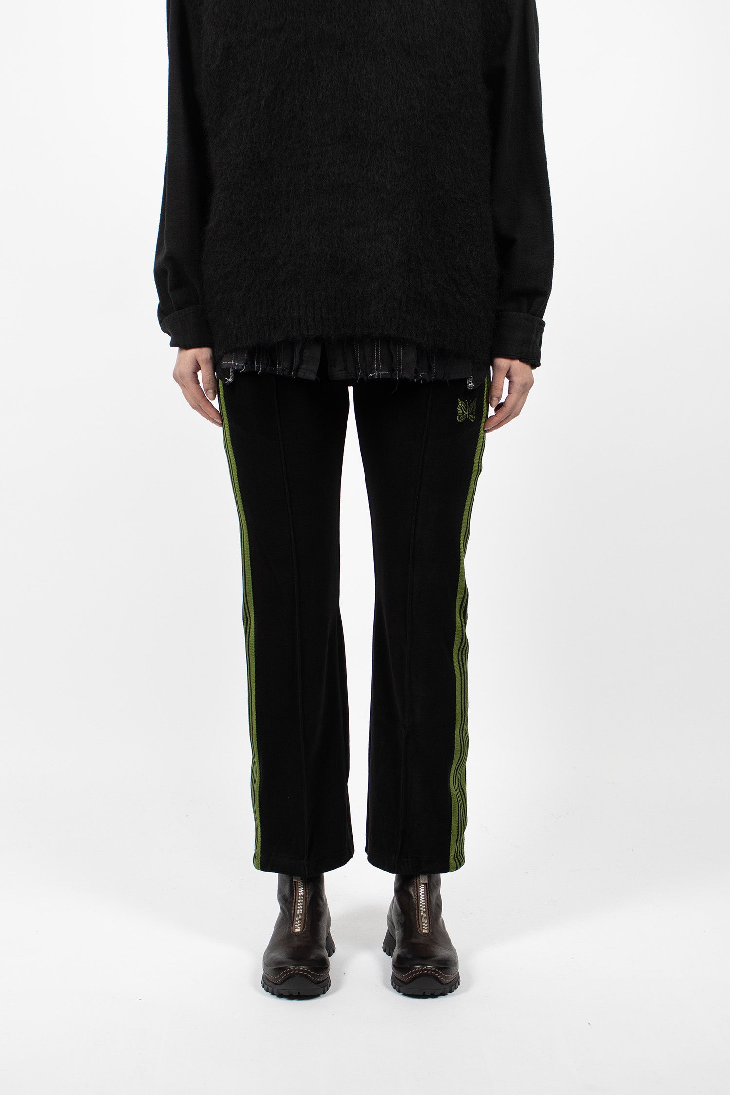 Needles boot-cut track pant in black velour. Elasticated drawstring waist with drawstring fastening, side zip pockets and hip zip pocket. Embroidered butterfly emblem. Kick-flare trouser with contrast tape detail and stitched front crease.