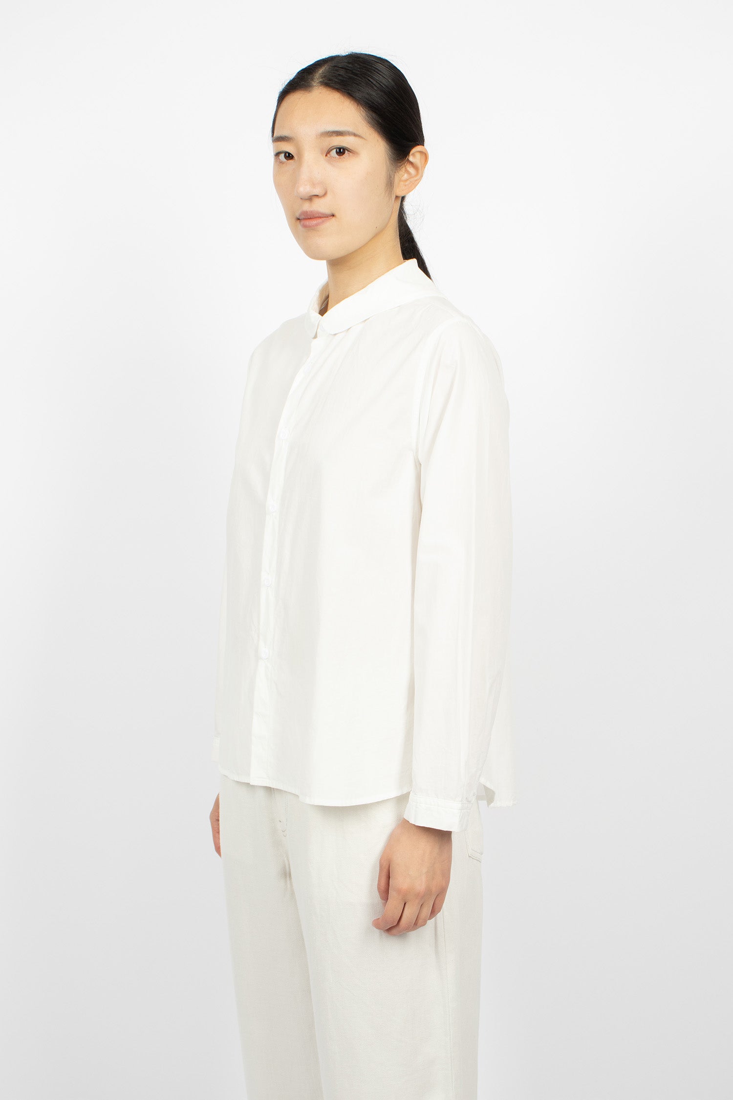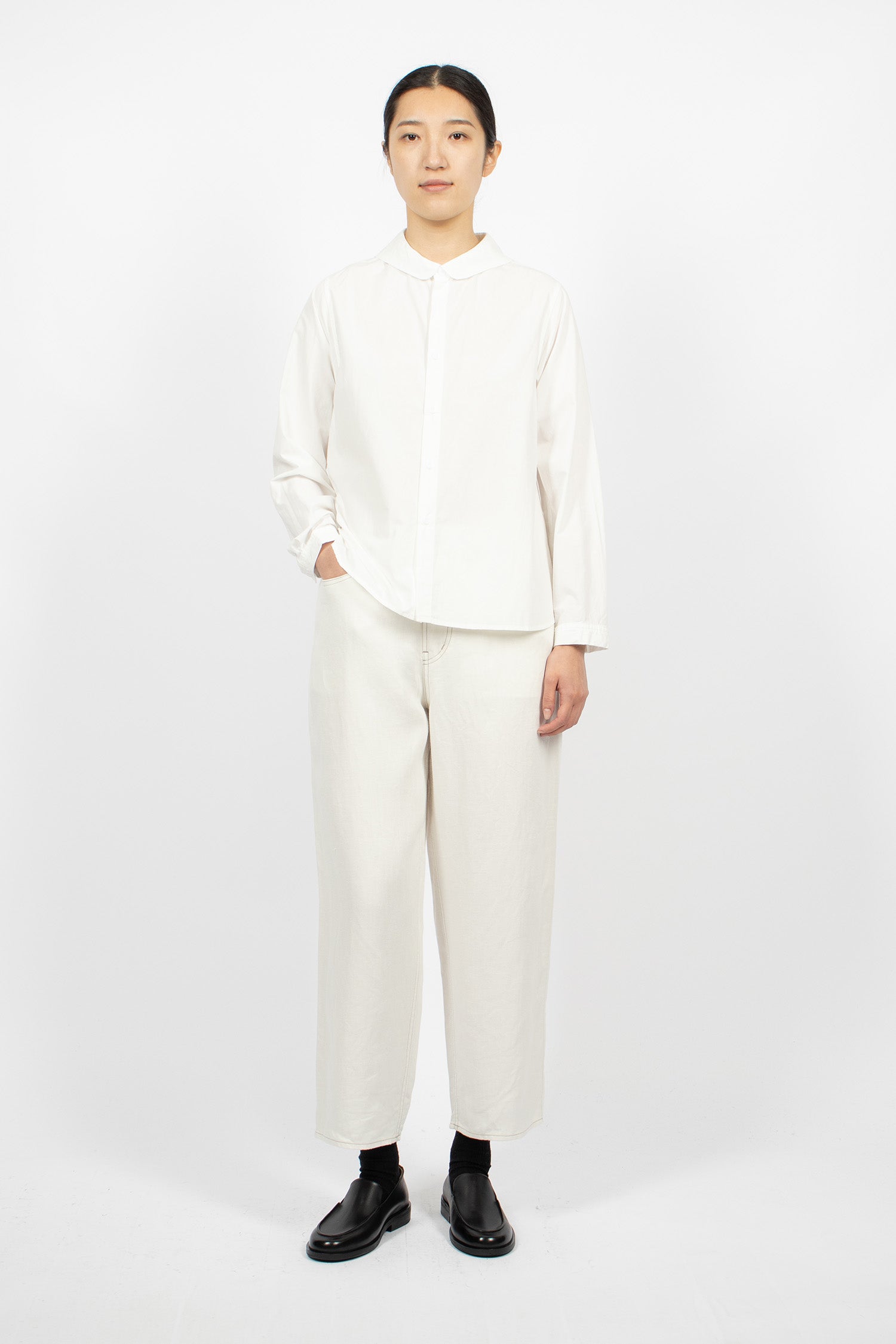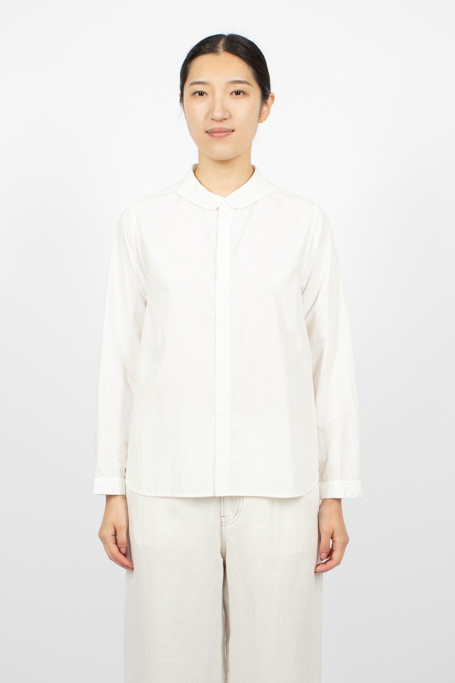 Vlas Blomme round collar blouse in off-white. Round collar, long sleeve with button cuff, tonal button front fastening, curved hem. Hanging loop on the back yoke with pleated detailing. Regular fit.