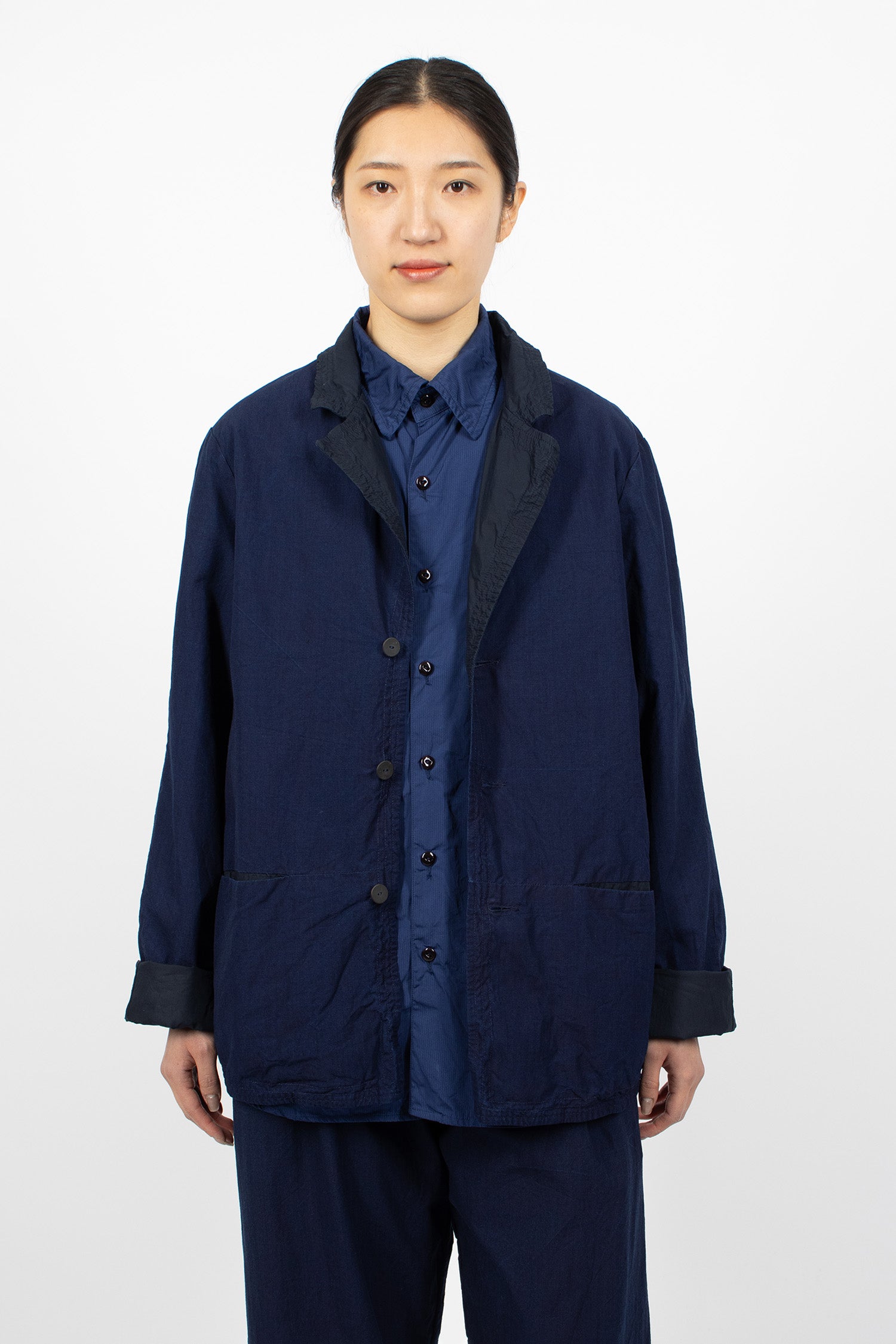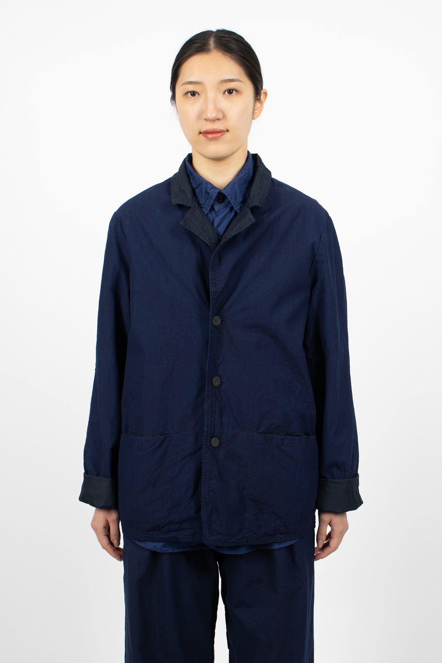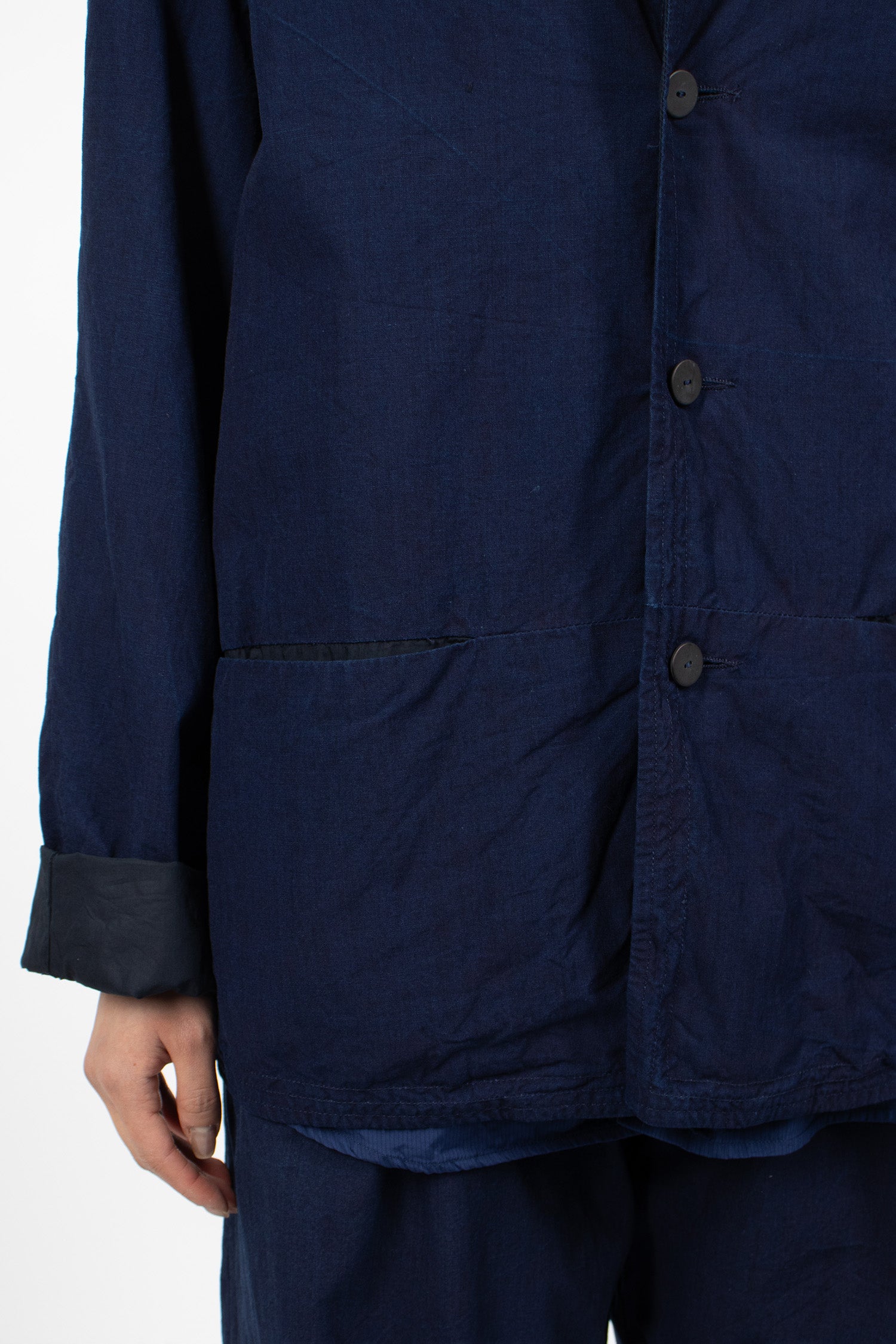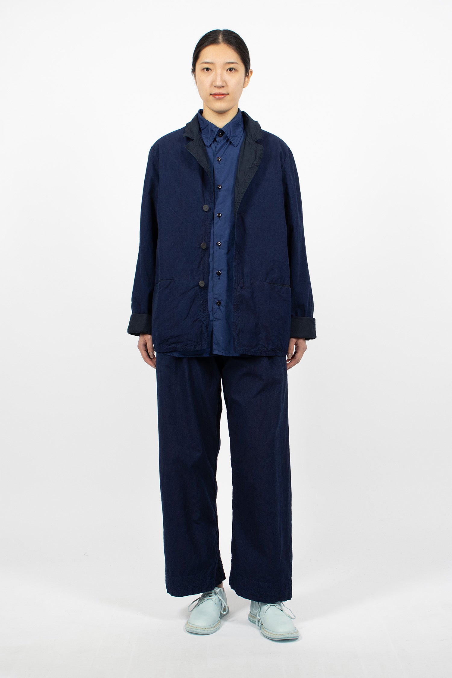 Chez Vidalenc Gary canvas pants in indigo. Elasticated waist on the back with button and zip front closure, belt loops, side seam pockets. Wide straight leg with pleated detailing. Back patch pockets. Unisex fit.