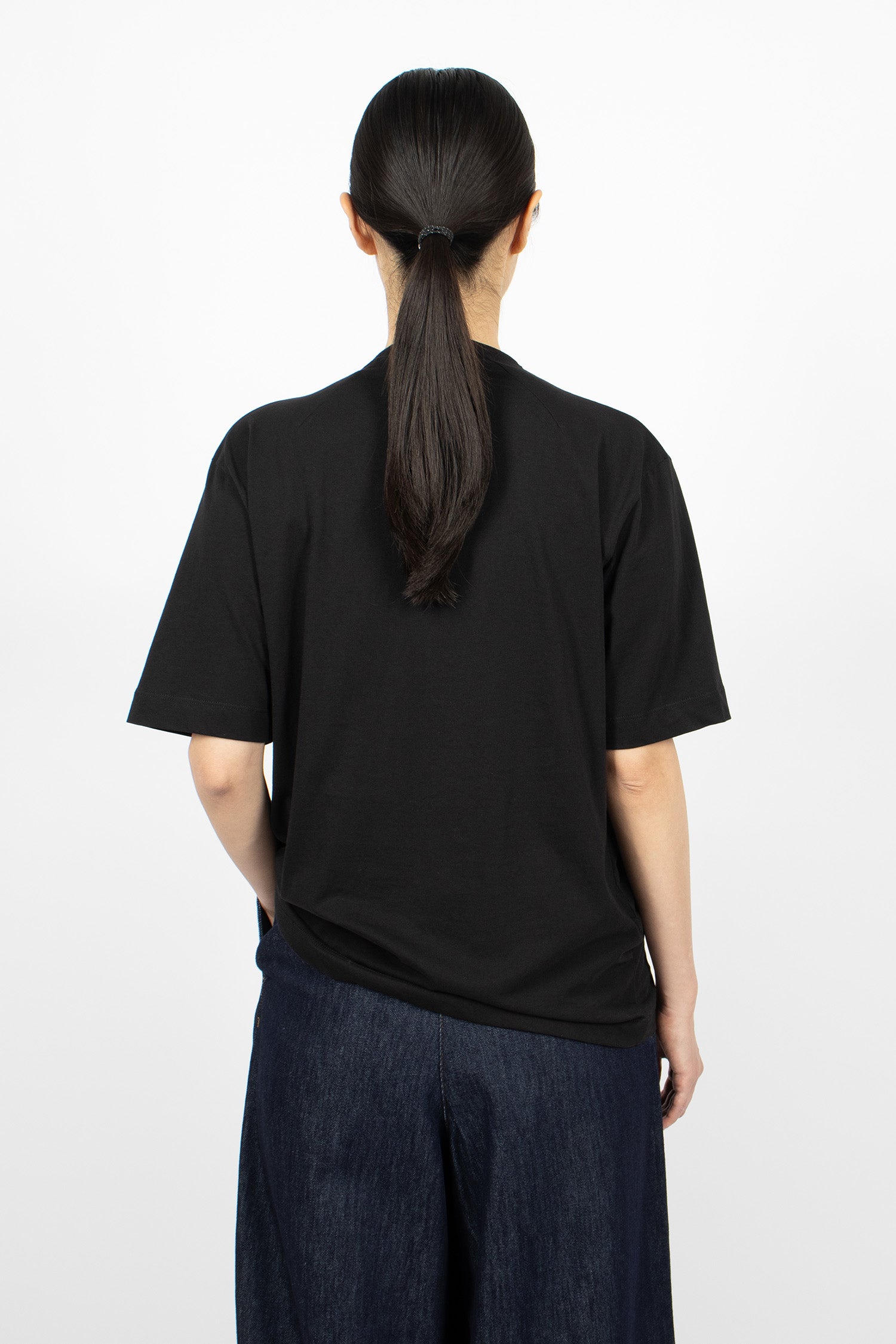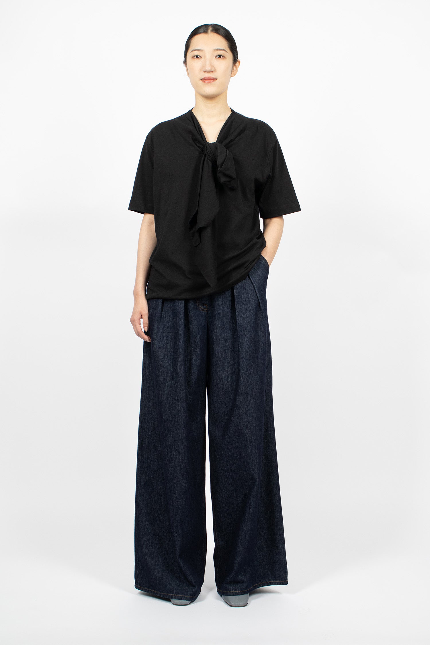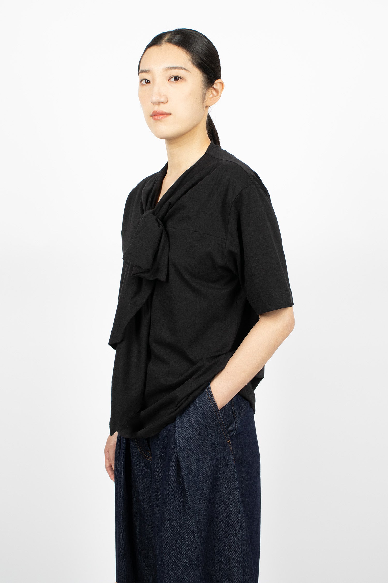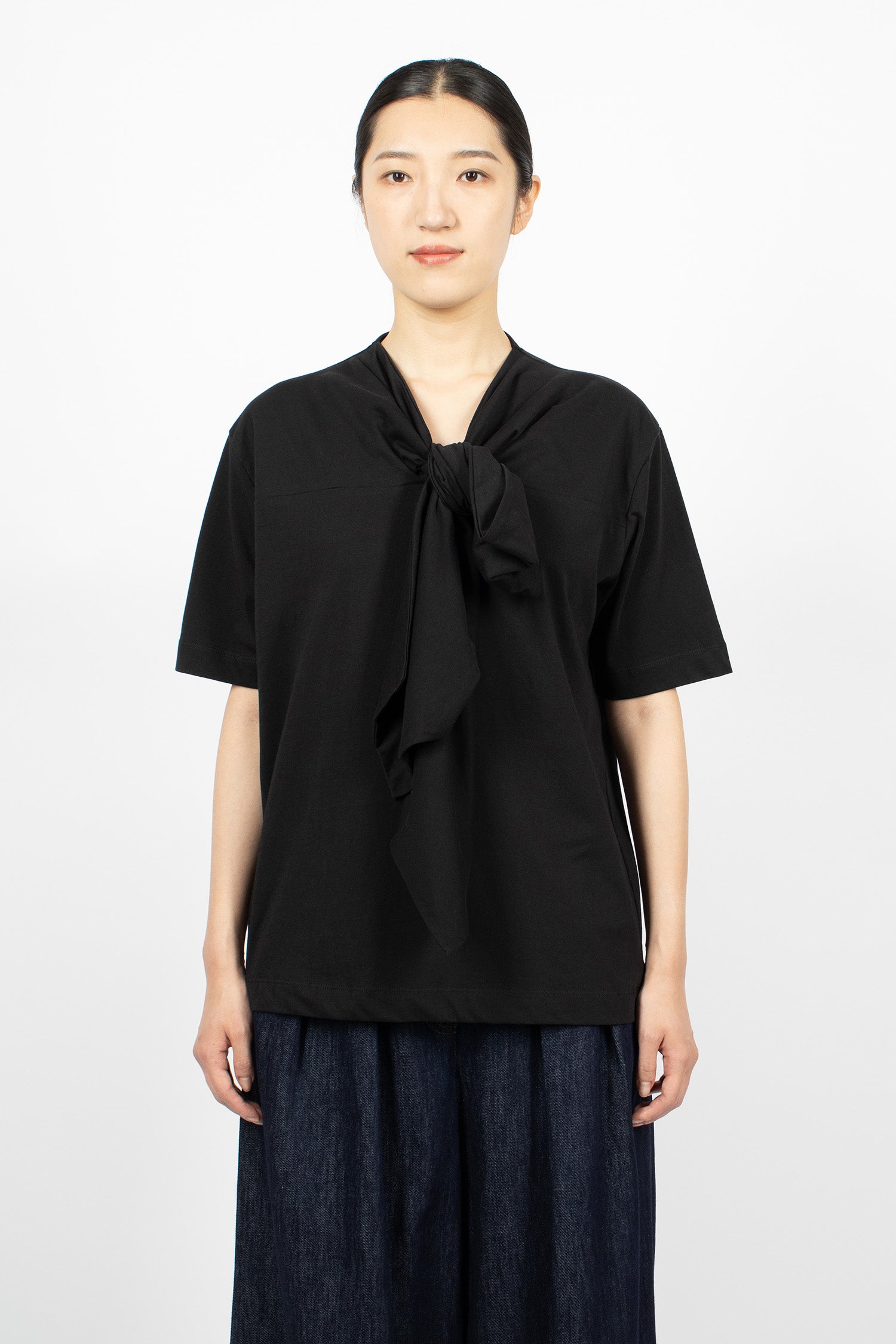 Dries Van Noten pussy-bow t-shirt in black. V-neckline with pussy-bow detailing, dropped shoulder, short sleeves. Straight hem and relaxed fit.