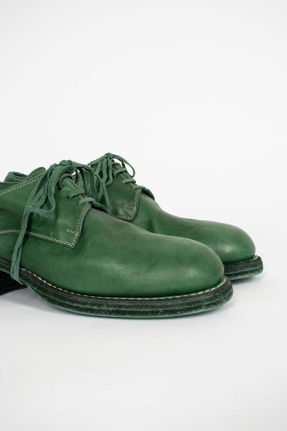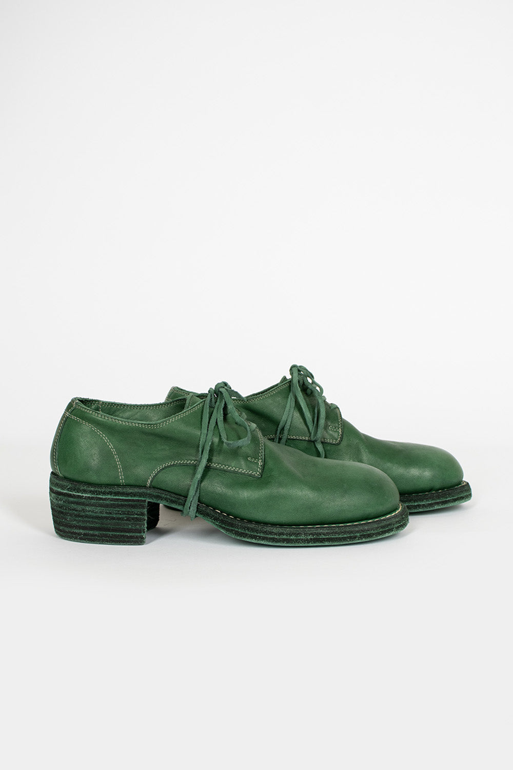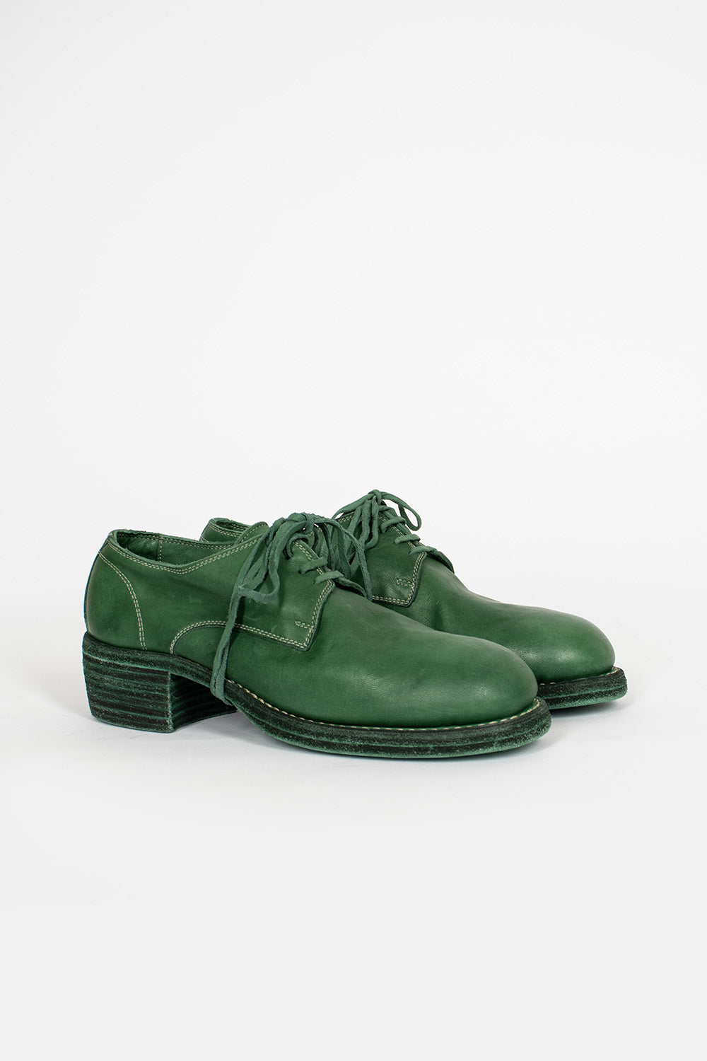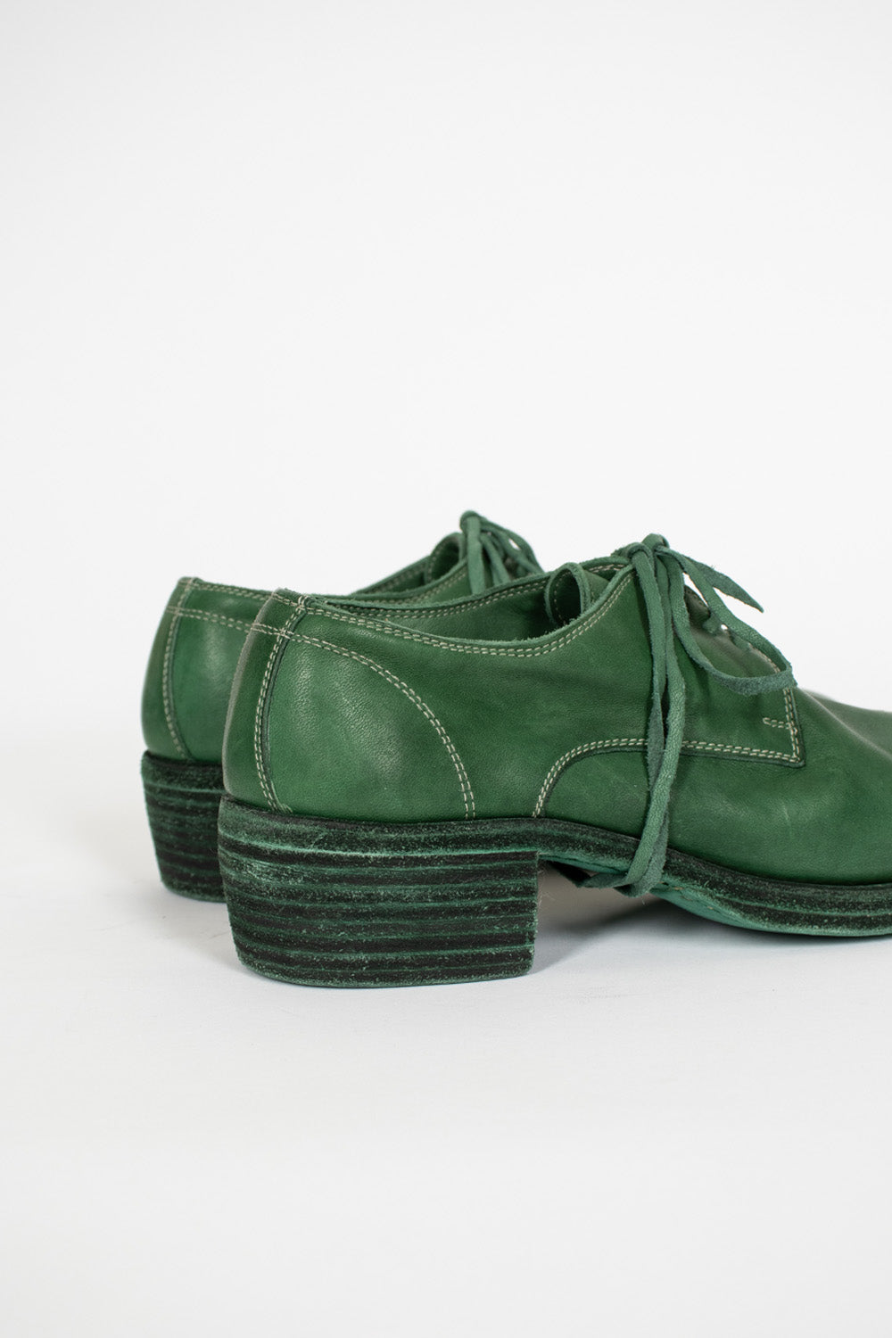 Guidi 792Z shoe in CO148T emerald green. Derby style with piece-dyed lace uppers, rounded toe and stacked leather sole. 100% full grain horse leather. Made using hand crafted techniques, all pieces are therefore unique and can slightly vary in tone, size and finish. Made in Italy.