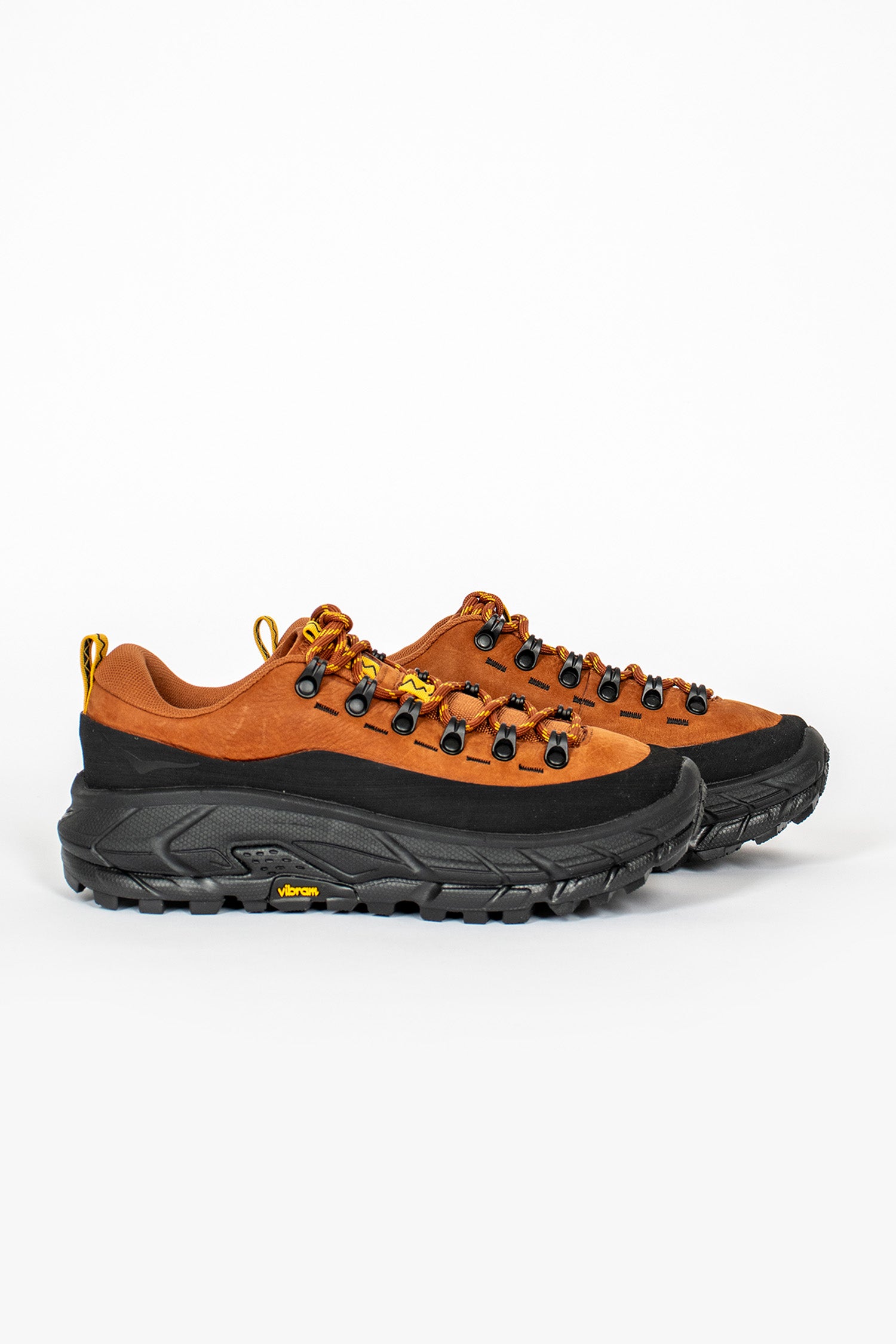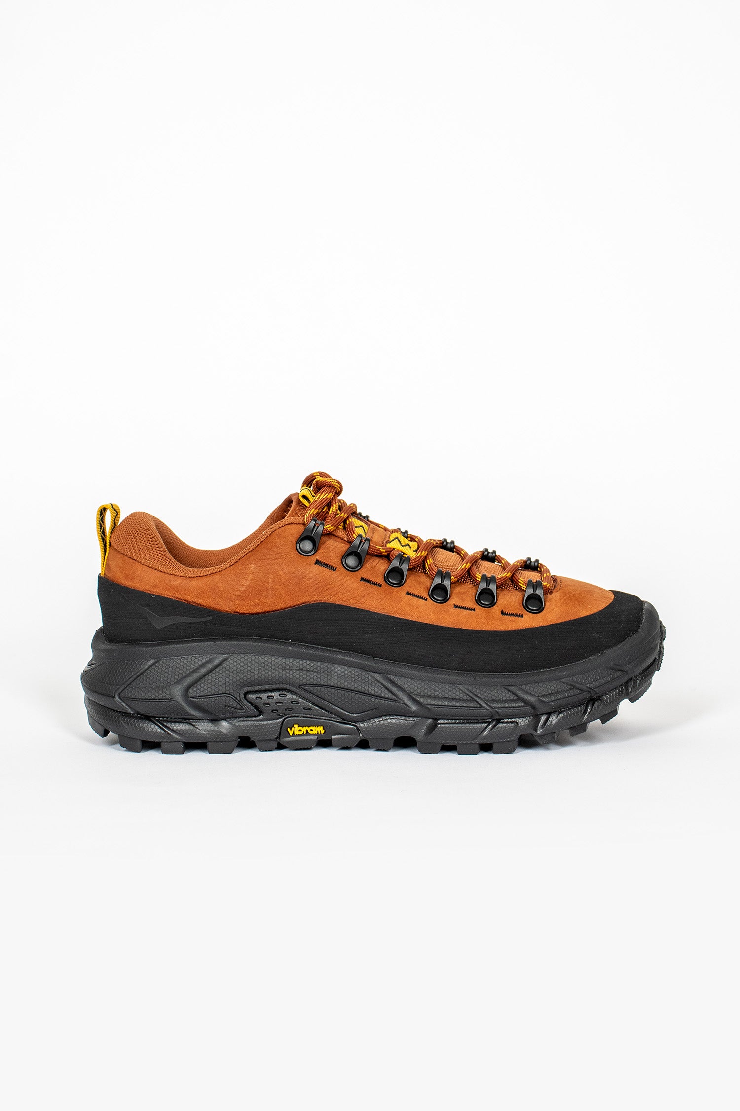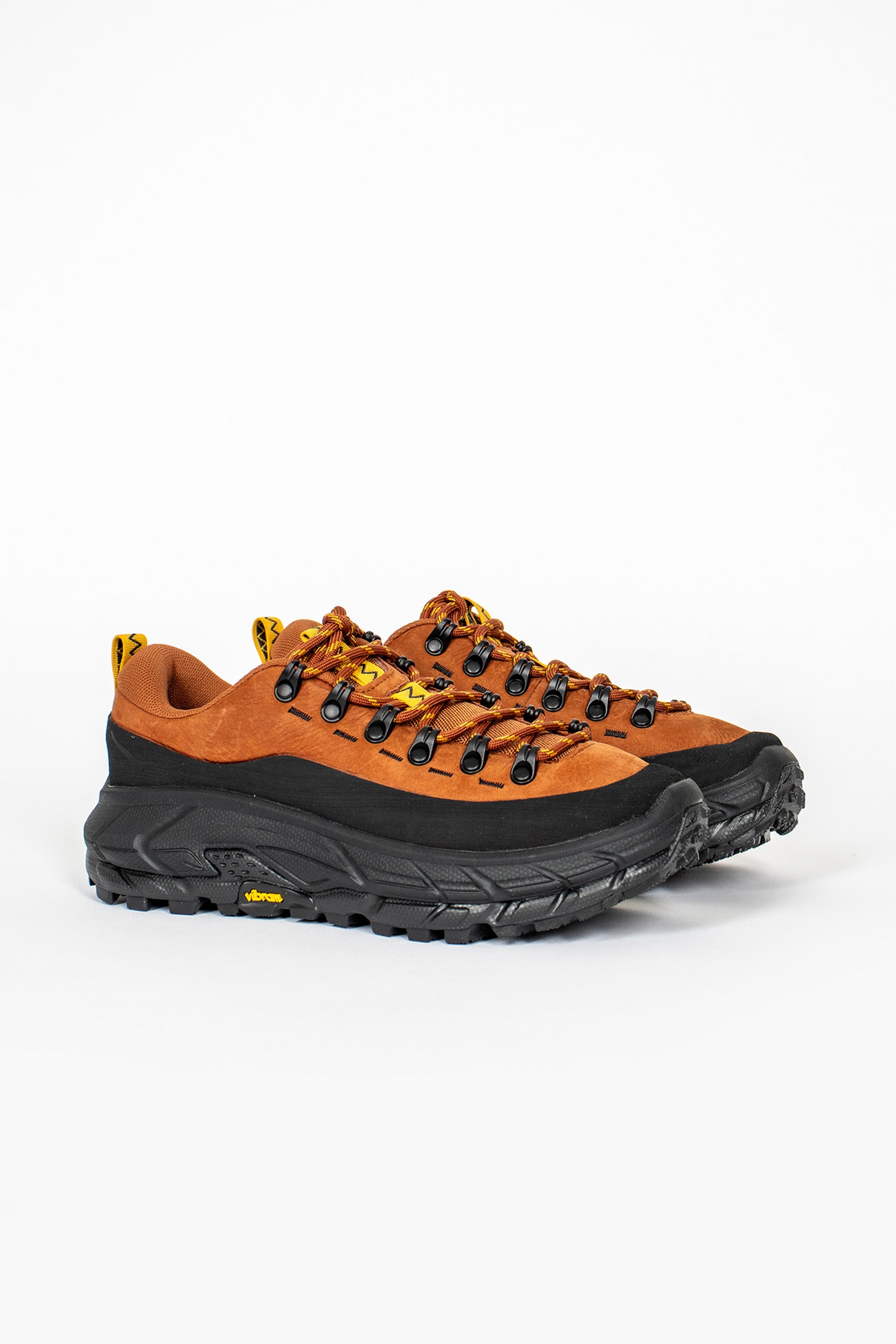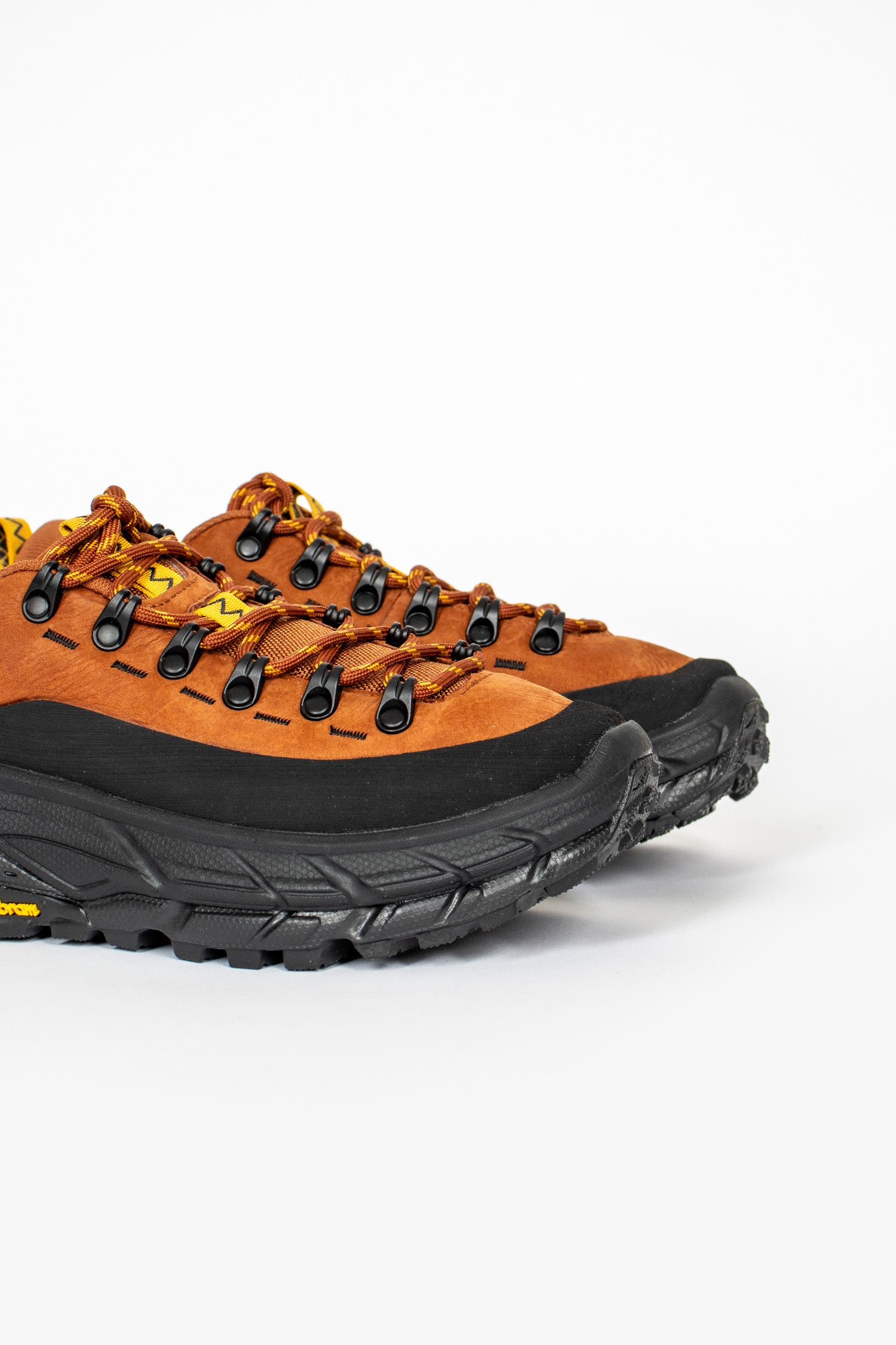 Hoka One One Tor Summit in hazelnut and black. Tor Summit offers cushioning and stability in a lowcut hiker with a midsole blend of EVA and rubberised foam material for comfort underfoot. In a low collar option, a purpose built mid-foot increases underfoot stability on uneven terrain, and Vibram Megagrip outsole rubber with 5mm lugs provides traction and durability.