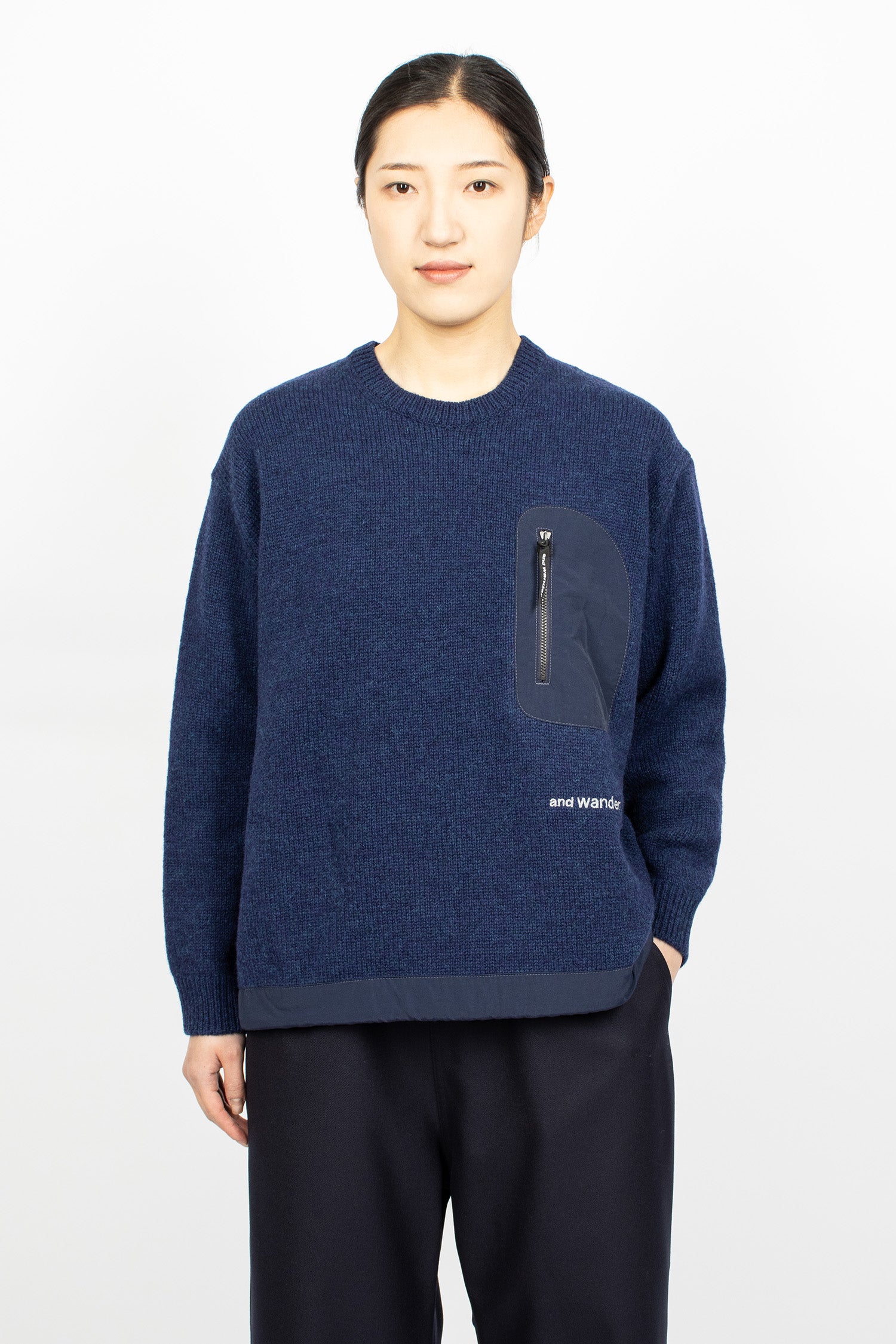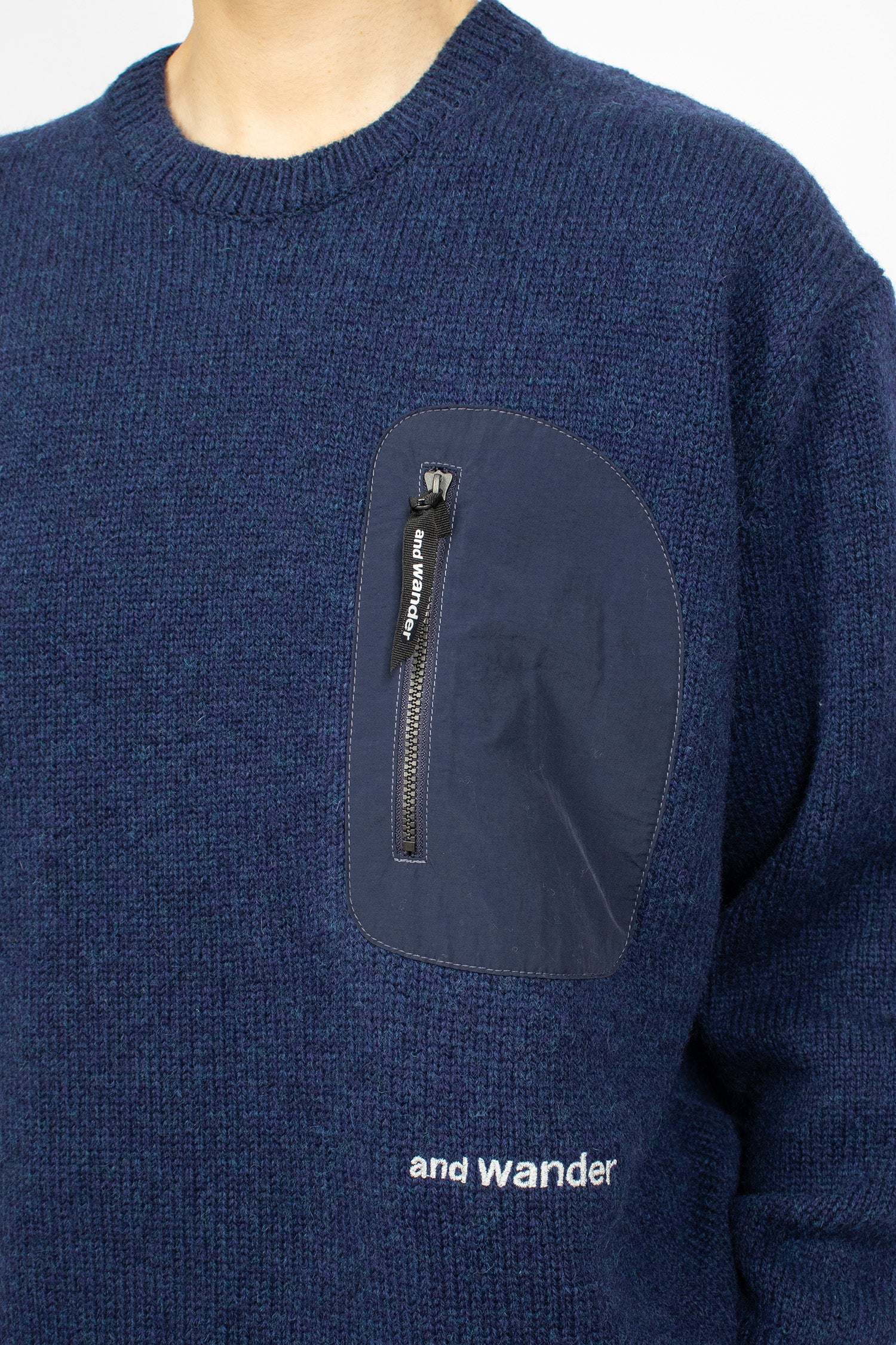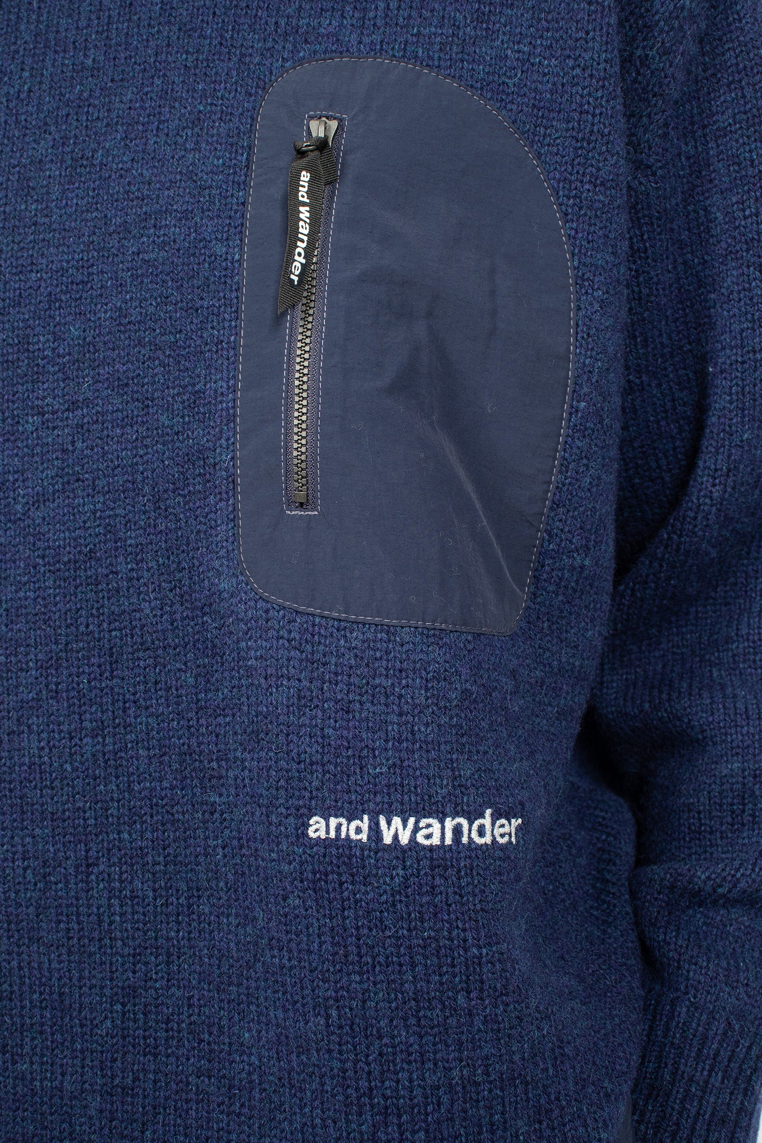 And Wander Shetland wool jumper in blue 5 gauge knit. Crew neckline with ribbed trims. Nylon chest pocket with custom zip pull. And Wander white embroidery. Nylon hem with drawcord. Relaxed fit.