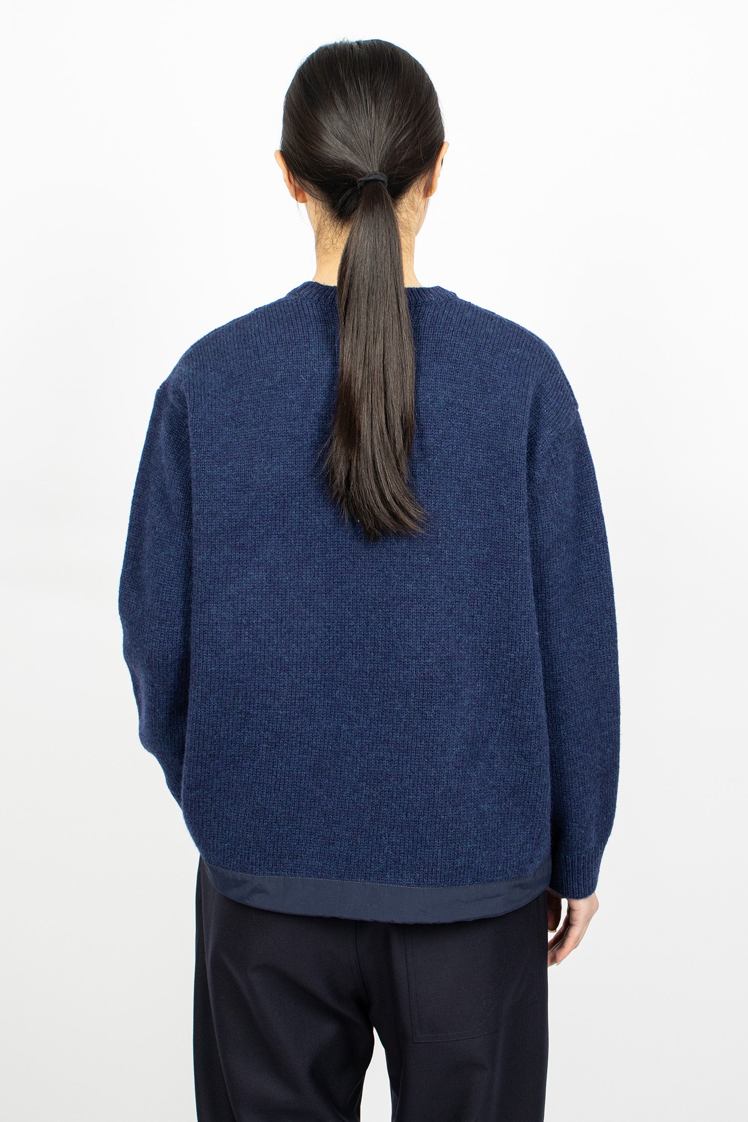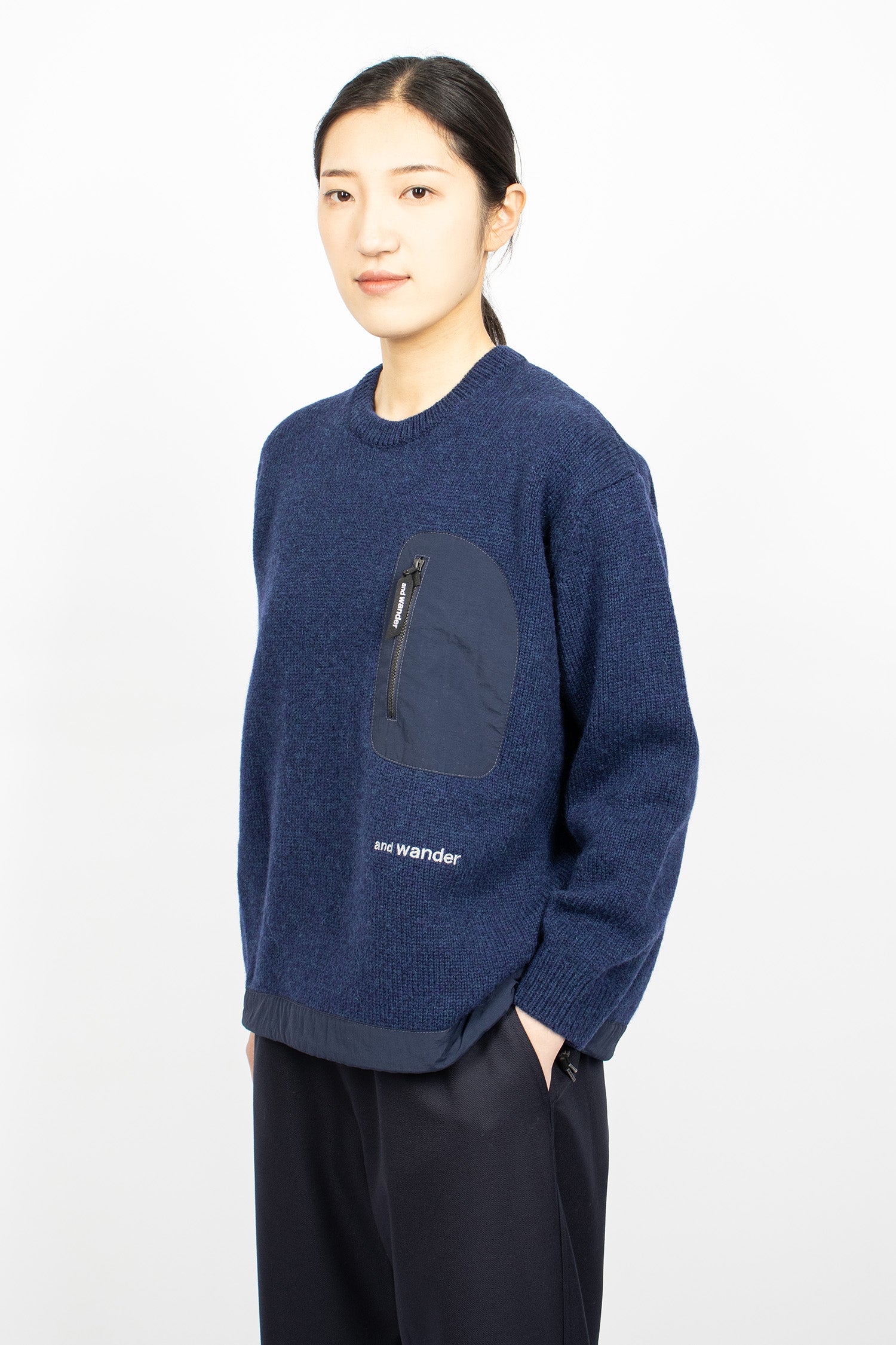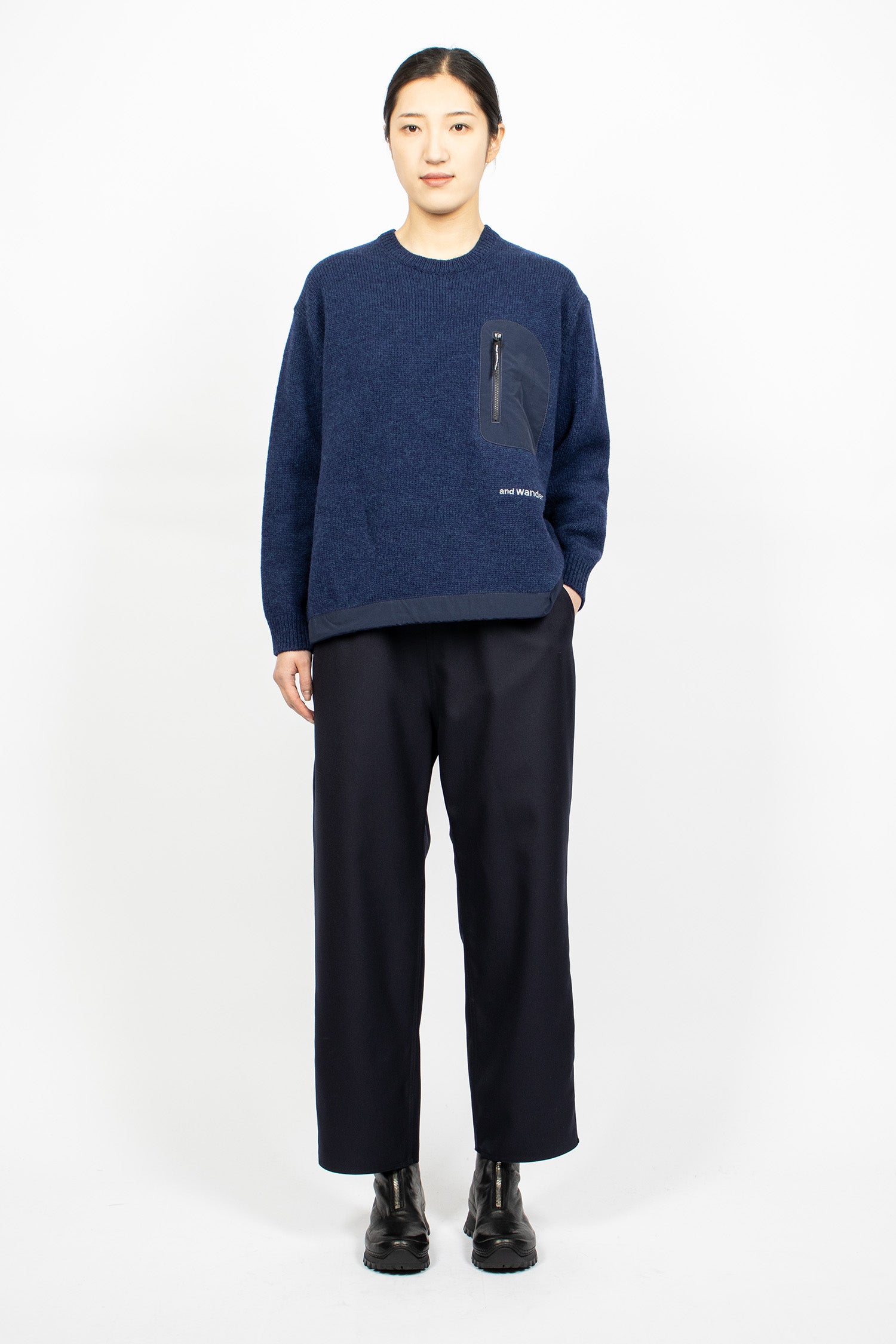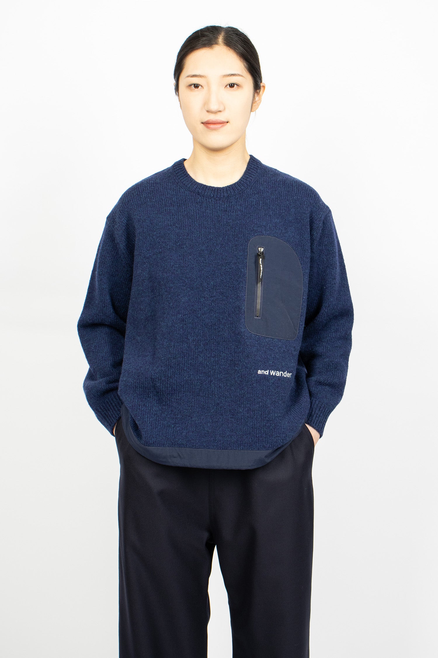 And Wander Shetland wool jumper in blue 5 gauge knit. Crew neckline with ribbed trims. Nylon chest pocket with custom zip pull. And Wander white embroidery. Nylon hem with drawcord. Relaxed fit.