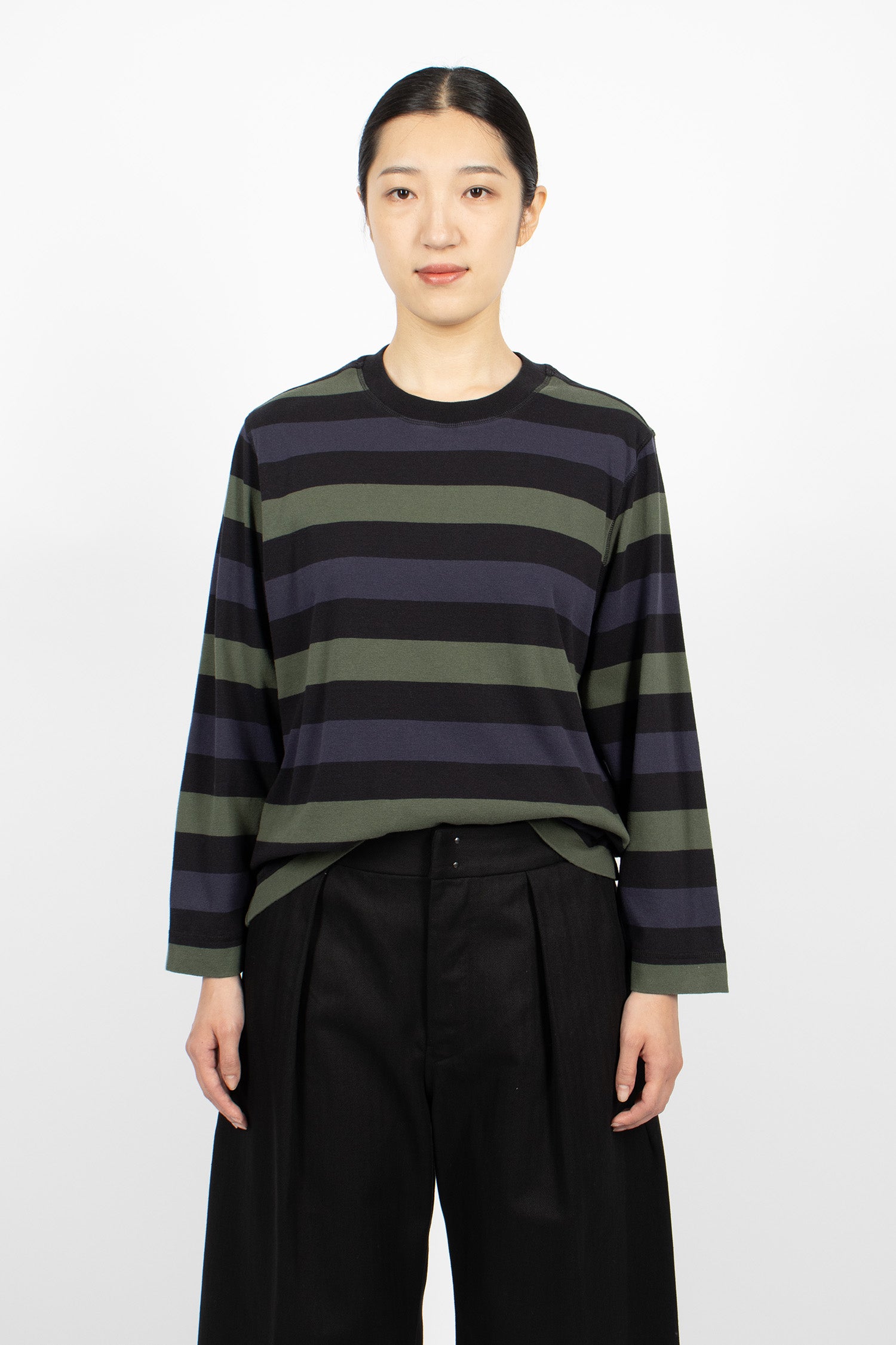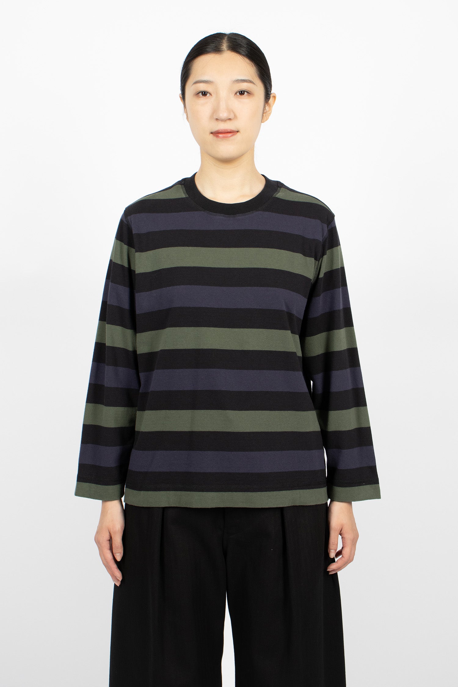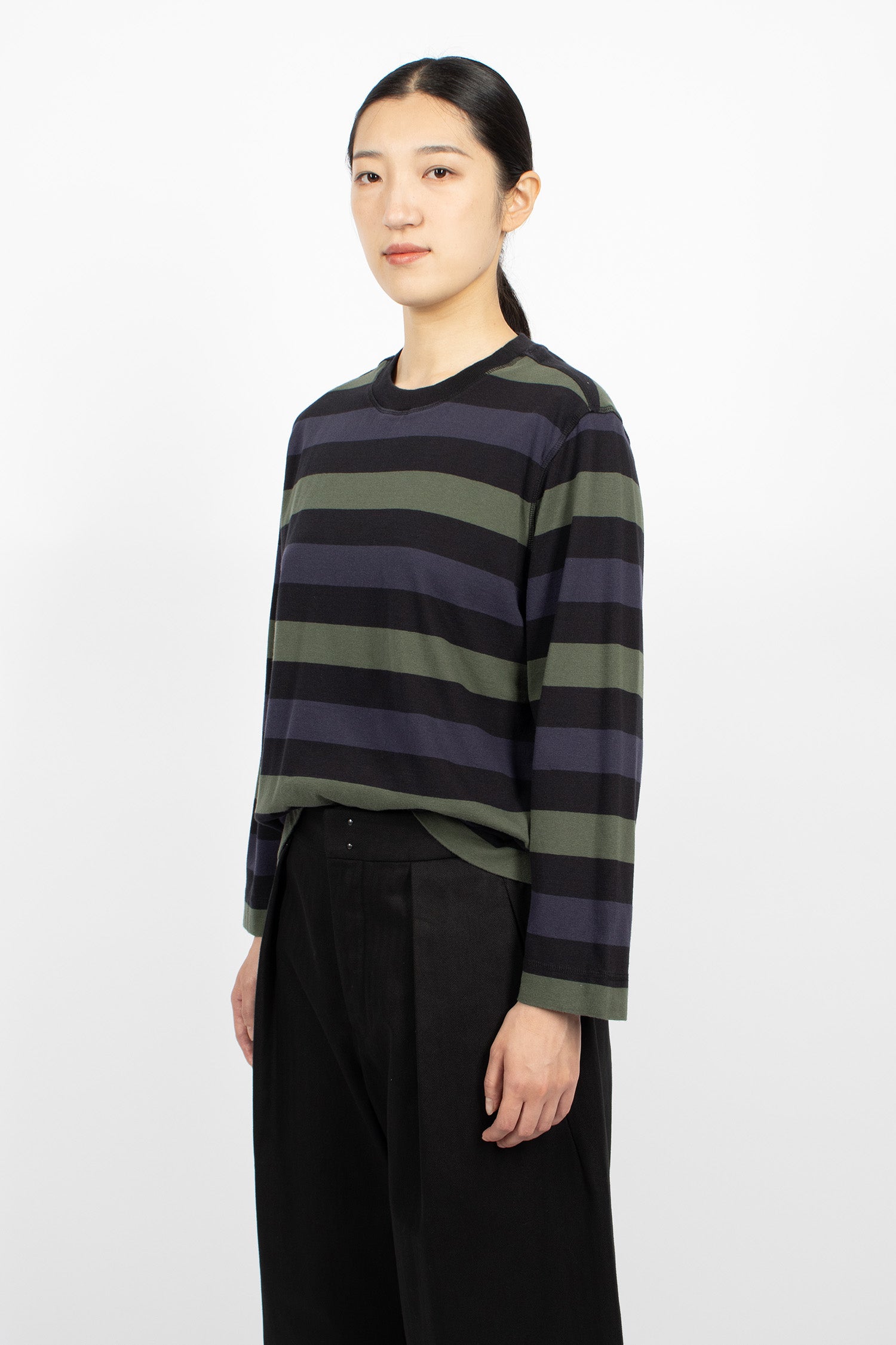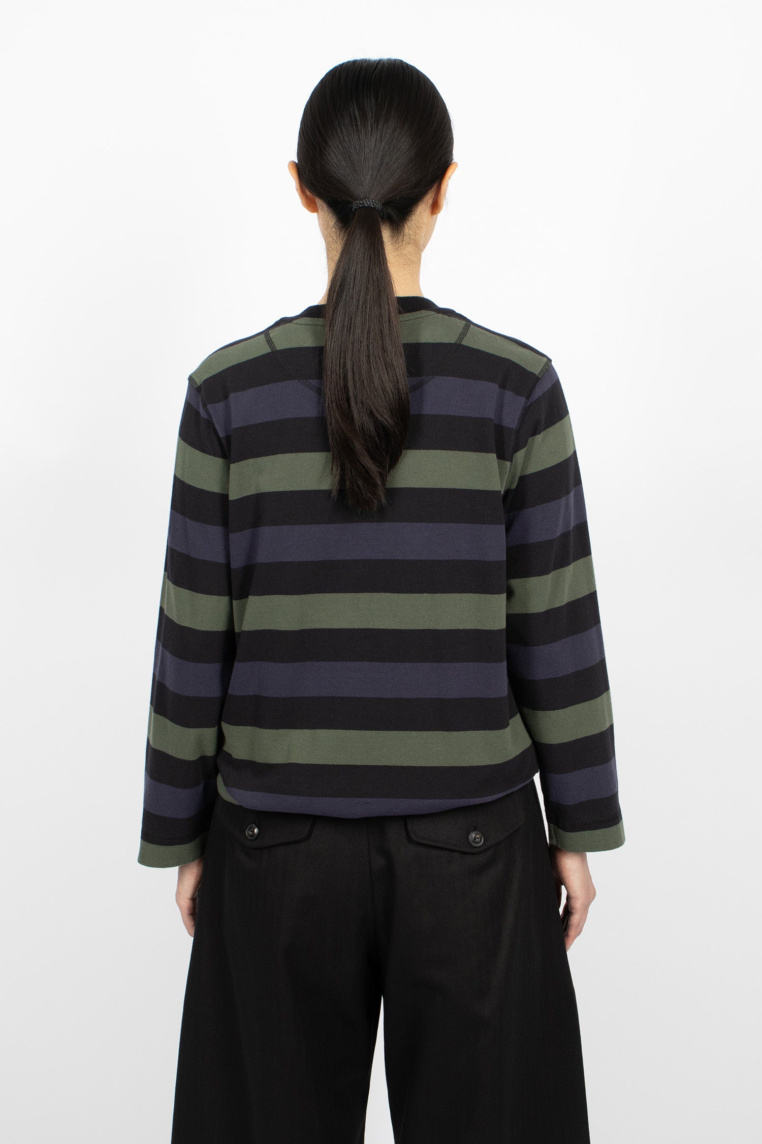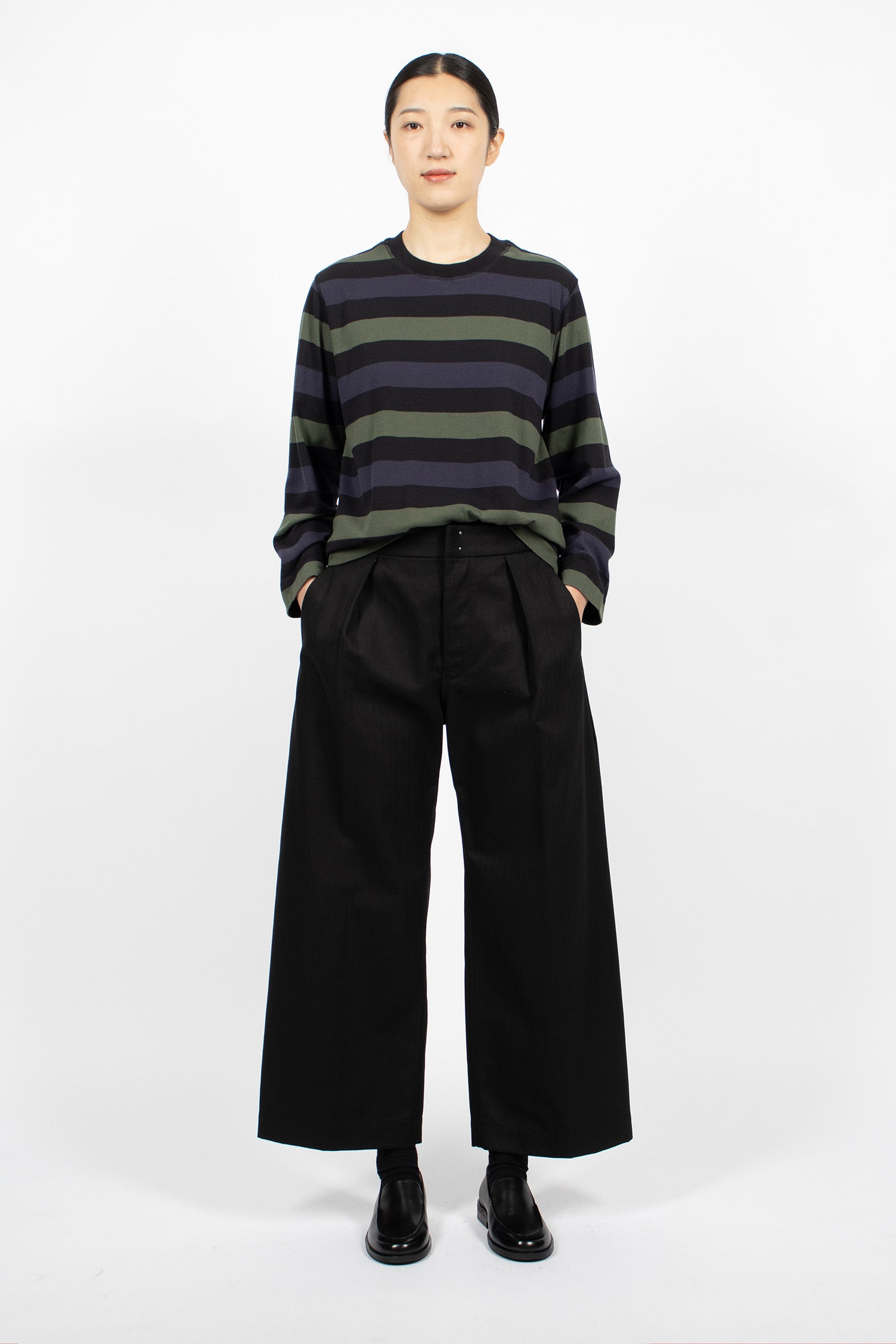 Margret Howell MHL colour block jumper in seaweed and black lightweight lambswool. Ribbed mock neckline, long sleeves with ribbed cuffs, flatlock stitched seams and ribbed hem. Relaxed, cropped fit.