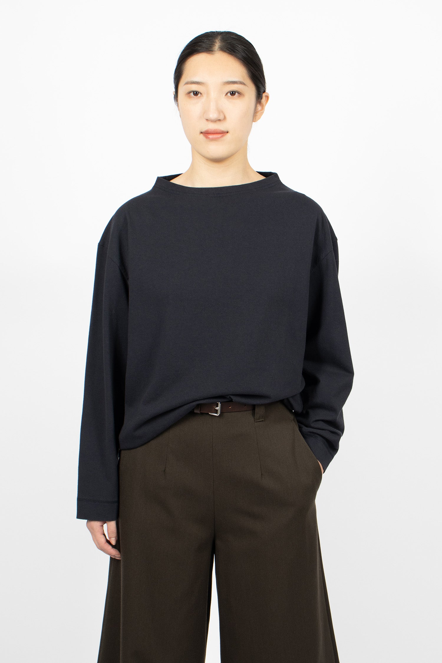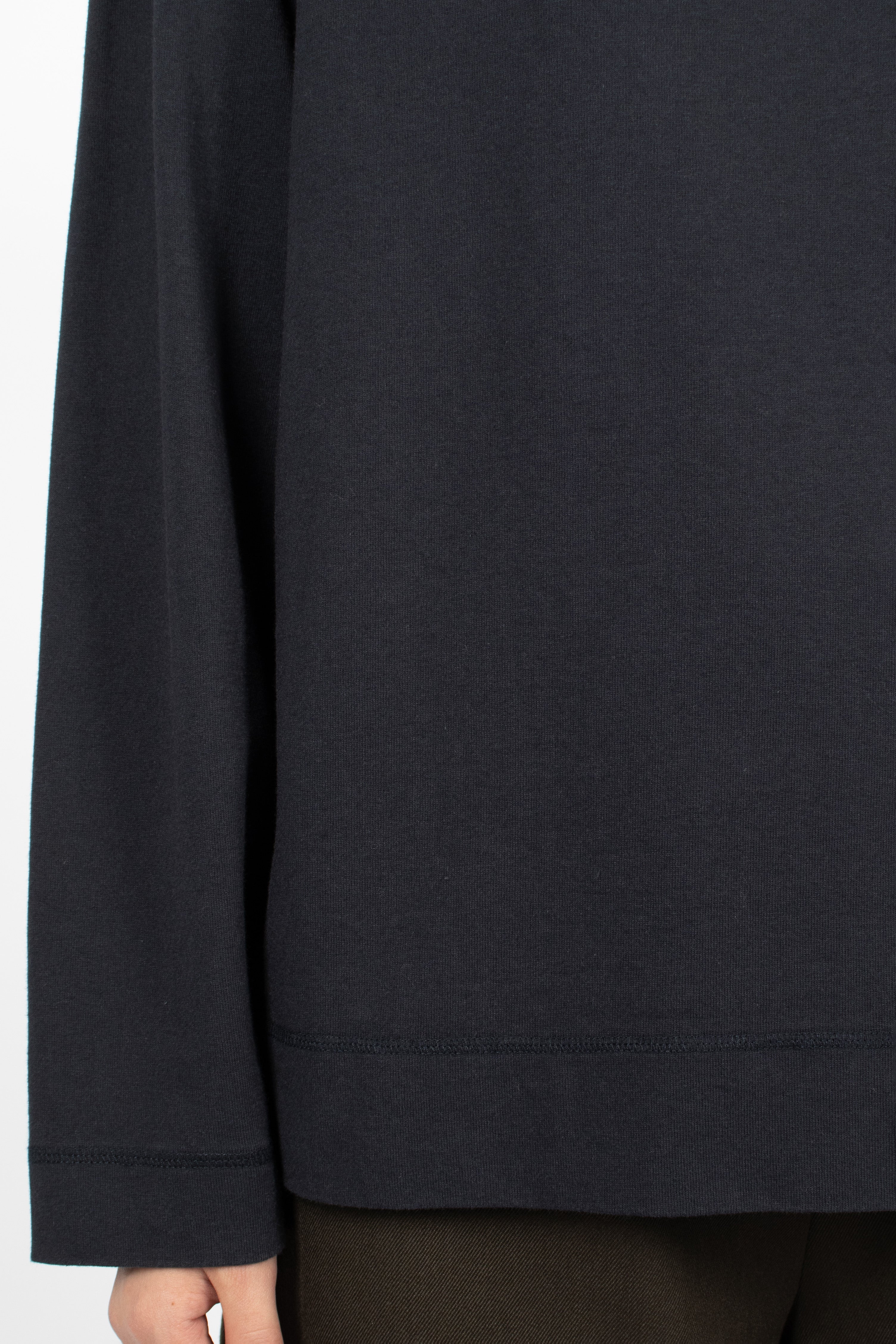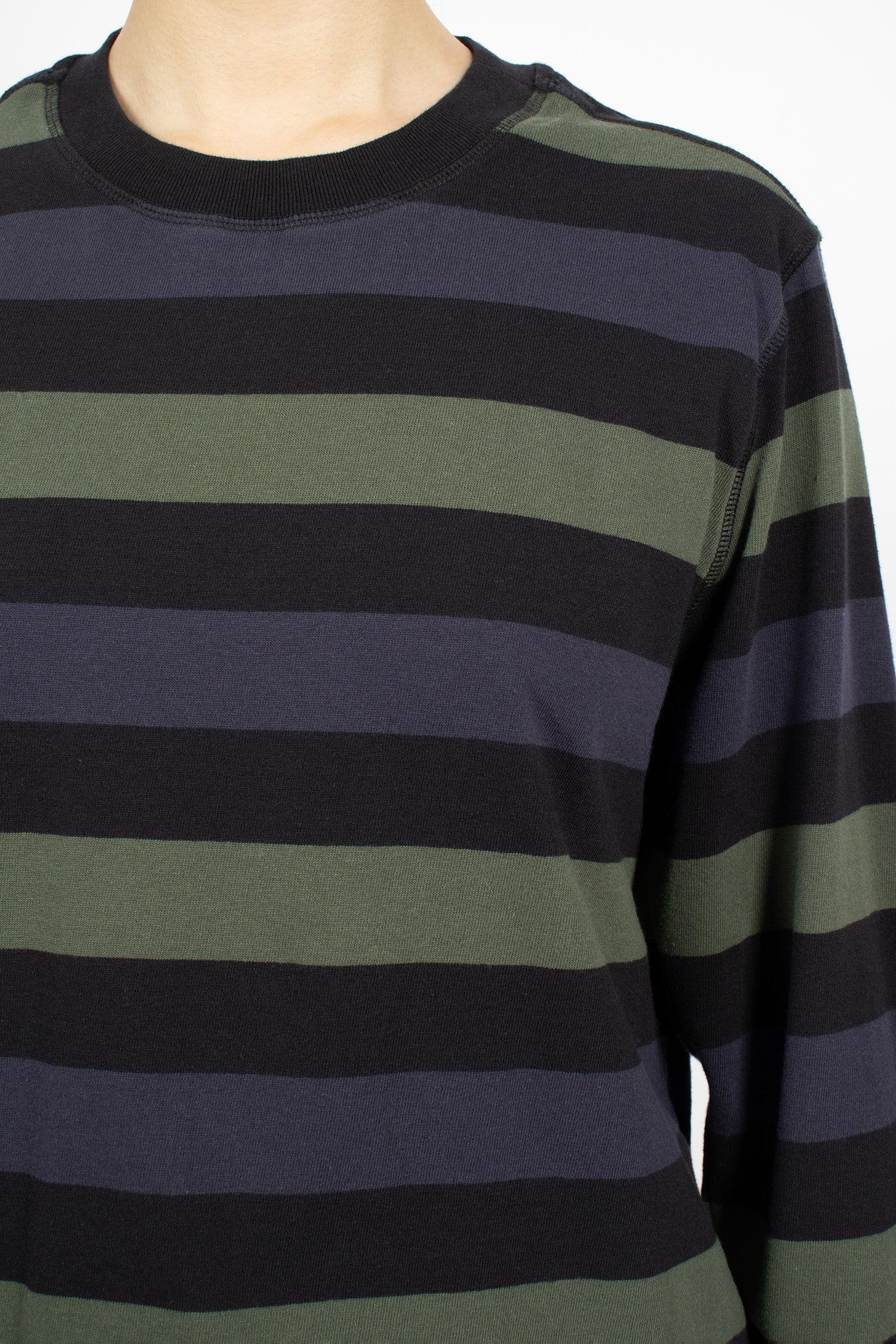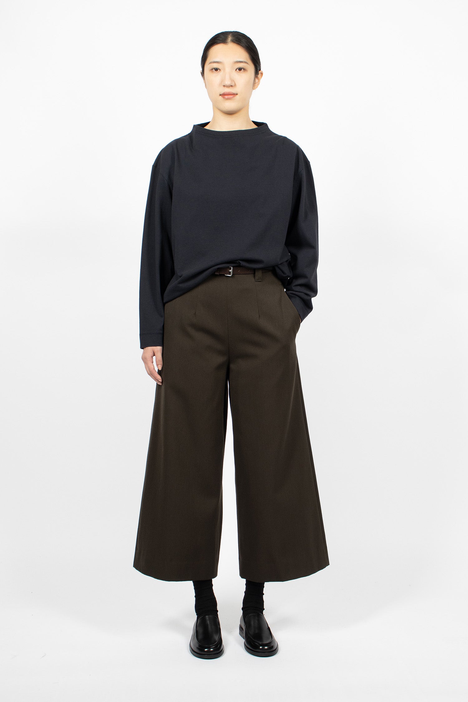 Margret Howell MHL colour block jumper in seaweed and black lightweight lambswool. Ribbed mock neckline, long sleeves with ribbed cuffs, flatlock stitched seams and ribbed hem. Relaxed, cropped fit.