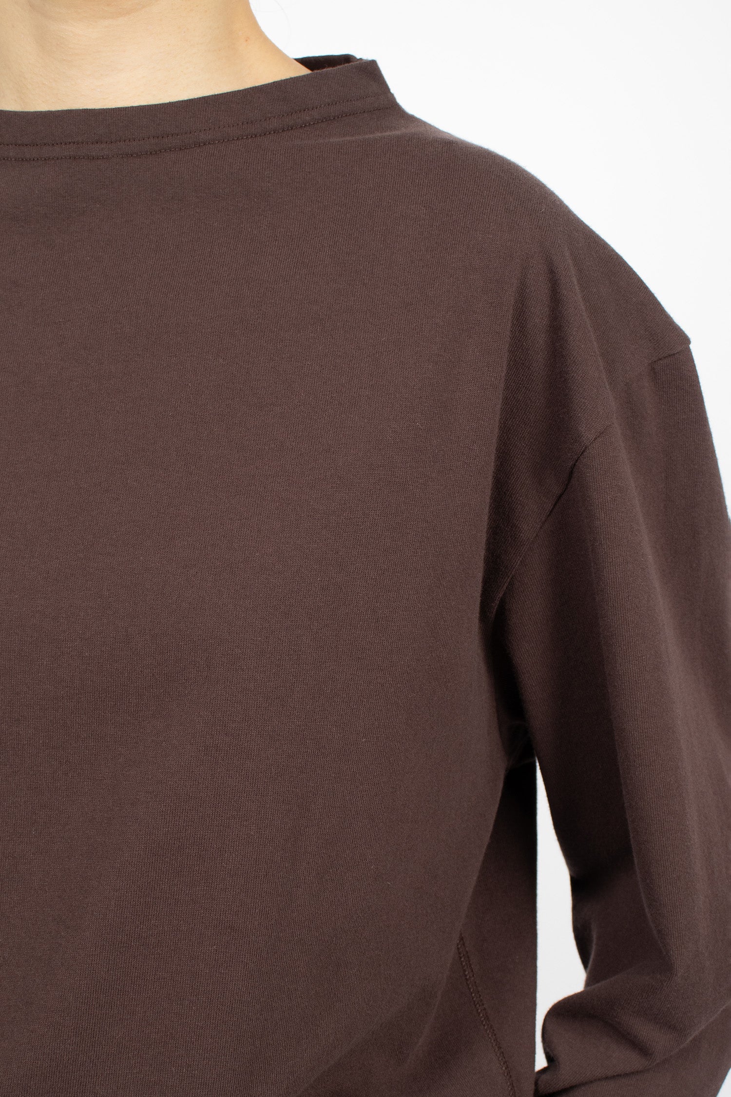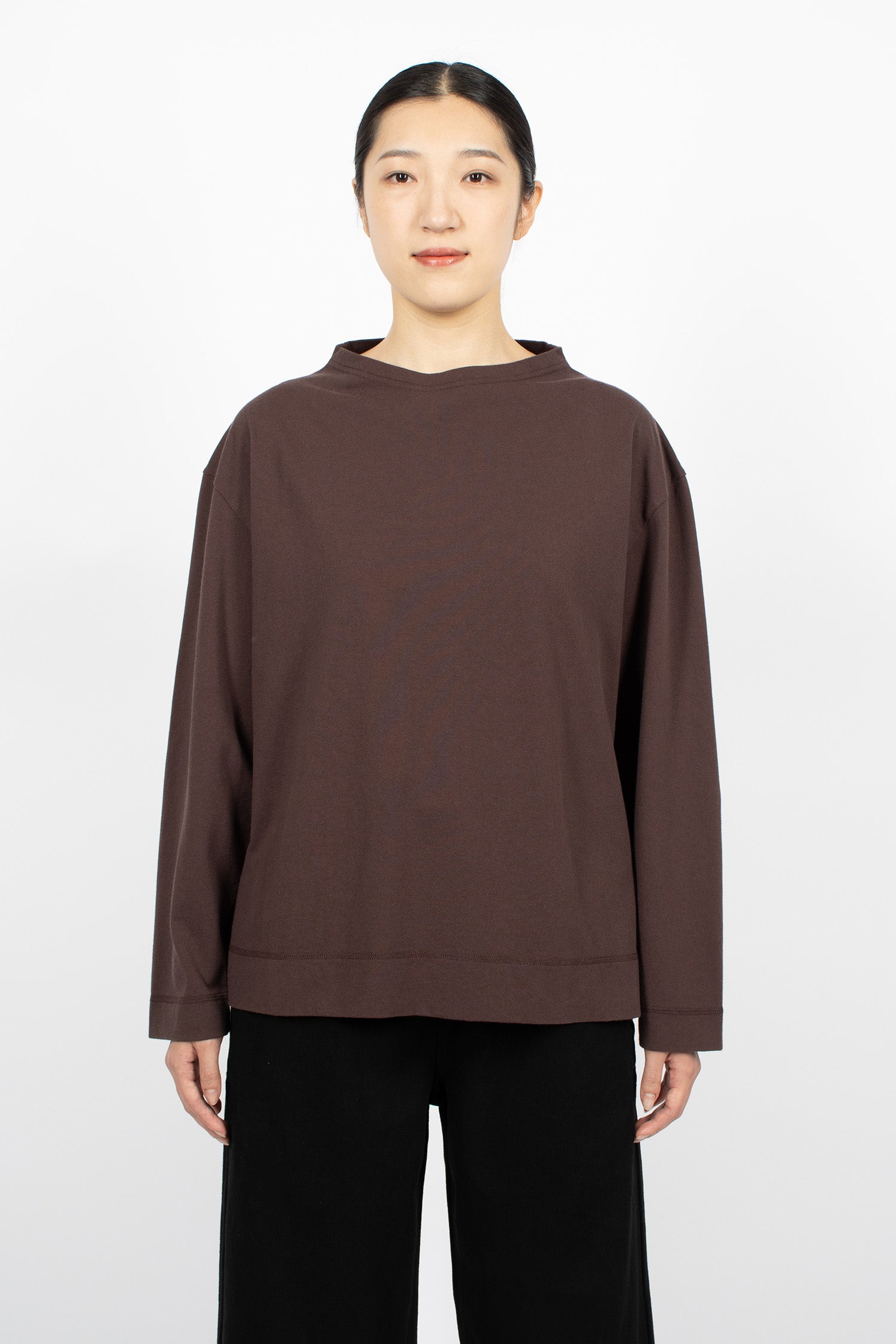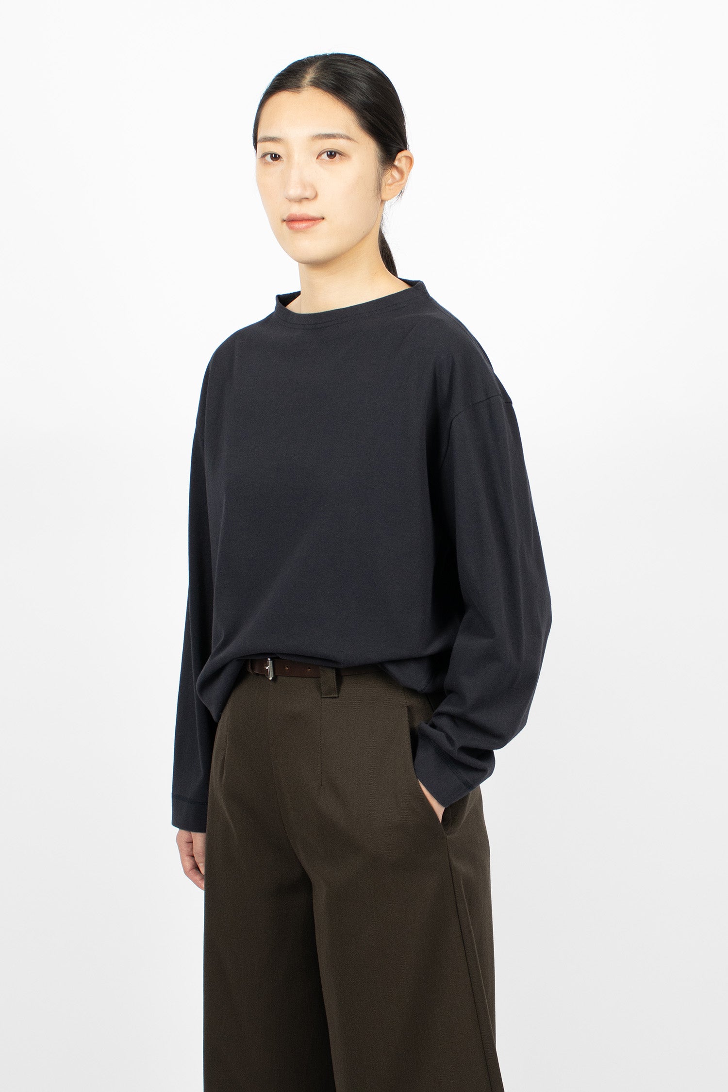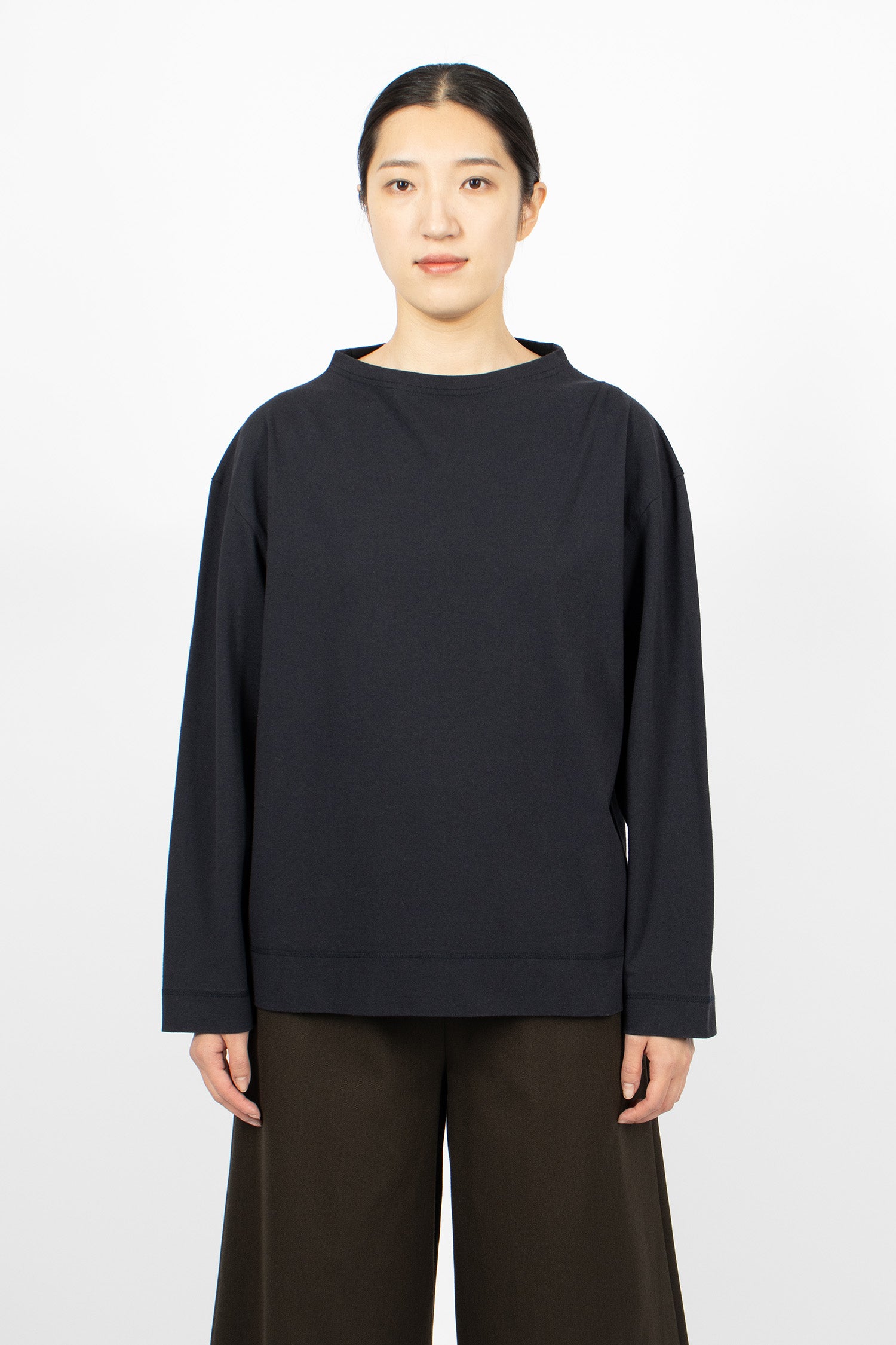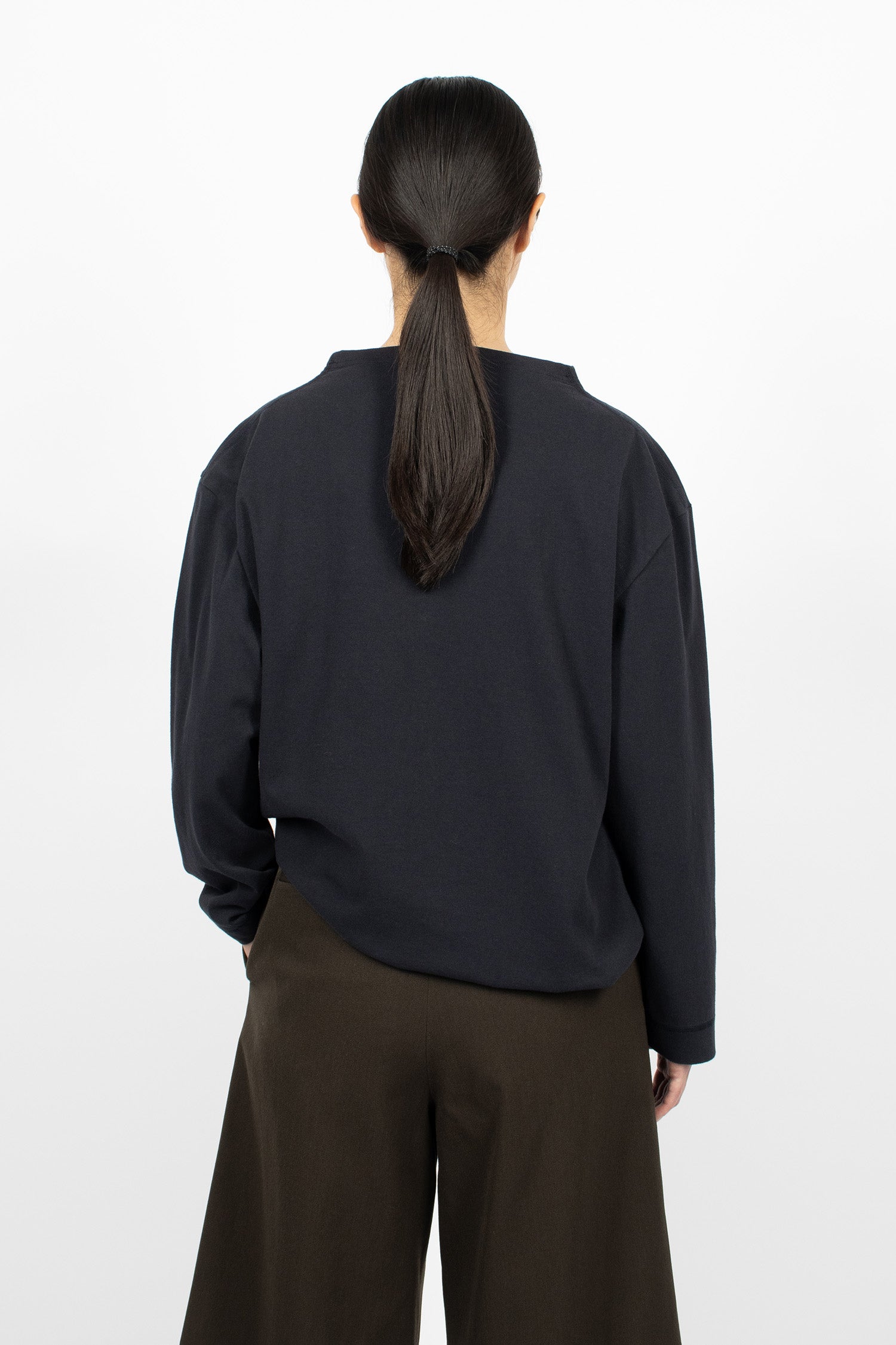 Margret Howell MHL colour block jumper in seaweed and black lightweight lambswool. Ribbed mock neckline, long sleeves with ribbed cuffs, flatlock stitched seams and ribbed hem. Relaxed, cropped fit.