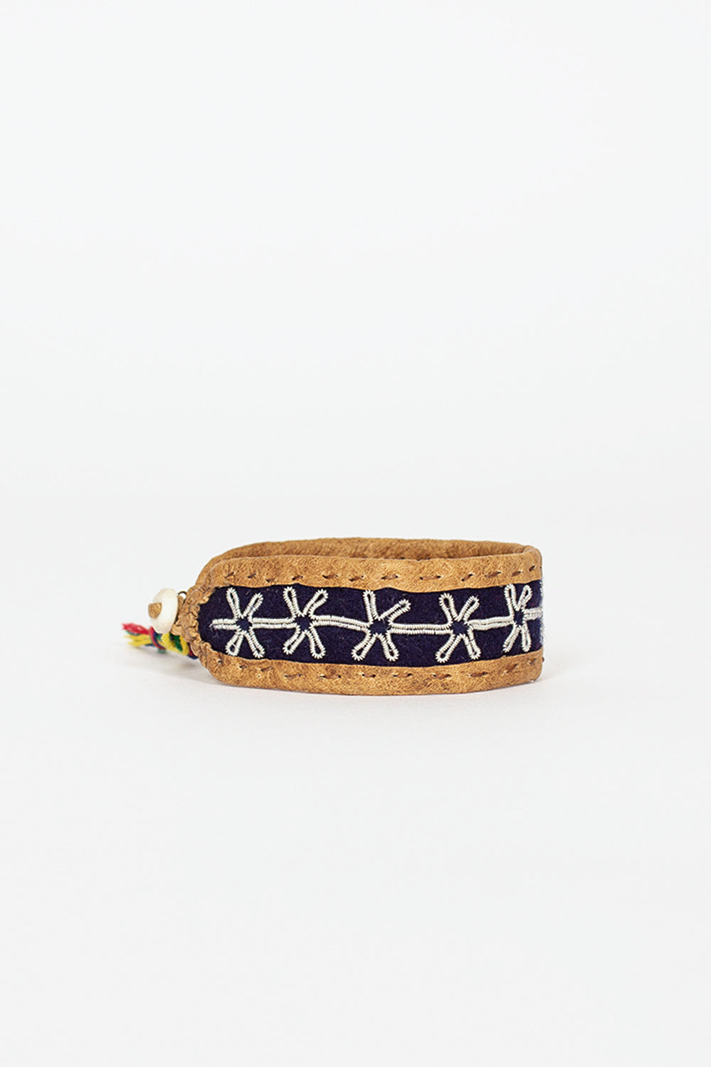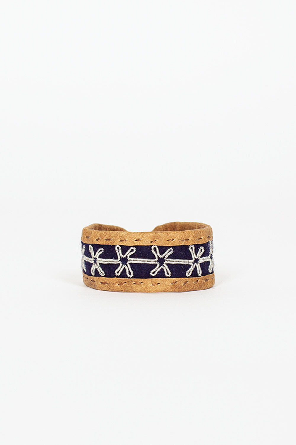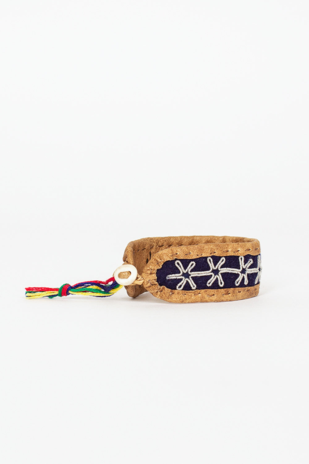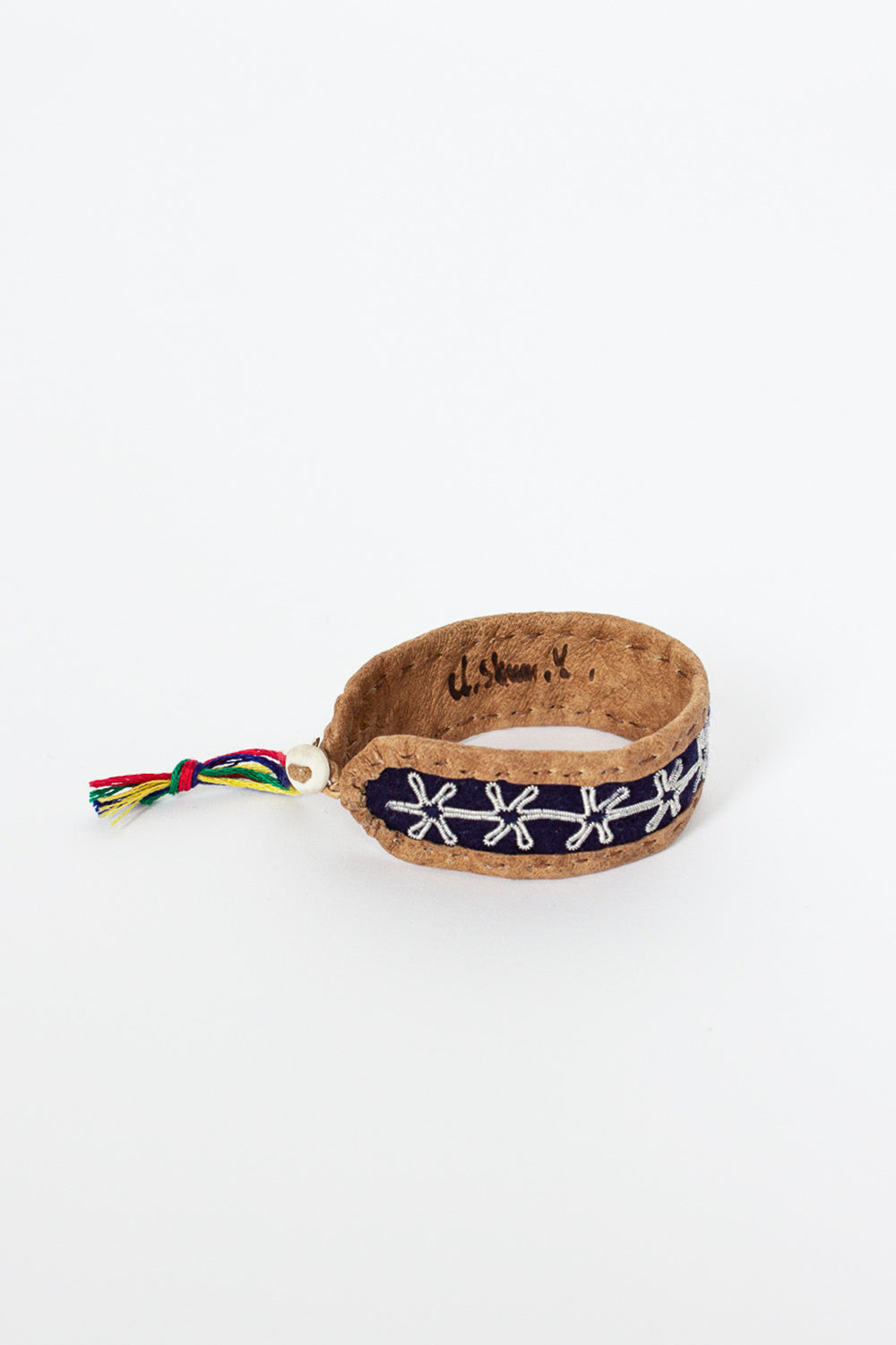 Maria Rudman Sami NM leather bracelet with navy felt insert. Reindeer hide with pewter embroidery, horn button and silver embossed tag. 100% leather, pewter, silver, cotton multi ribbons, antler. Made in Sweden. Each piece is unique and handmade and signed with delicacy and precision, the expression of a long tribal tradition.