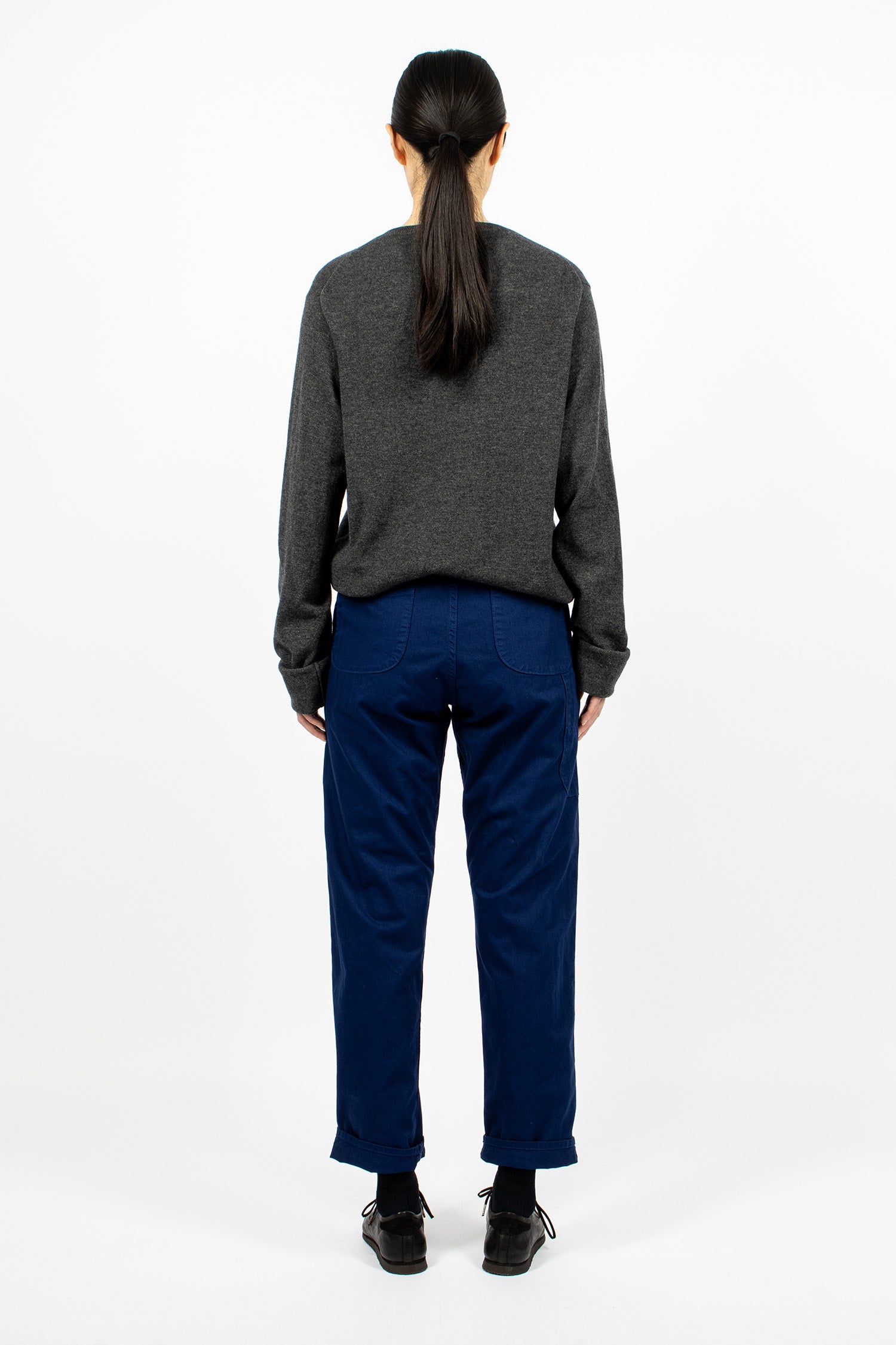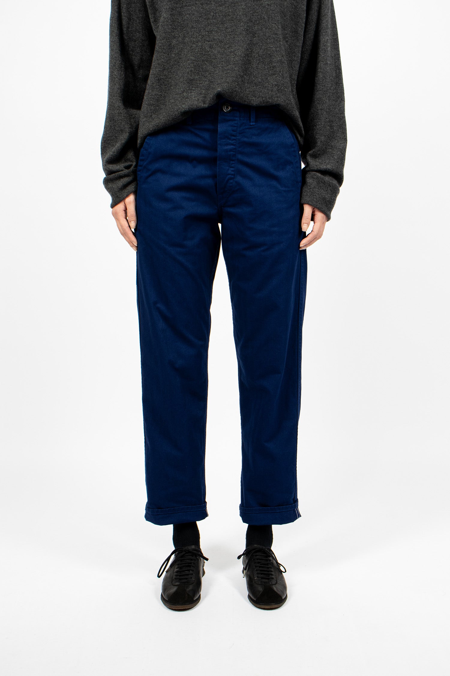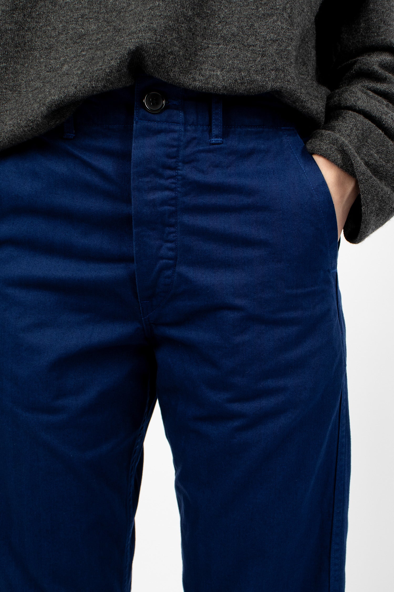 OrSlow slim French work pant in blue herringbone twill. Elasticated waist on the back with button front fastening. Belt loops. Tapered leg with side slant pockets and carpenter-style pockets.