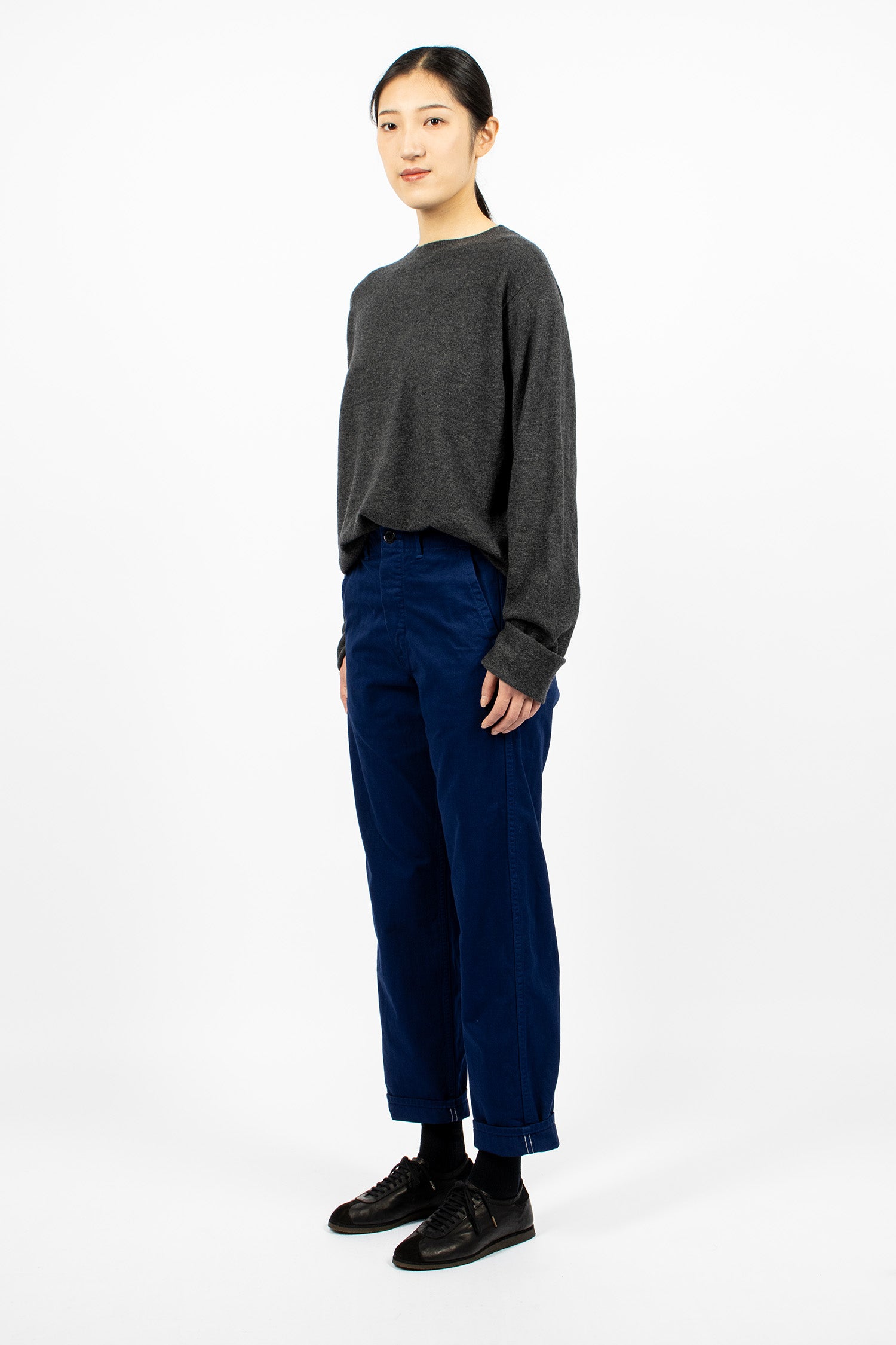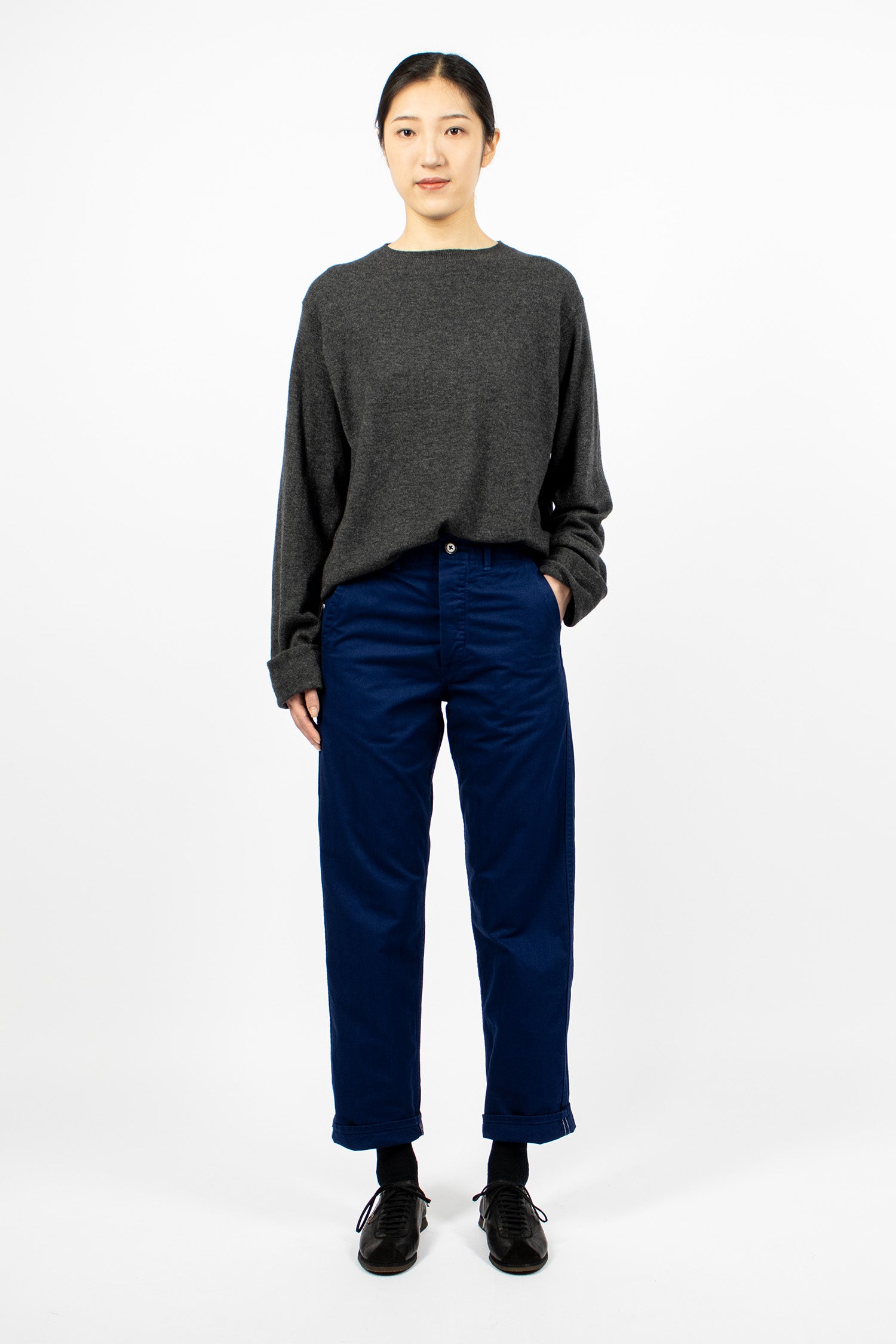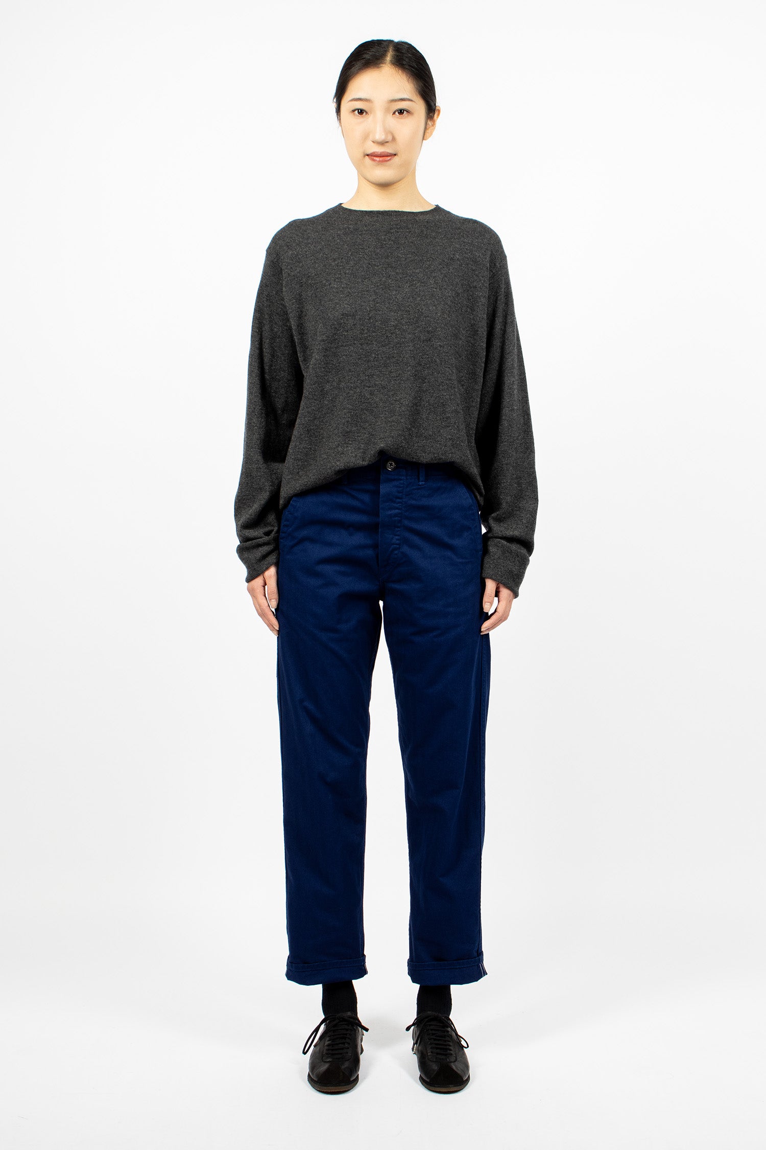 OrSlow slim French work pant in blue herringbone twill. Elasticated waist on the back with button front fastening. Belt loops. Tapered leg with side slant pockets and carpenter-style pockets.