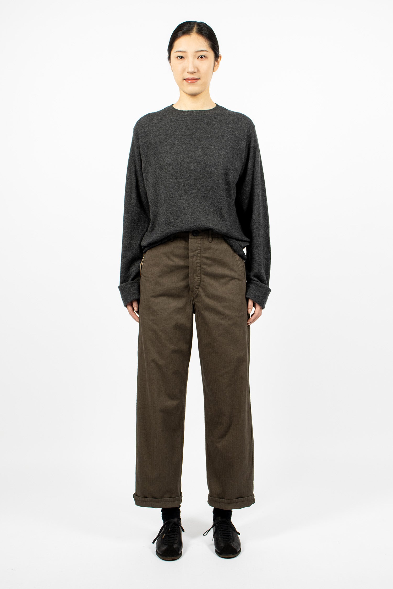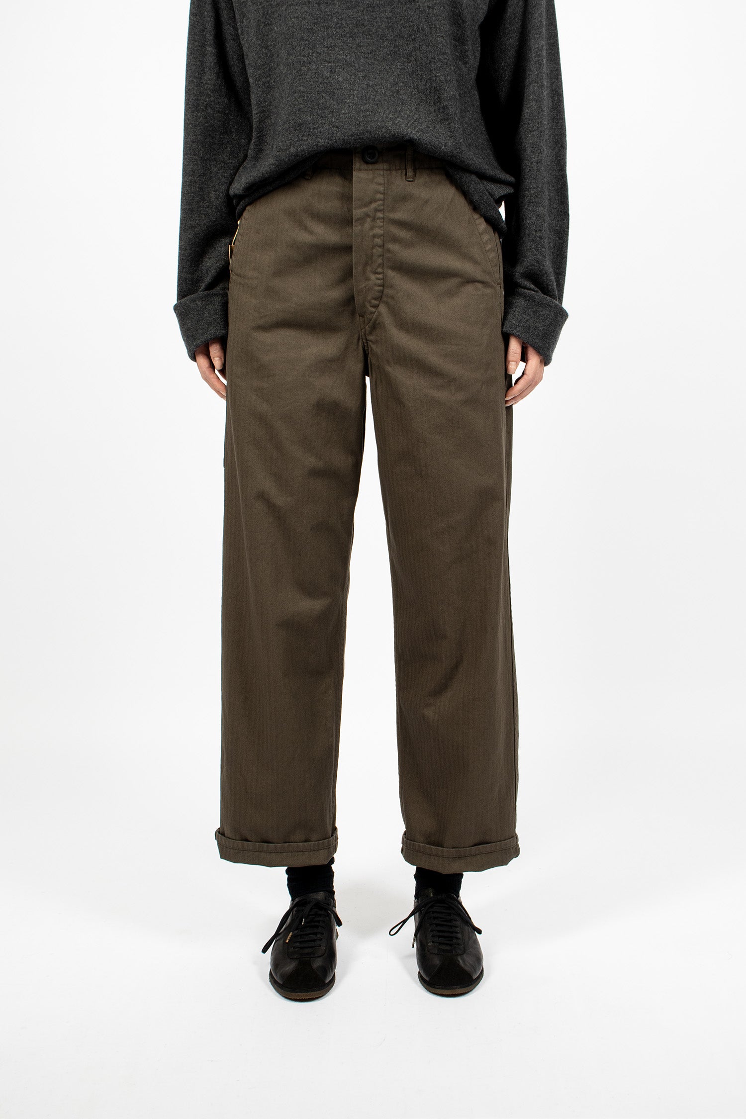 OrSlow French work pant in coffee brown herringbone twill. Elasticated waist on the back with button front fastening. Belt loops. Straight leg with side slant pockets and carpenter-style pockets.