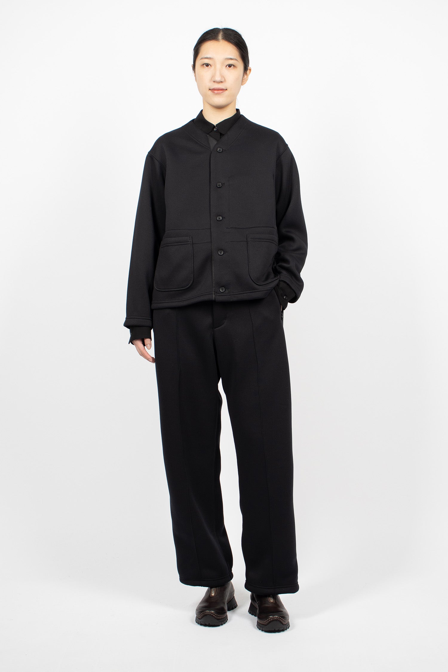 Engineered Garments knit cardigan in black polyester fleece. V-neckline, button front closure, dropped shoulder and long sleeves. Straight hem with patch pockets. Boxy, unisex fit.