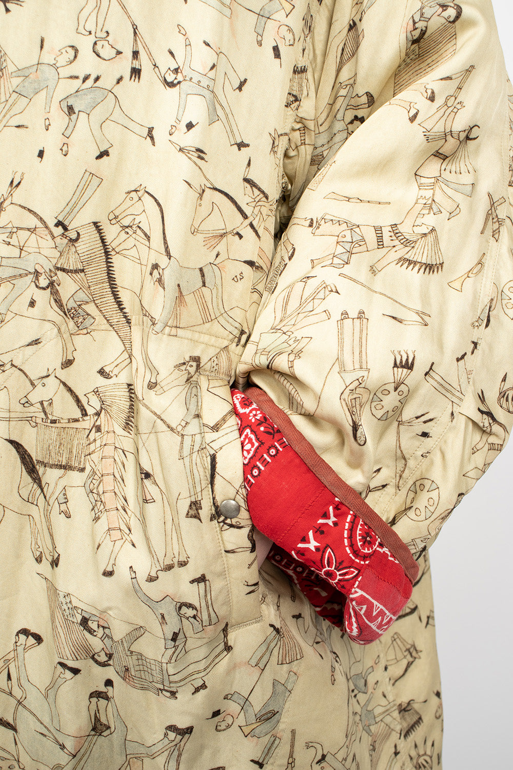 Visvim WMV reversible liner coat in bandana red. Patchwork coat made with vintage bandanas. Natural dye finish. Two-way Swiss Riri zipper. Poppers to adjust at cuff. Button openings to fasten as a liner for a coat. Banded hems. Side pockets with popper closure. Outer: 100% cotton, filling: 93% down, 7% feather. Dry clean only. Made in Japan.