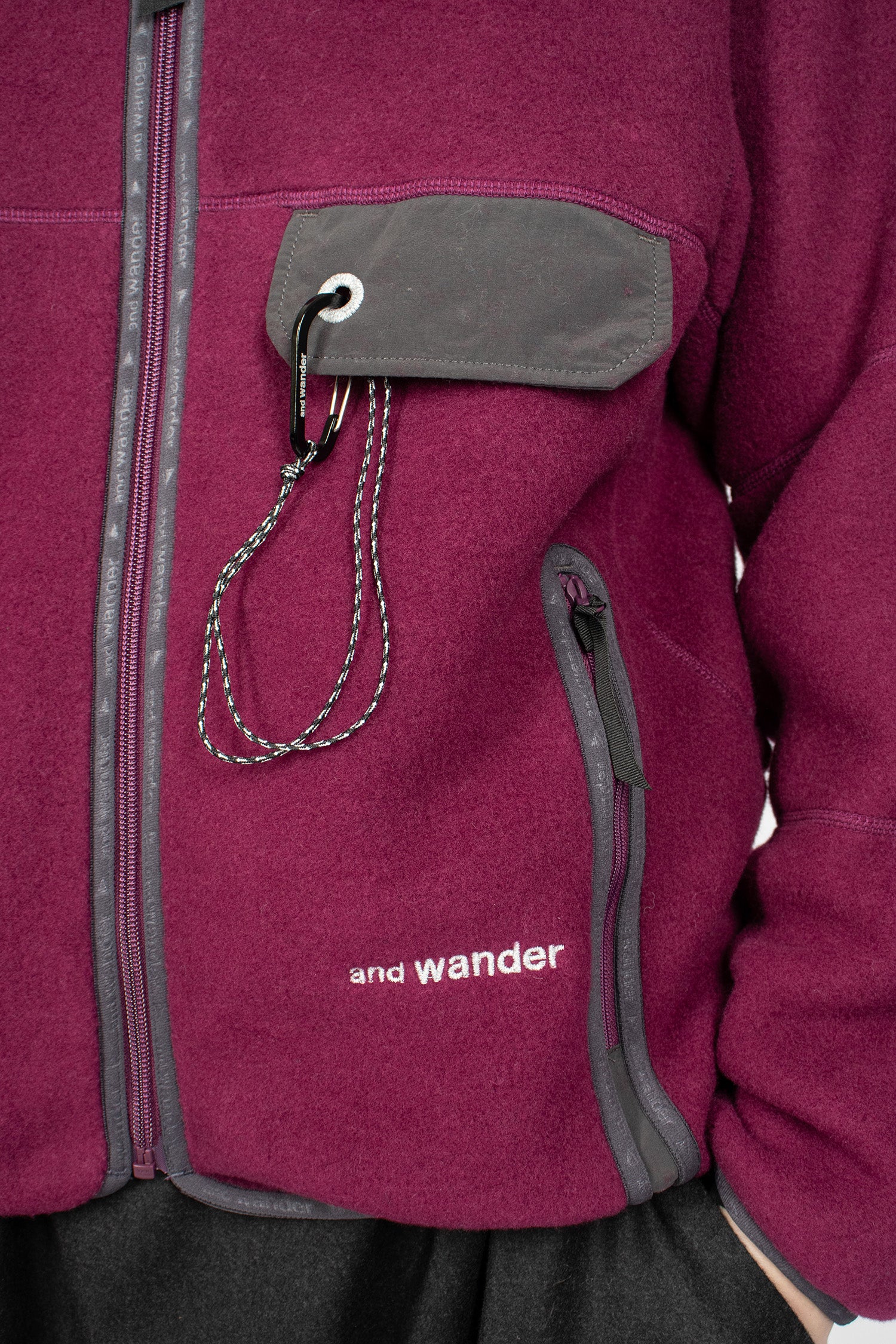 And Wander fleece cardigan in purple wool blend. V-neckline with zip front fastening, dropped shoulder, long sleeve, and wander tape trims. Chest flap pocket with reflective toggle and carabiner, embroidered and Wander logo and side zip pockets.