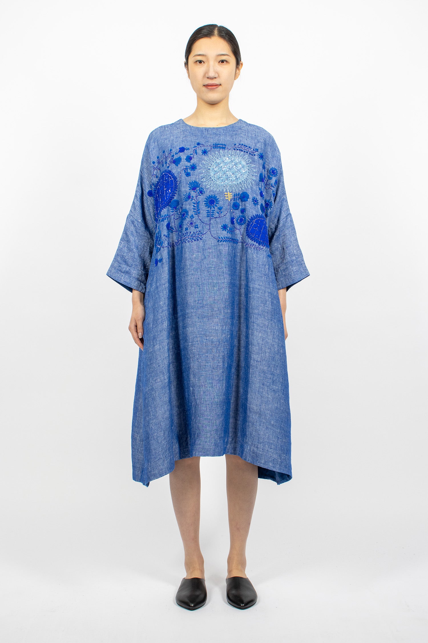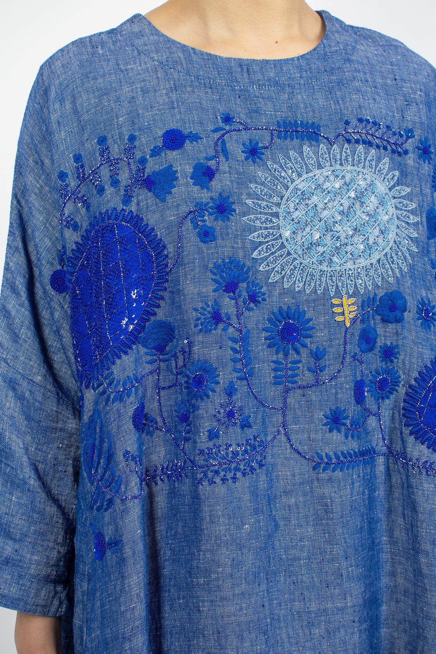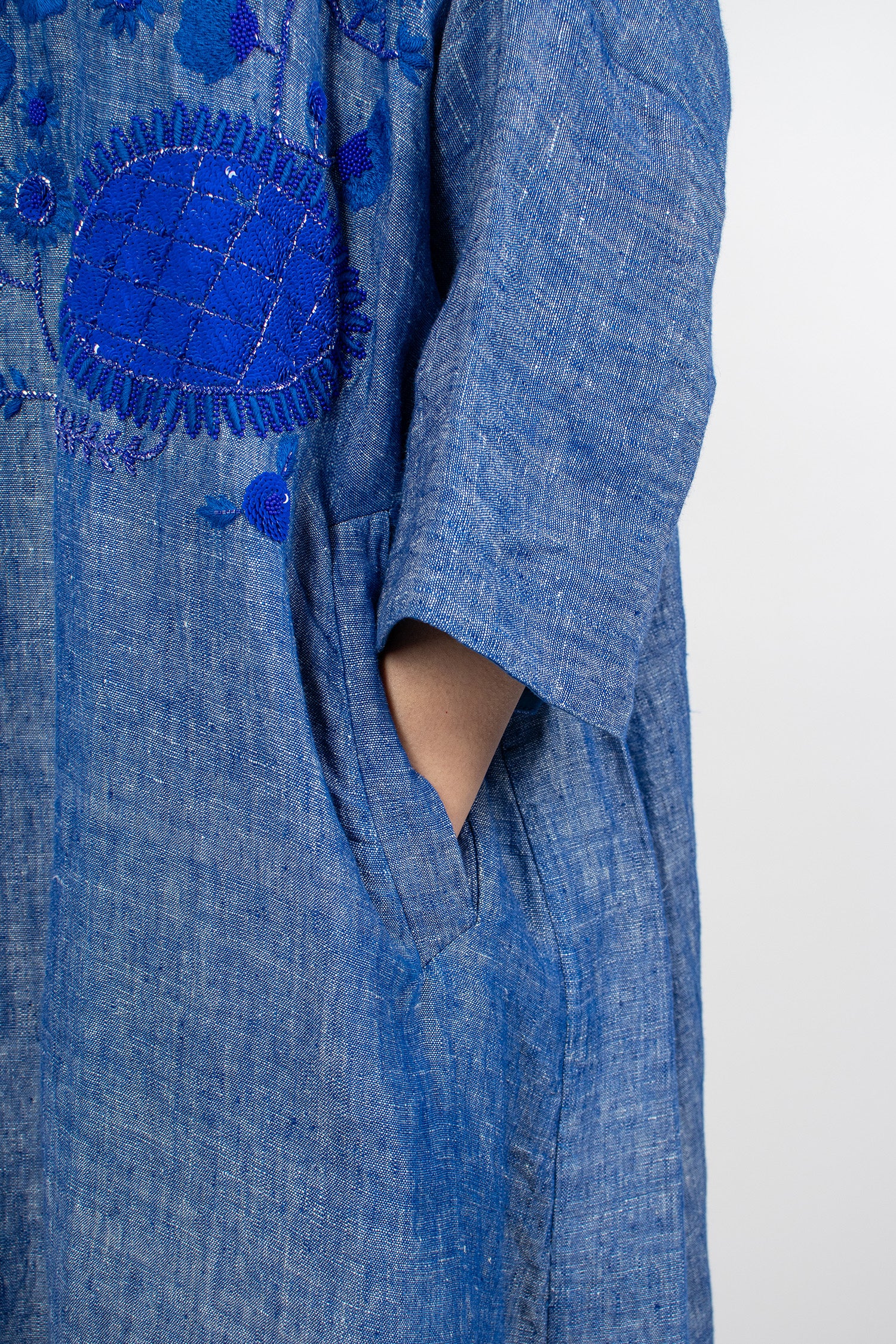 AODRESS embroidered dress in light lapis linen. Crew neckline with keyhole button back fastening, dropped shoulder, bracelet length sleeve with side split. Resin and sequins beaded with embroidered flowers on the front. Side slant pockets. Relaxed fit, fully lined.