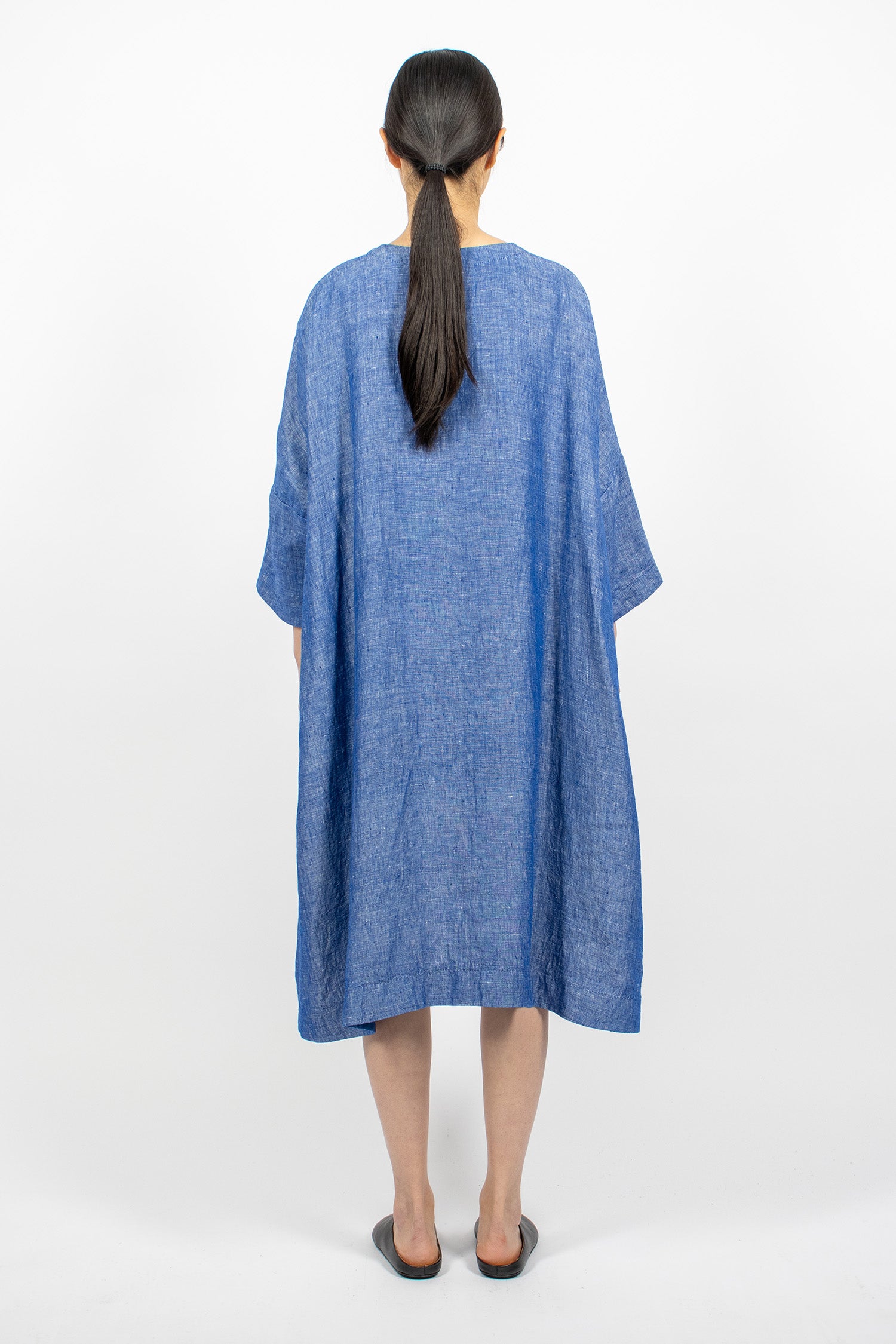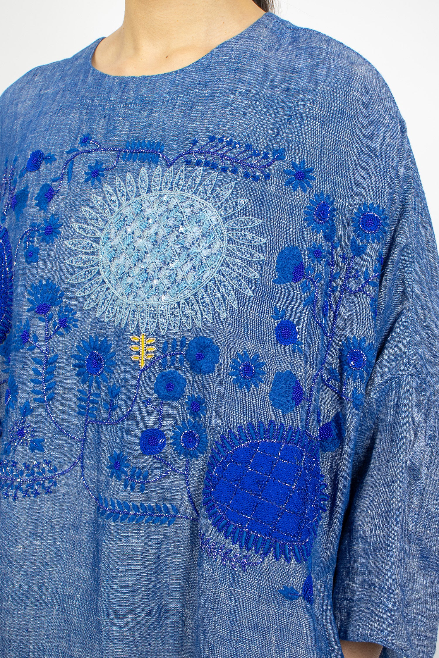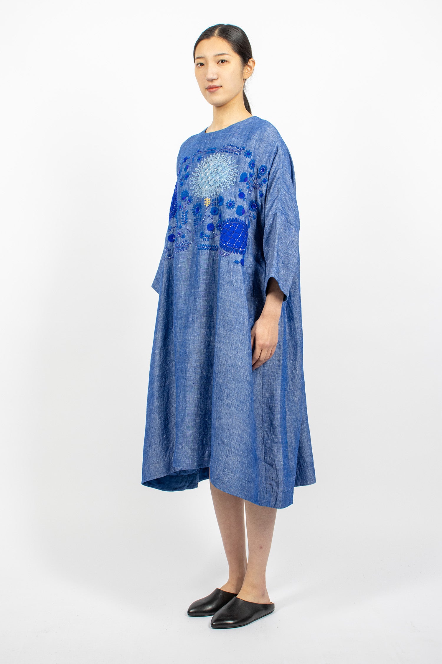 AODRESS embroidered dress in light lapis linen. Crew neckline with keyhole button back fastening, dropped shoulder, bracelet length sleeve with side split. Resin and sequins beaded with embroidered flowers on the front. Side slant pockets. Relaxed fit, fully lined.