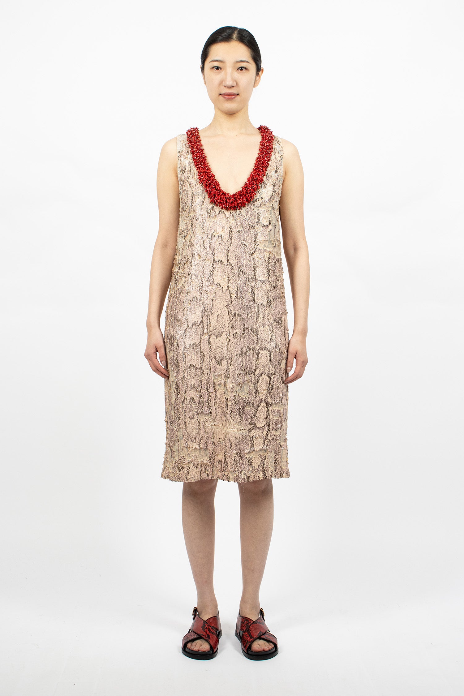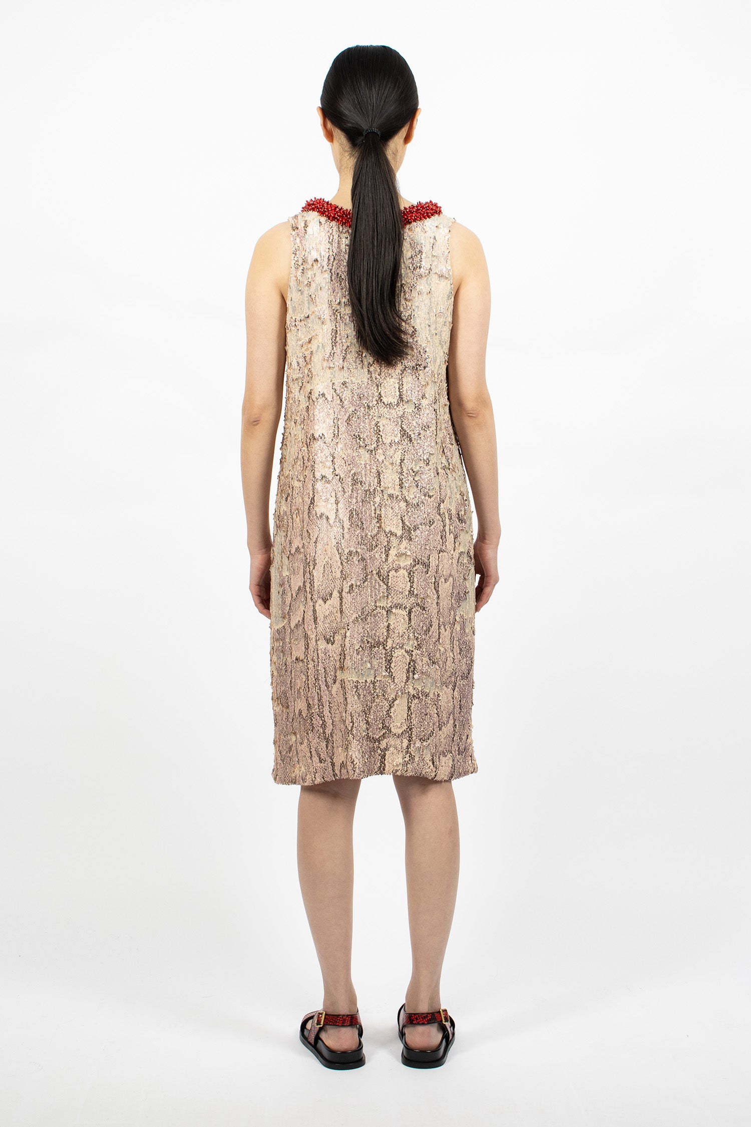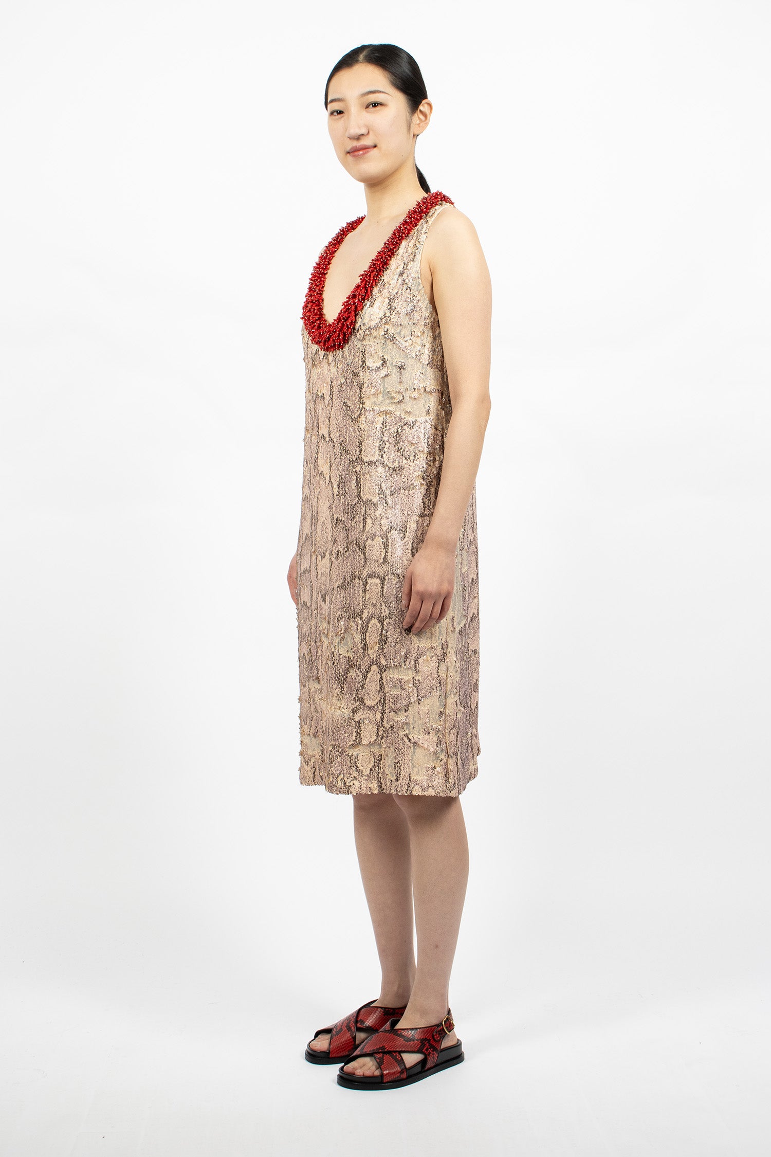 Dries Van Noten embellished dress in lilac. Pullover dress with deep scooped neckline with beaded finish, sleeveless, knee length. Snake print sequined motif.