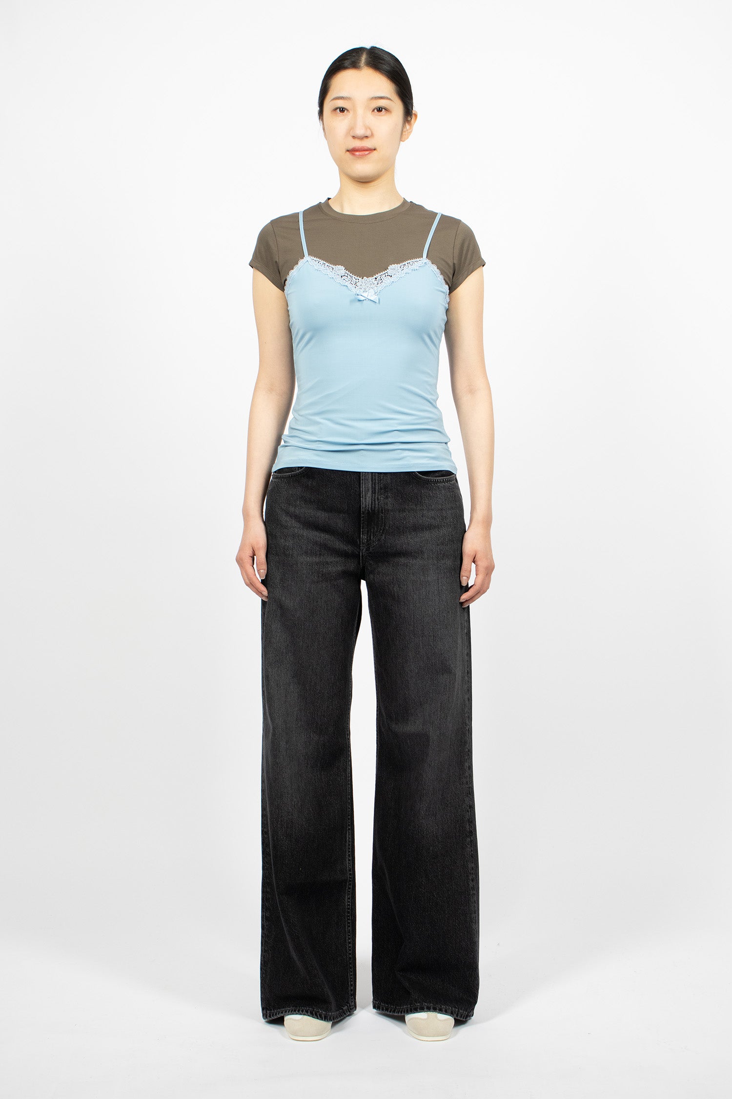 Acne Studios fitted t-shirt in grey and blue fluid jersey. Ribbed crew neckline and short sleeves. Layered construction with a t-shirt underlayer and slip overlayer detailed with a bow and lace trims. Fitted.