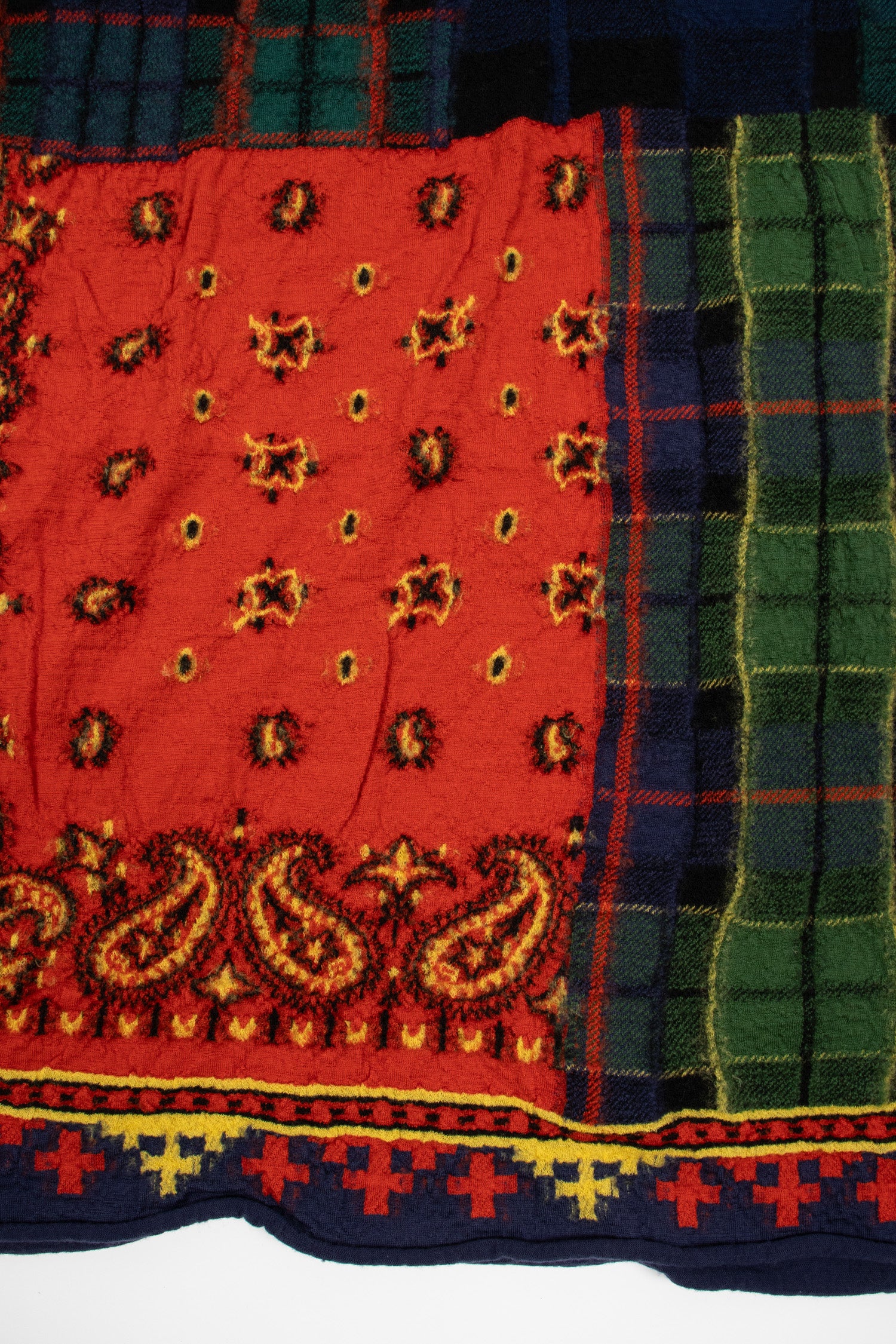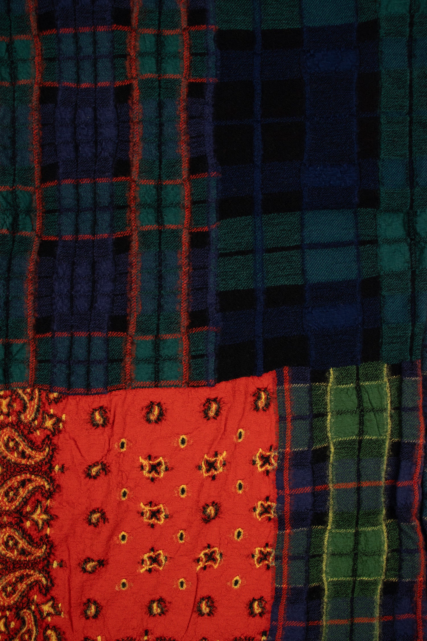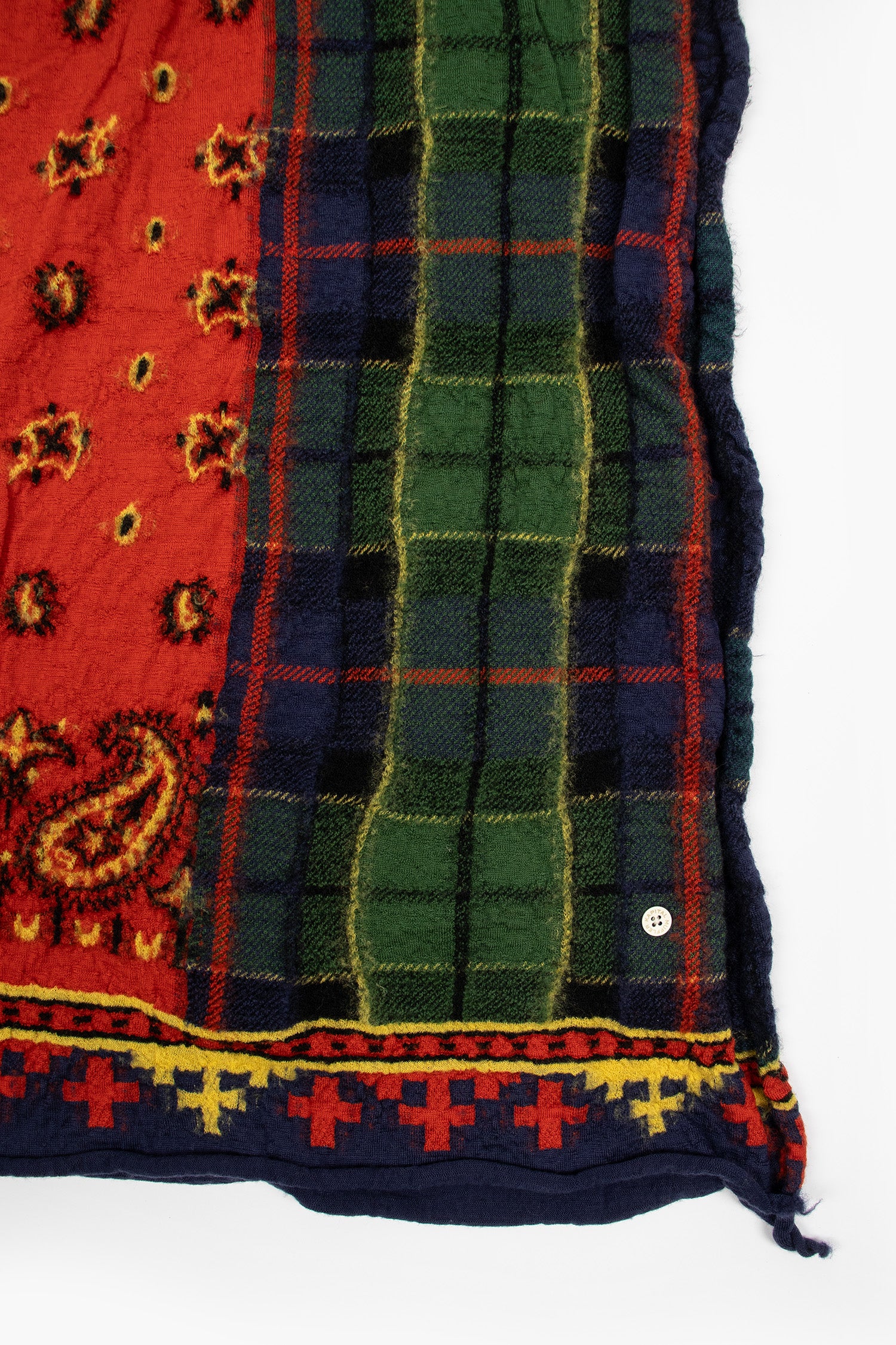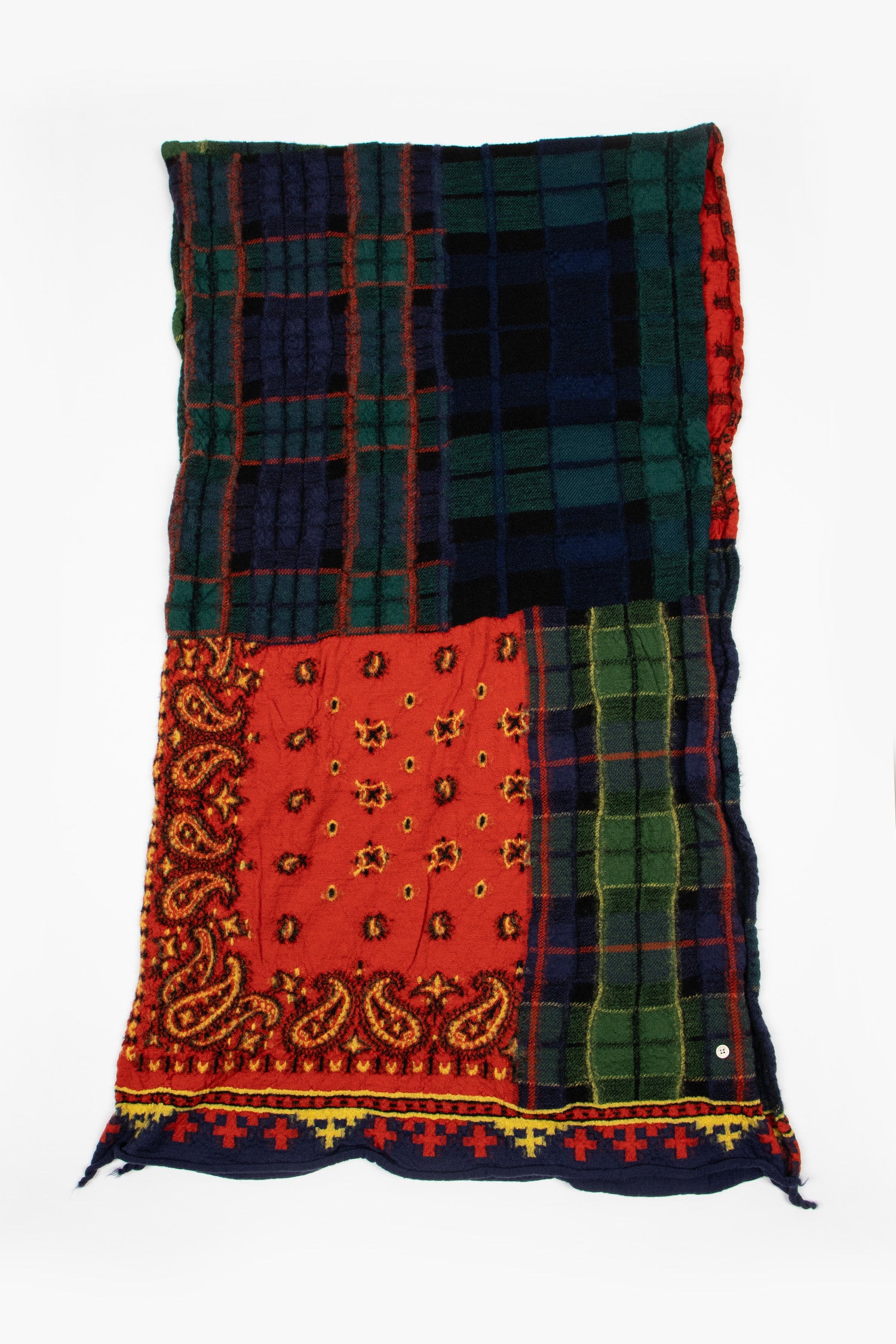 Kapital tartan patchwork scarf in black watch and red paisley wool. Full length rectangular shape with rolled hem and Kapital custom button.