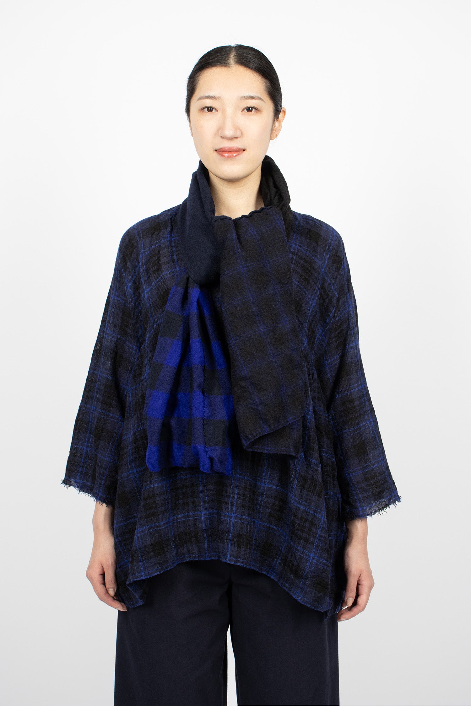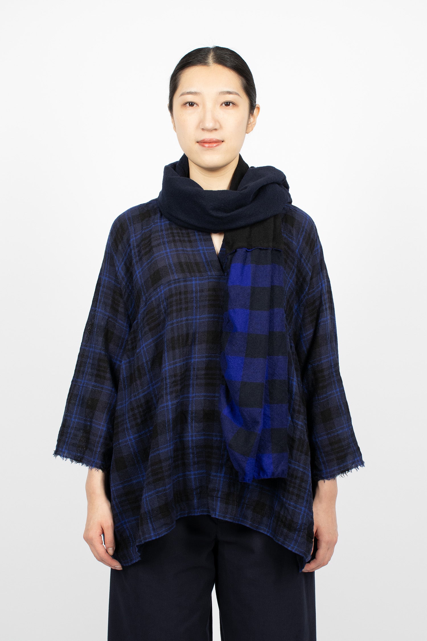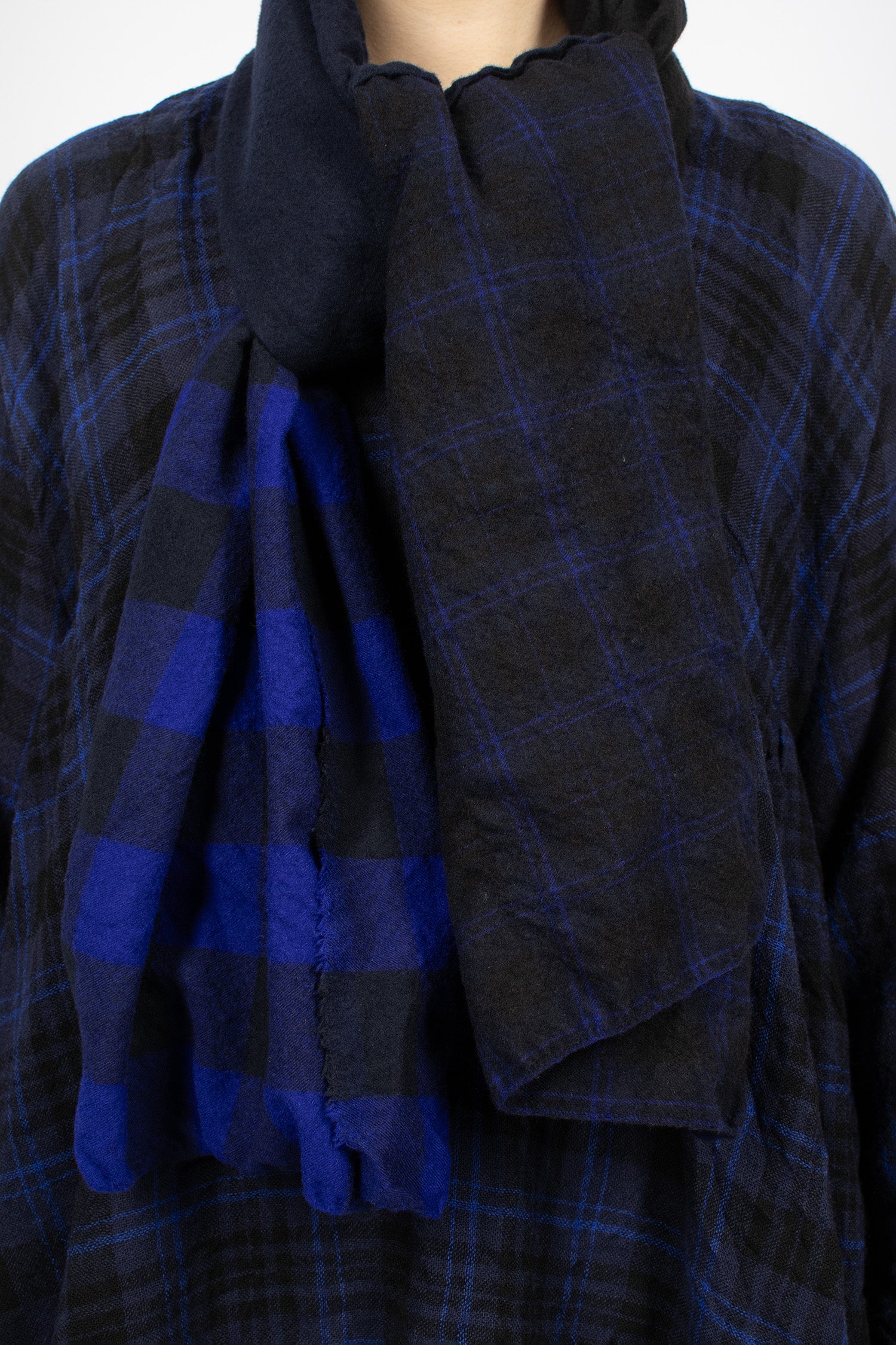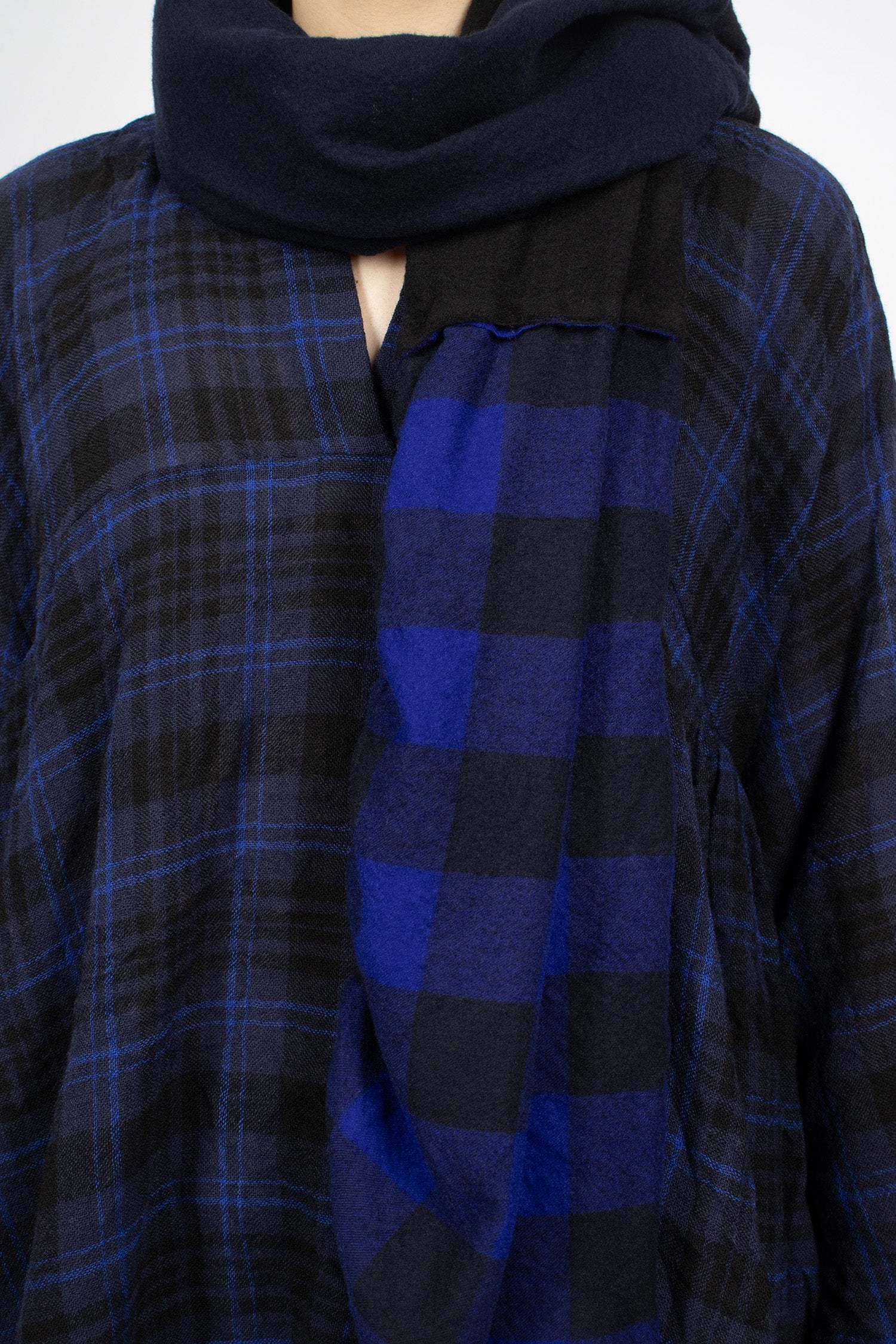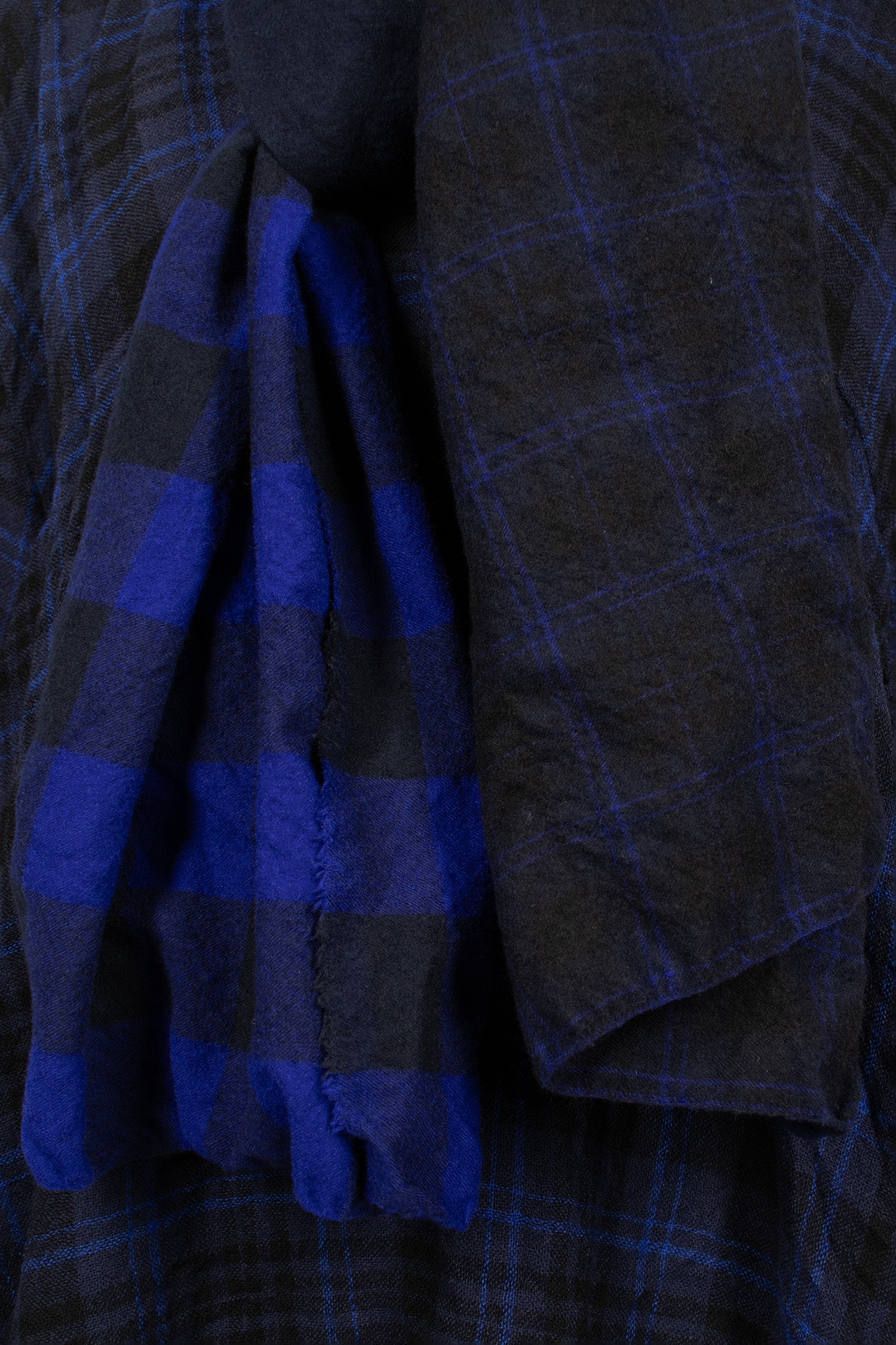 Daniela Gregis soft wool shawl in navy, black, check and tartan patchwork. Raw cut edges. Garment washed.